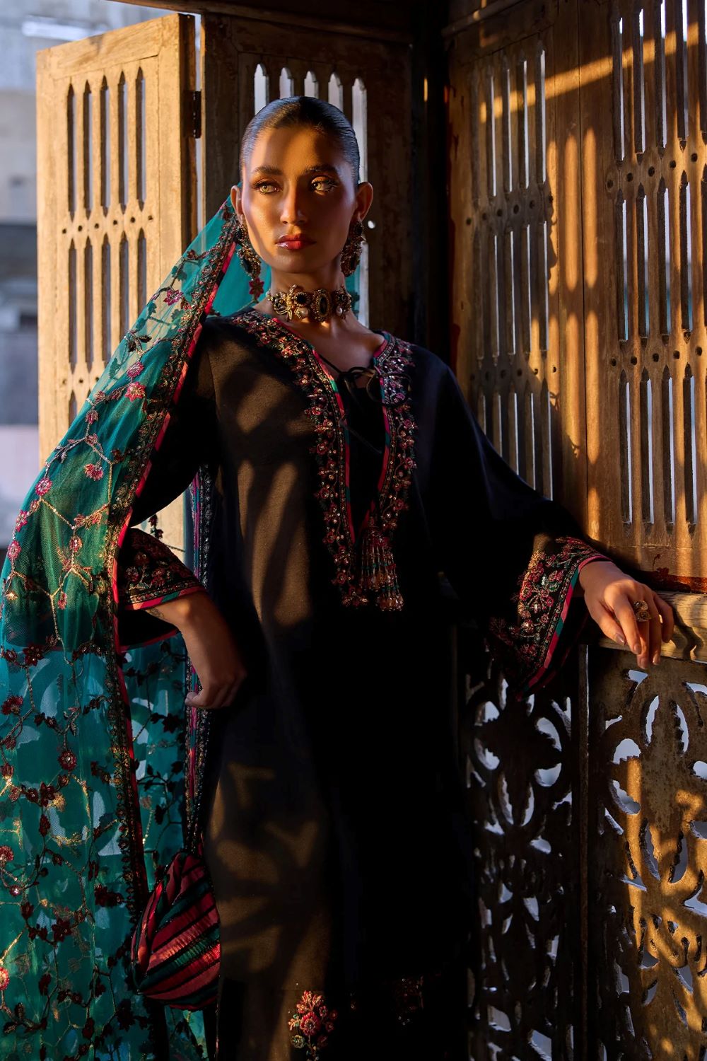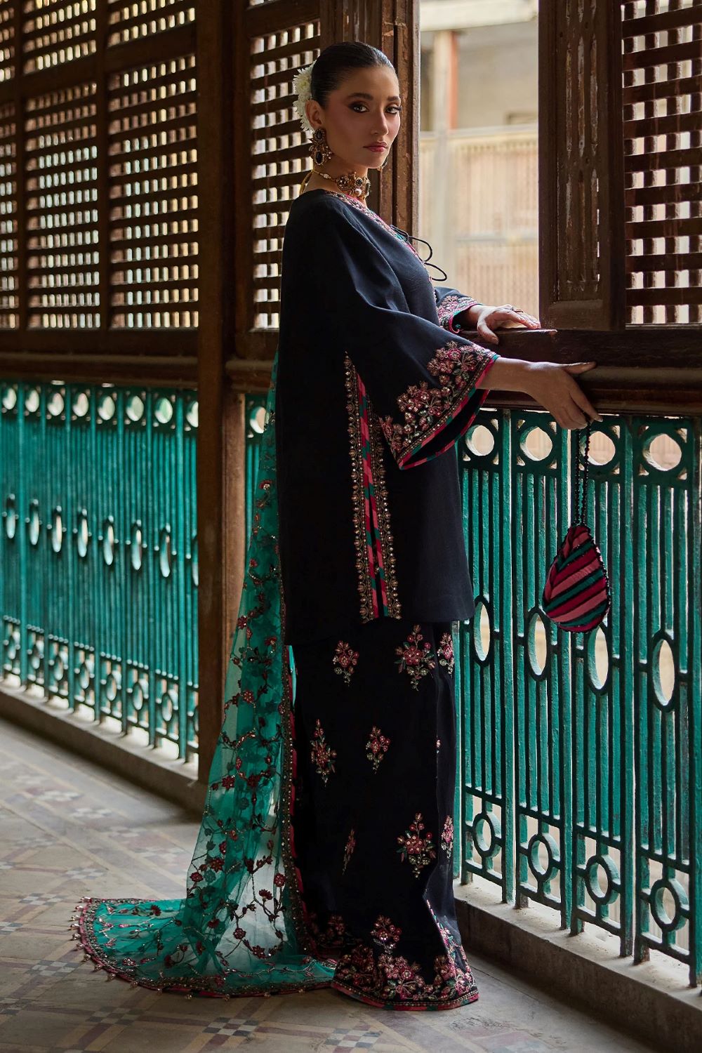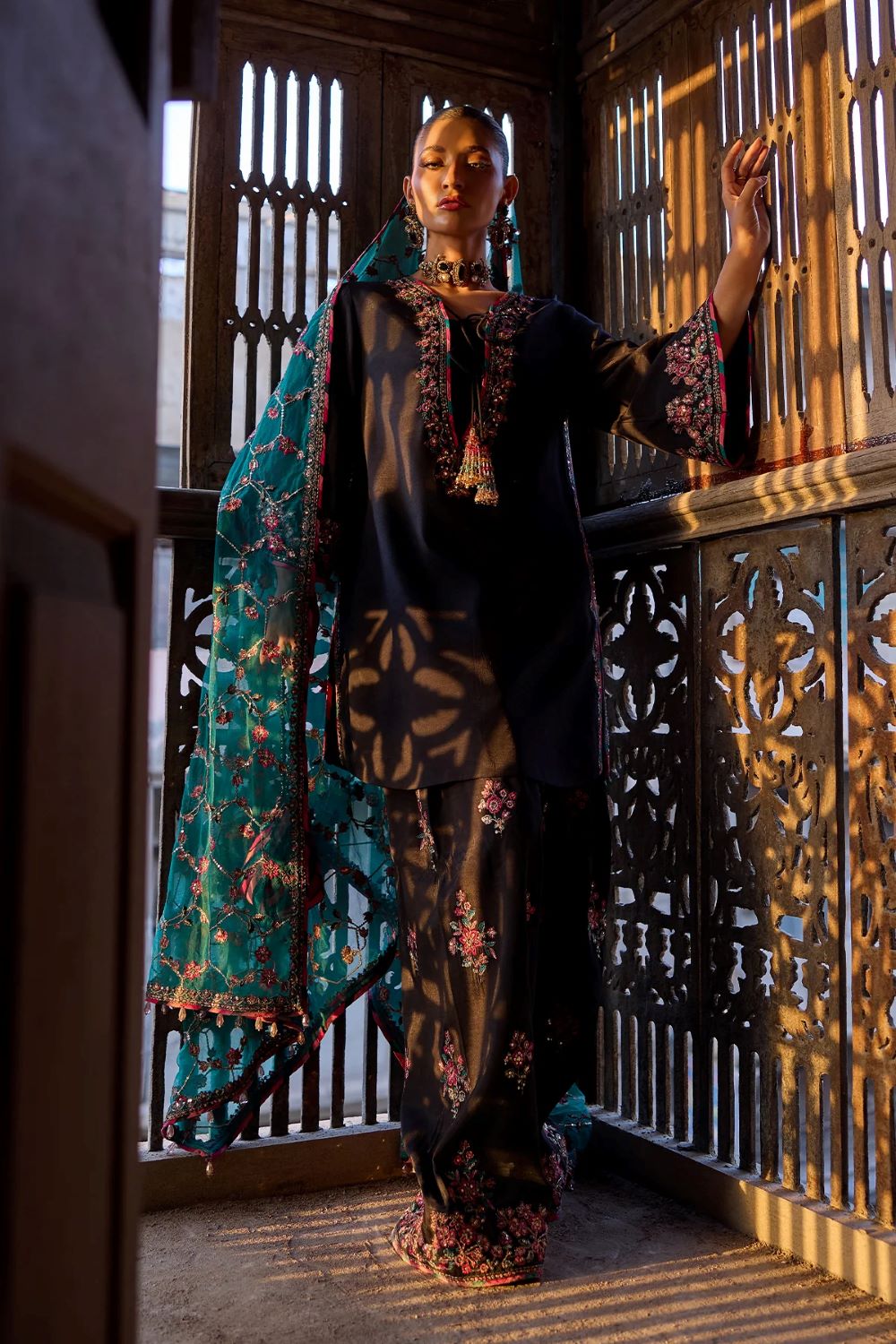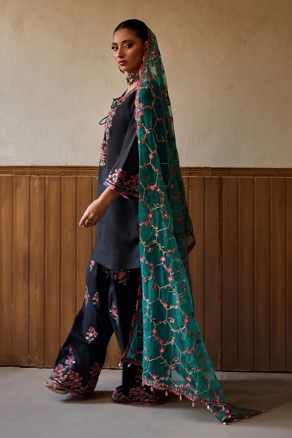 Paired with a matching black shalwaar, adorned with scattered embroidered motifs and completed with a detailed embroidered hem border.