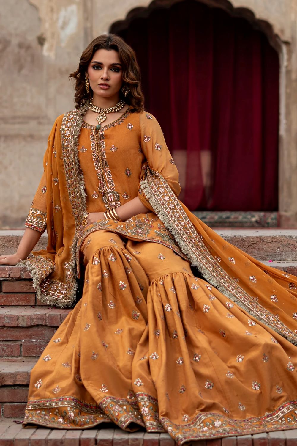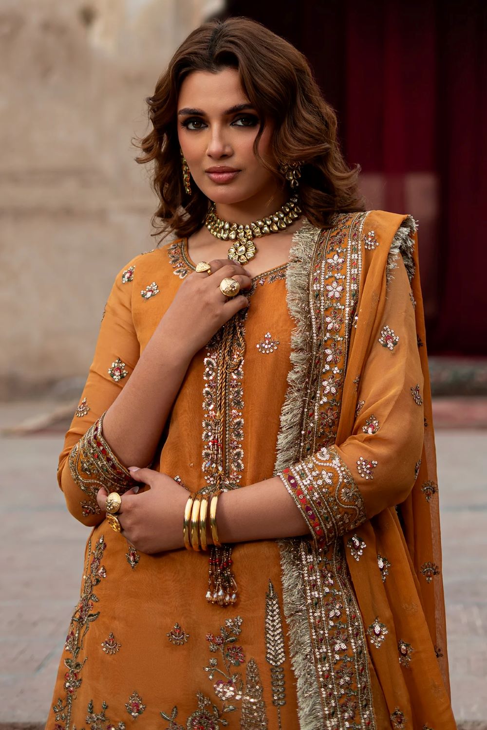 Raw silk shirt paired with a matching raw silk shalwar, crafted in a rich festive palette. The shirt features an all over geometrical sequin and tilla embroidered pattern, enhanced with multicolor resham embroidery on the neckline, sides, hem and sleeves. It is designed with a keyhole neckline, finished with crystal tassels hanging from the opening for a statement detail. The coordinating raw silk shalwar is finished with a sequin and tilla pattern and a multicolor resham embroidered border. The ensemble is completed with a sheer net dupatta, detailed with a sequin and tilla border and multicolor resham embroidery along with all over dense sequin and tilla spray adding an elegant and vibrant finish.
