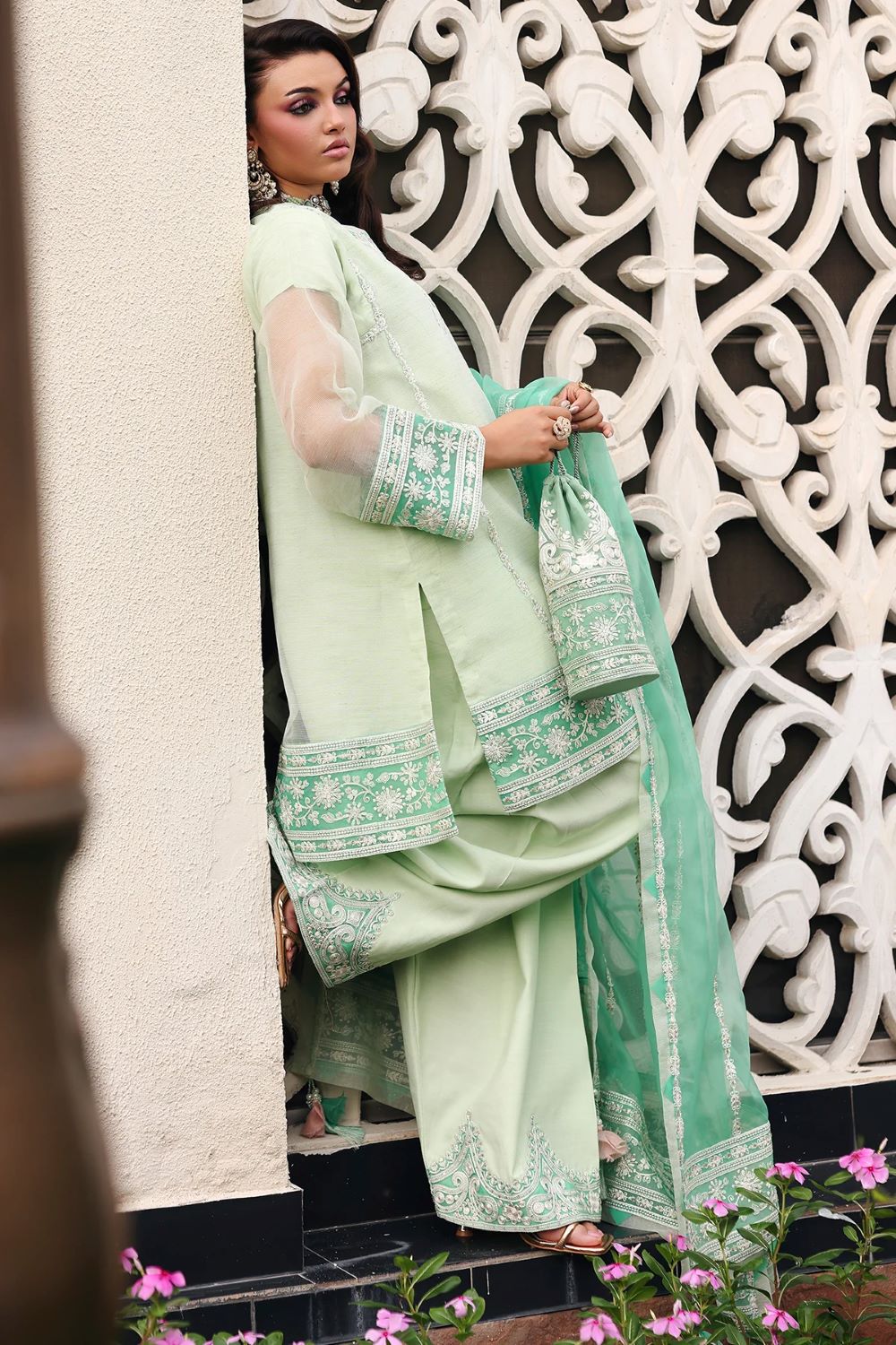 Embroidered mint green shirt paired with matching wide-leg trousers, both finished with delicate embroidered borders for a graceful festive look, along with an intricately embroidered neckline and sleeve cuffs. The ensemble is completed with an organza dupatta featuring subtle embroidered detailing, adding a soft, elegant finish to the silhouette.