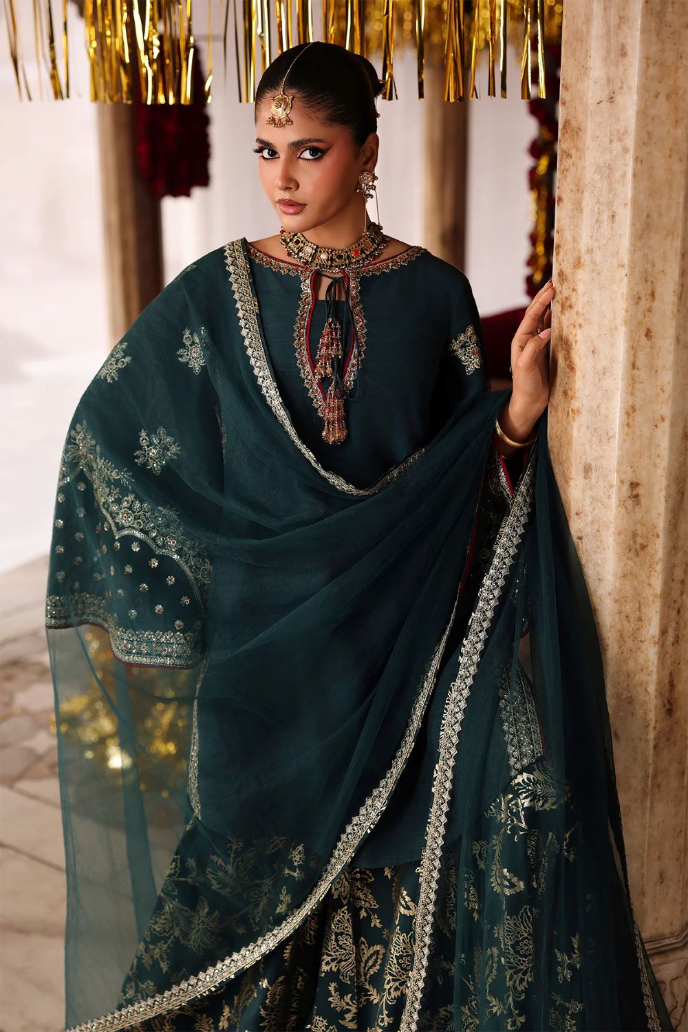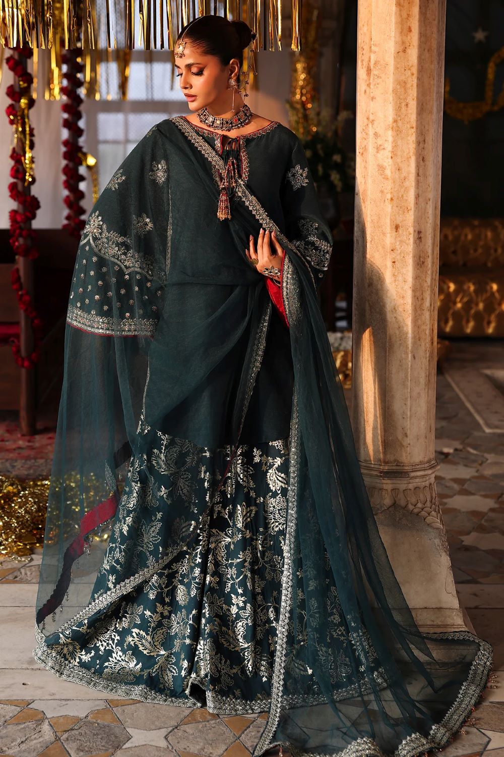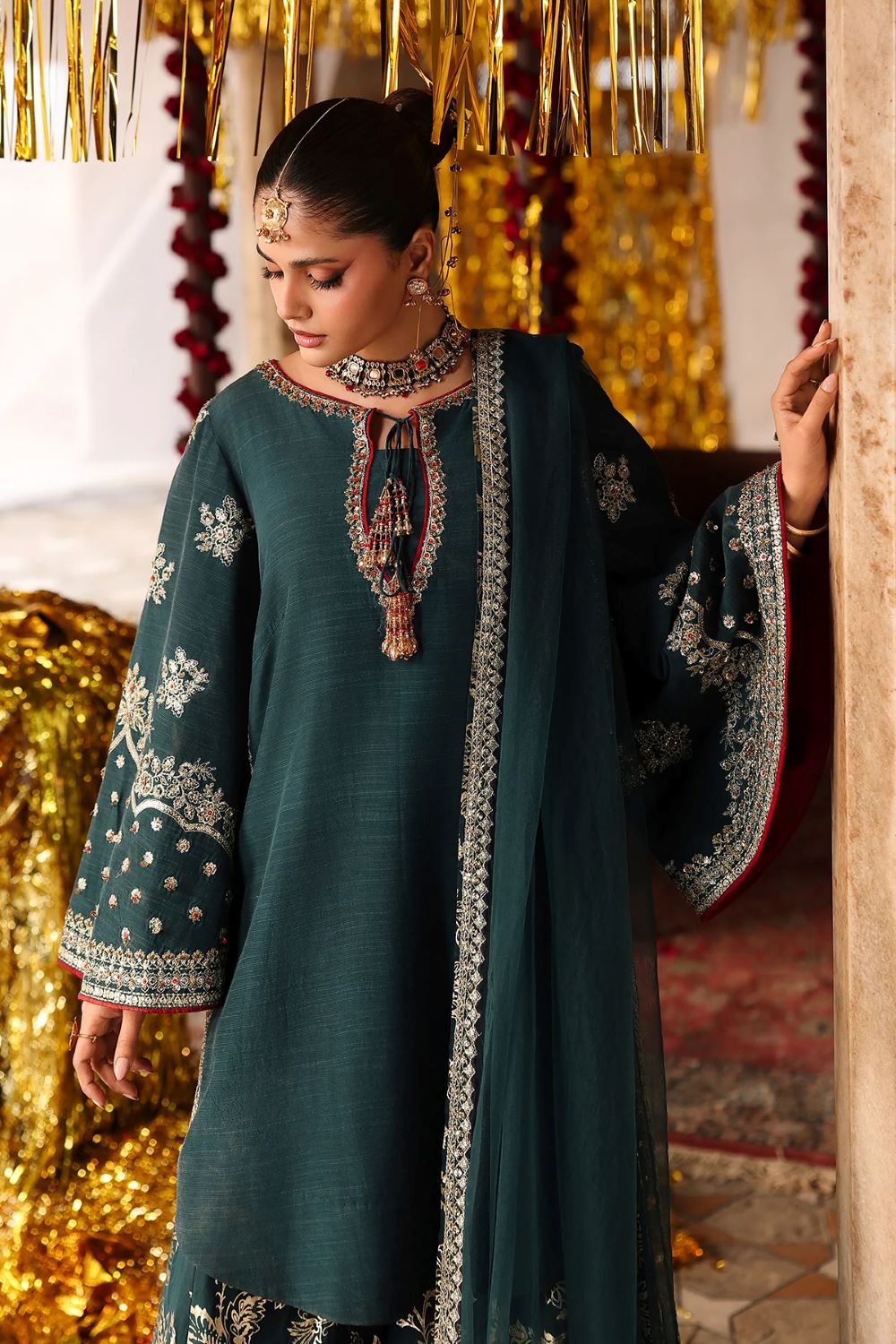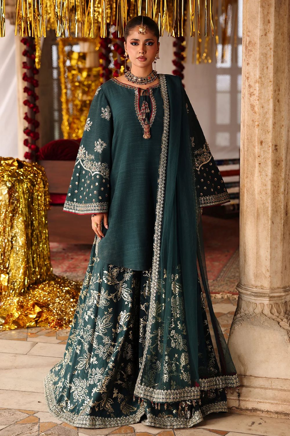 Shirt raw silk with foil printed with trouser raw silk with dupatta poly net