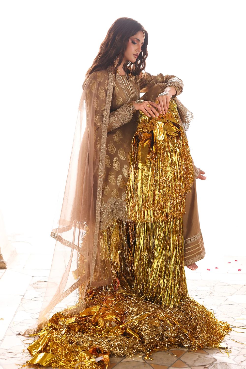 Shirt raw silk with foil printed with poly net dupatta with trouser raw silk