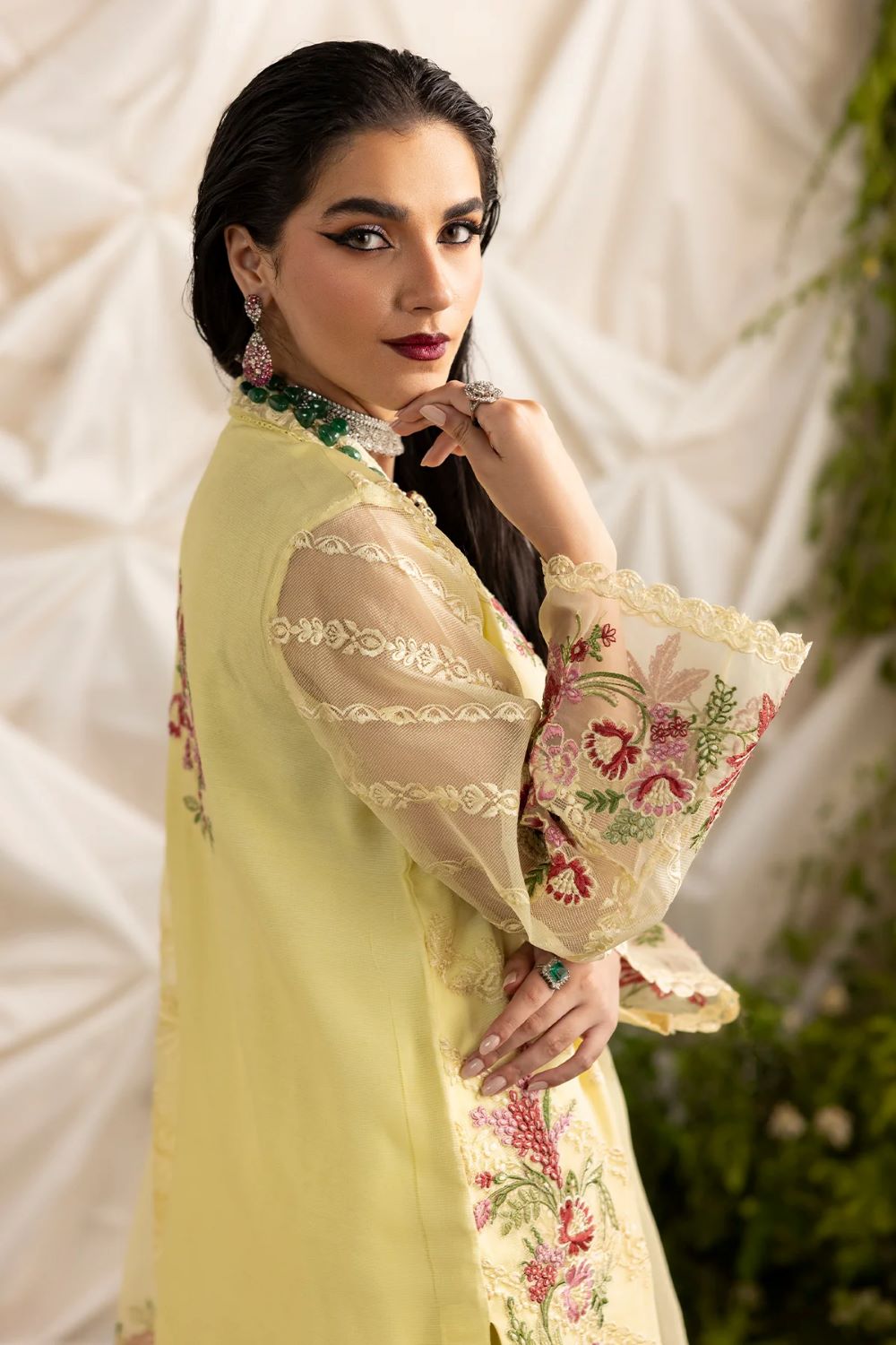 A luminous lemon yellow ensemble crafted in a cotton net shirt delicately lined with silk, beautifully adorned with intricate multicolour floral embroidery and refined lace detailing along the neckline, borders, and hem. Paired with a beautiful dupatta, finished with scalloped lace edges and embroidered botanical motifs for an airy, beautiful drape. The look is completed with a flowing silk A-line trouser, adding elegance, structure, and graceful movement to the silhouette.