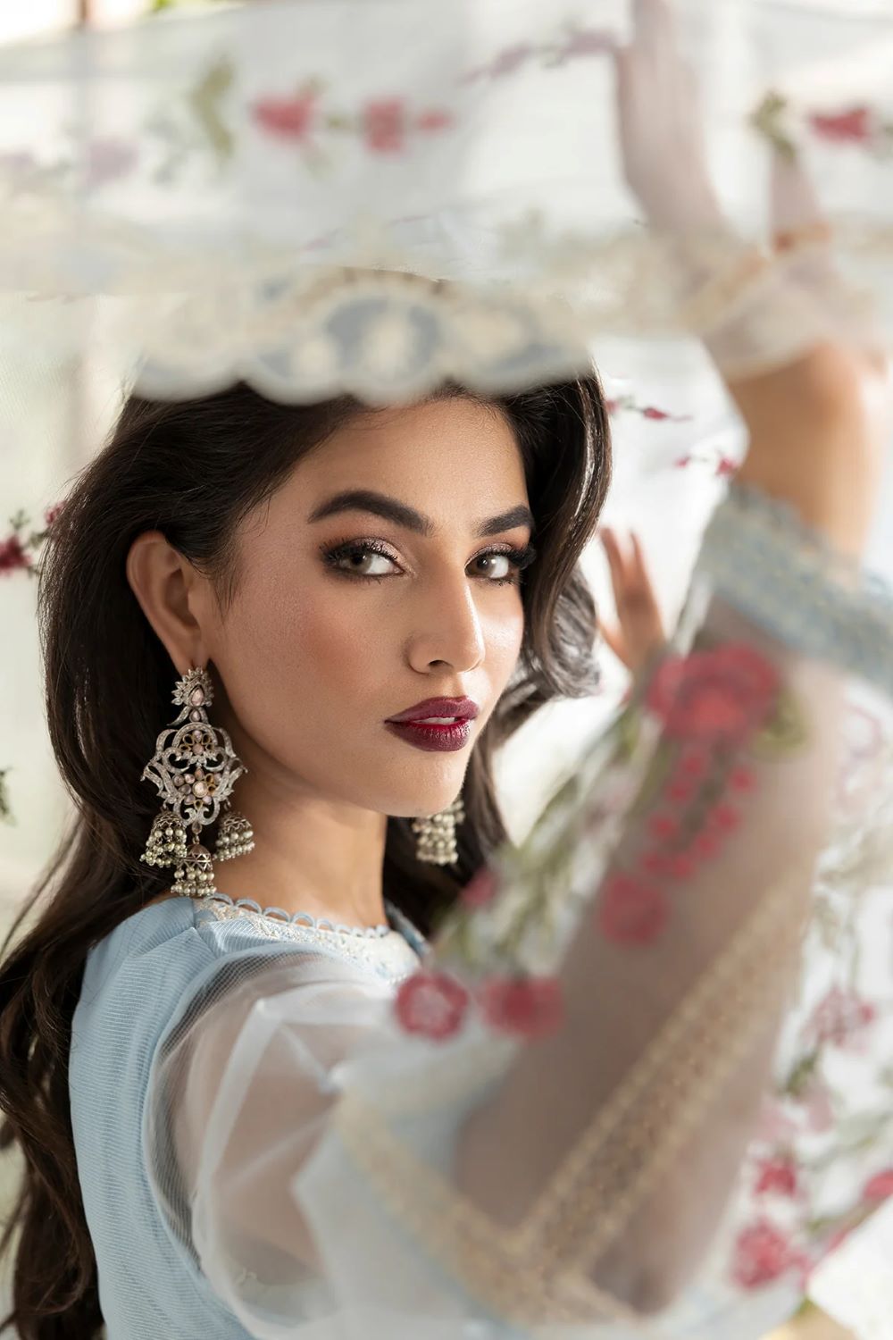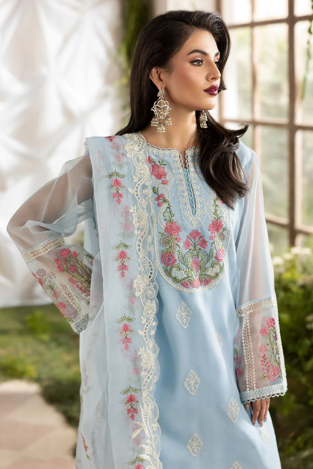 A serene powder blue ensemble crafted in a cotton net shirt delicately lined with silk, beautifully adorned with intricate pastel floral embroidery and fine lace detailing along the neckline, sleeves, borders, and hem for a soft finish. Paired with a flowing dupatta, enriched with embroidered floral motifs and scalloped lace edging, creating an airy and graceful drape. The look is completed with a refined silk shalwar with embroidery, adding fluidity, structure, and elegant movement to the silhouette.