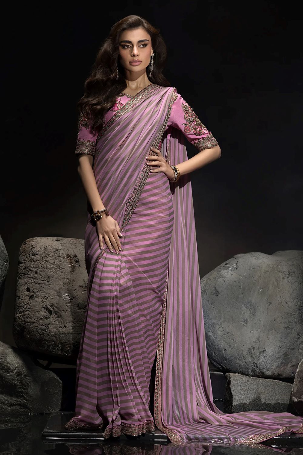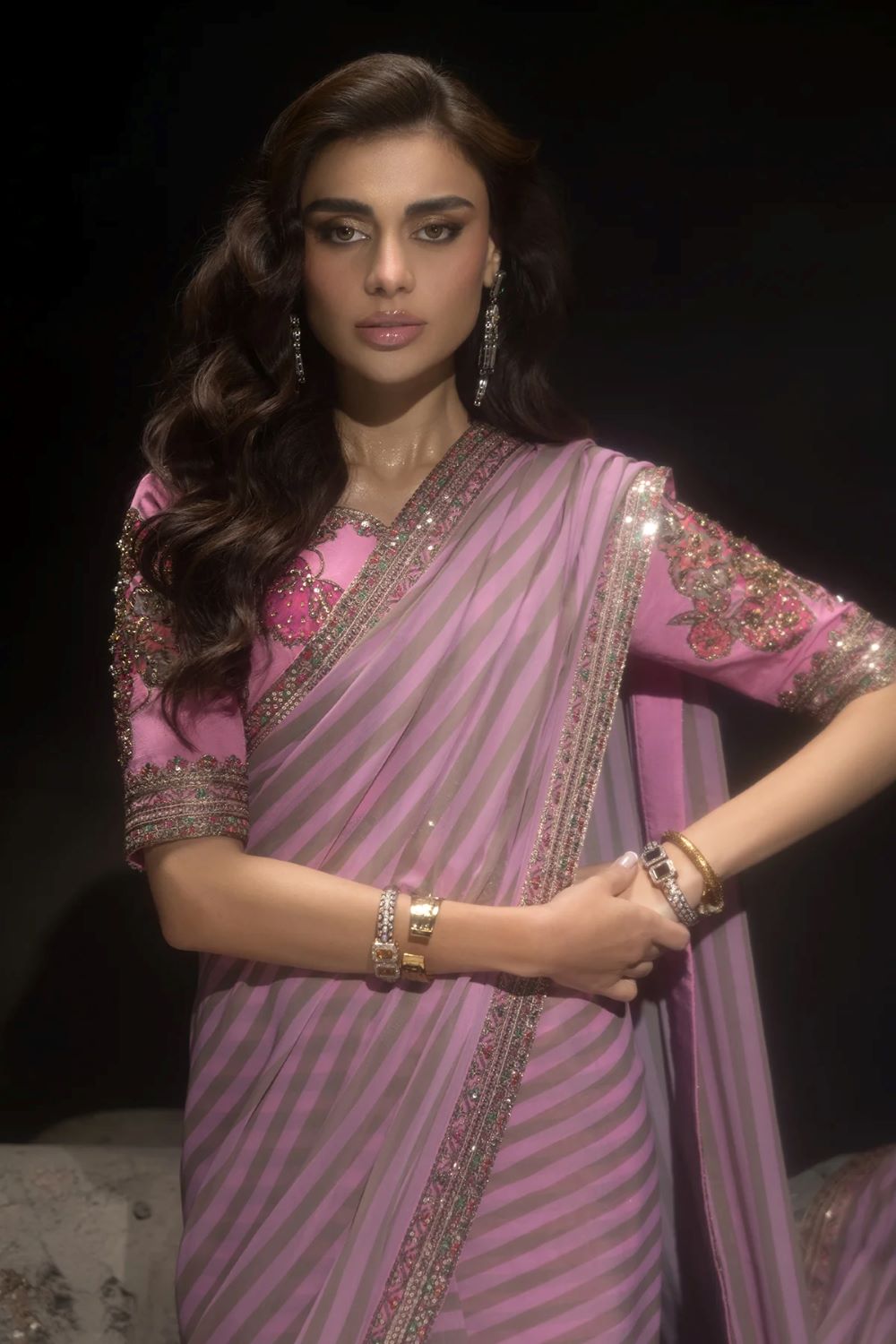 A bold yet elegant saree crafted in printed chiffon featuring stripes pattern that create a fluid, elongated silhouette. It is paired with a raw silk blouse adorned with intricate hand embellishment and printed floral patches, adding richness and artisanal detail to the look. Saree is finished with a detailed sequin and resham embroidered border accompanied by a matching petticoat, this ensemble blends classic craftsmanship with contemporary statement styling, perfect for festive and evening wear.