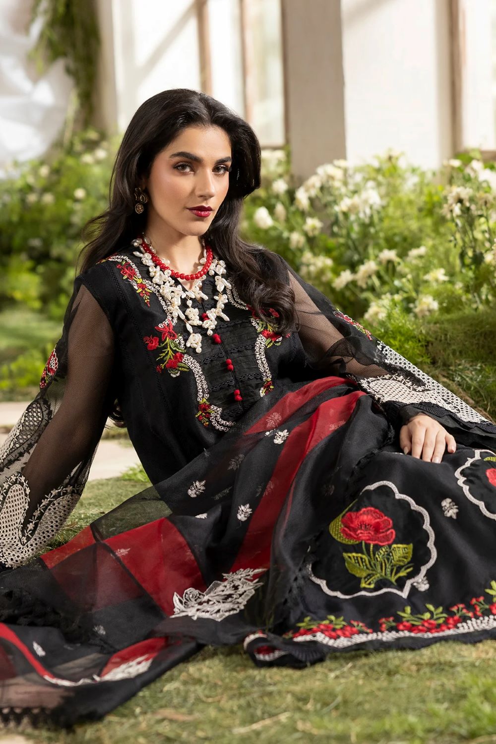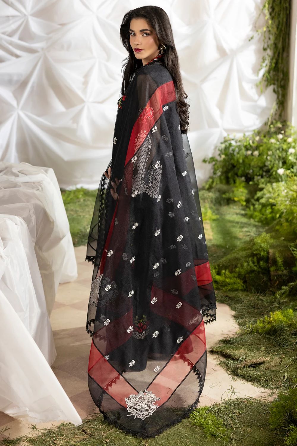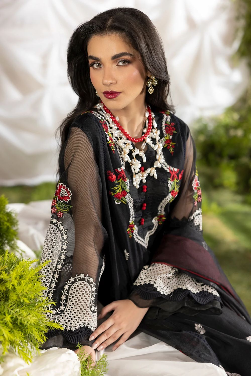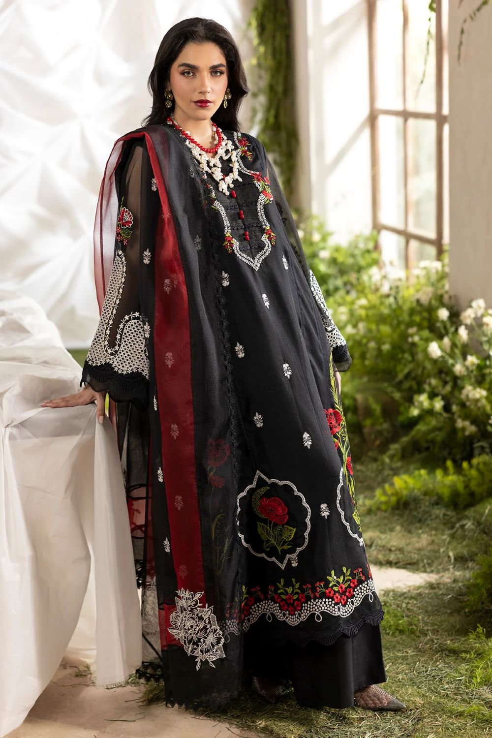 Article that ensemble featuring a cotton net shirt adorned with intricate ivory floral embroidery and delicate lace detailing along the neckline, hem, and borders, creating a refined and feminine silhouette. Paired with a sheer dupatta, finished with elegant scalloped lace edging for a graceful, flowy drape. The look is completed with a silk shalwar, detailed with subtle embroidered motifs and lace accents at the hem, adding richness and fluid movement to the overall look.