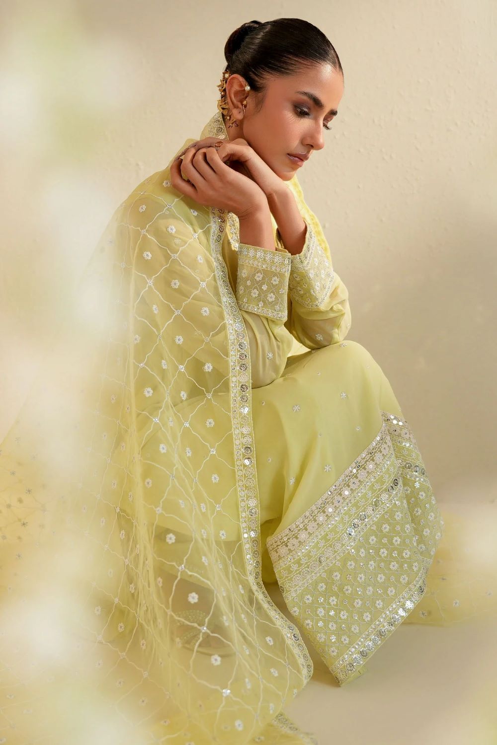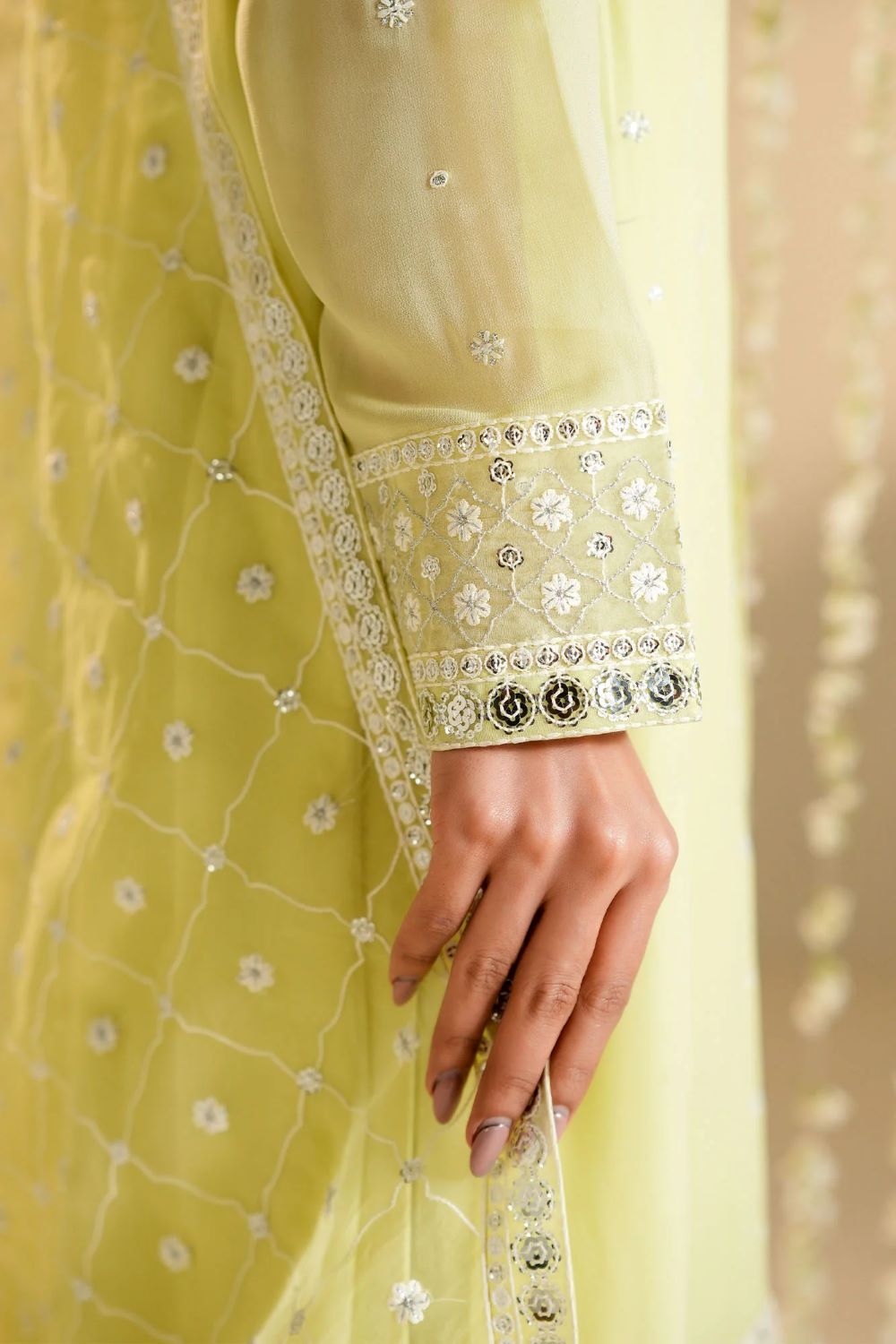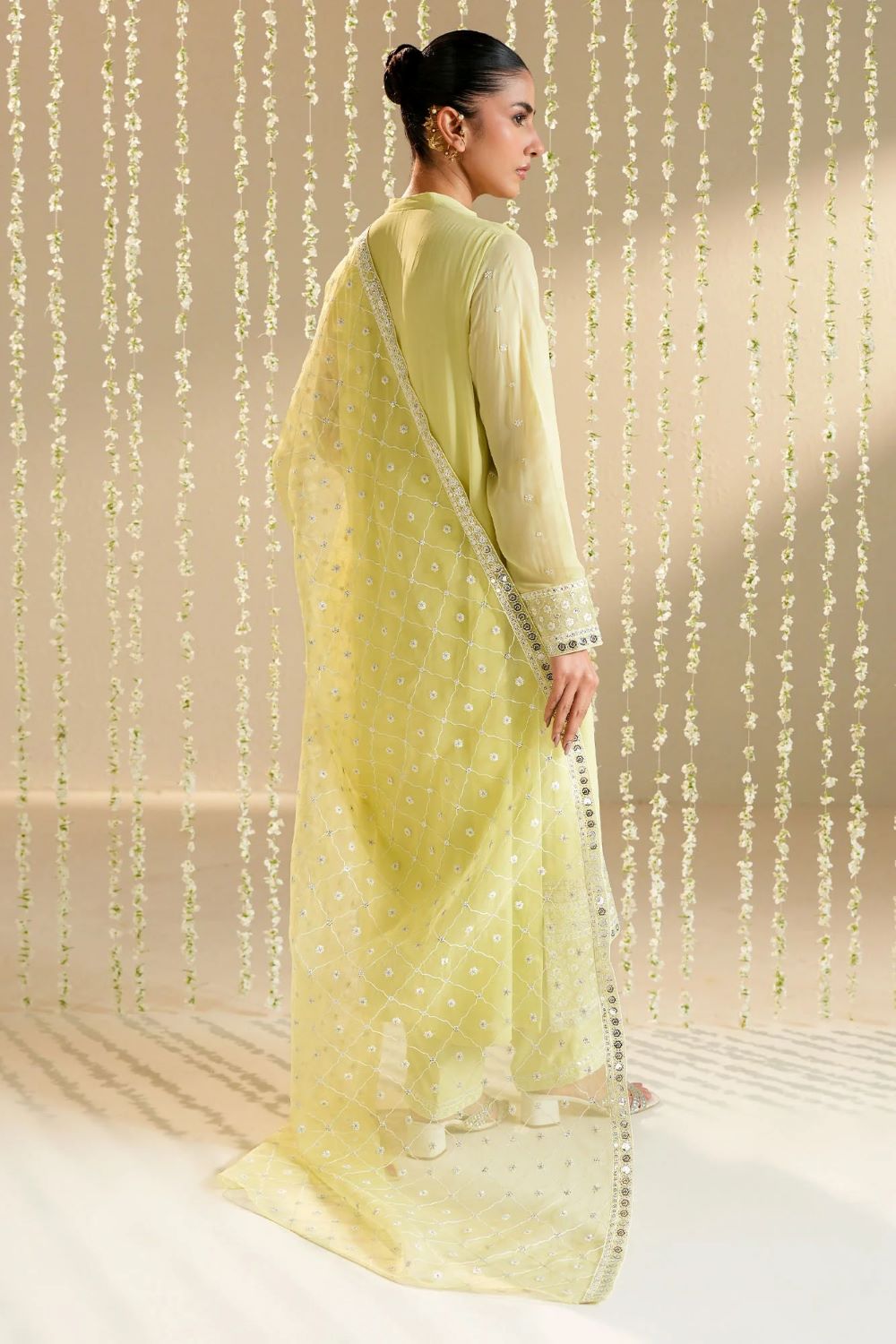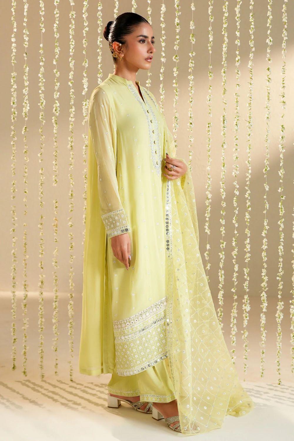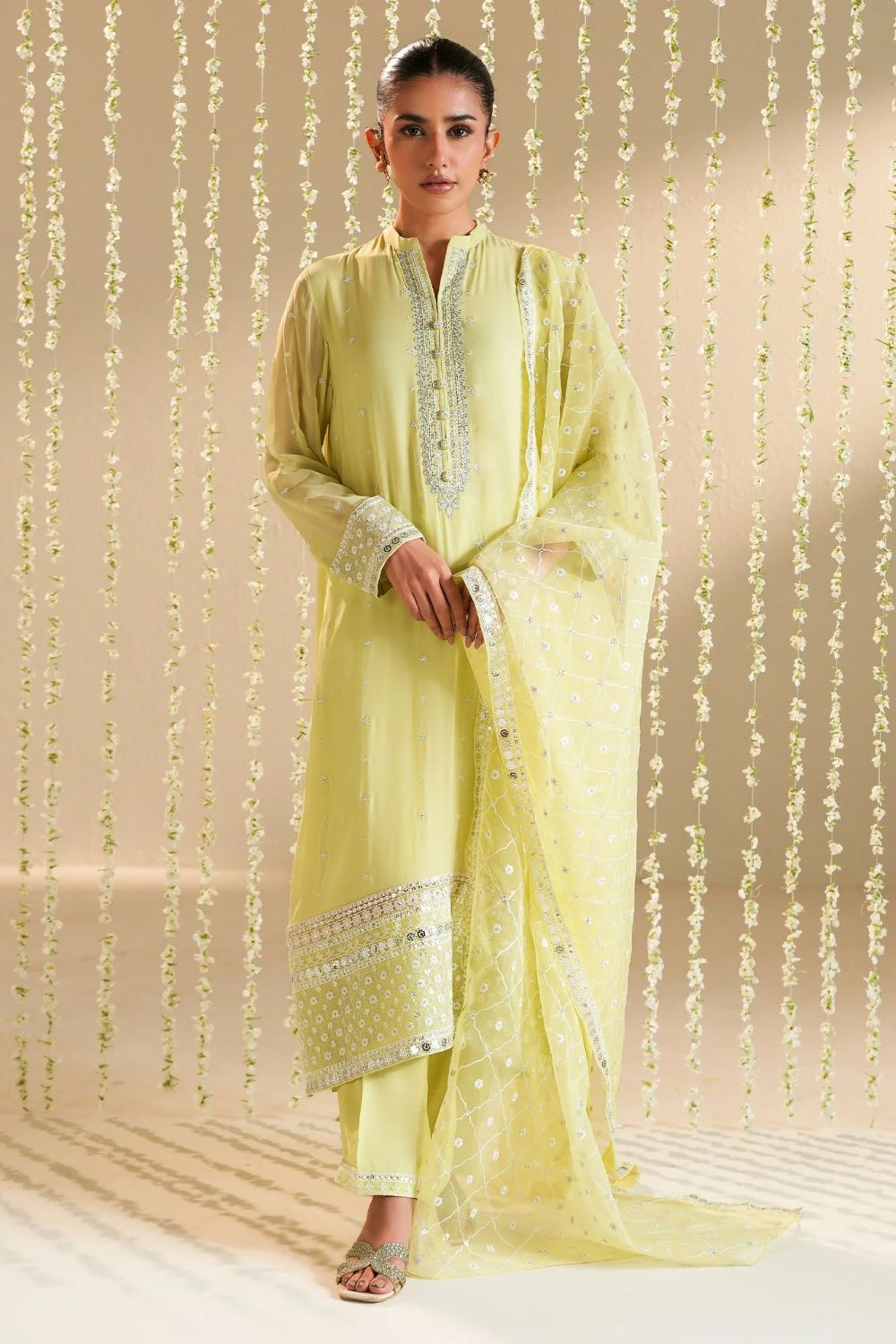 A-line shirt (Chiffon) Front embroidered with hem borders Back dyed Embroidered band collar with buttons Regular embroidered sleeves TROUSER Silk dyed embroidered trouser DUPATTA Poly organza dyed embroidered dupatta.