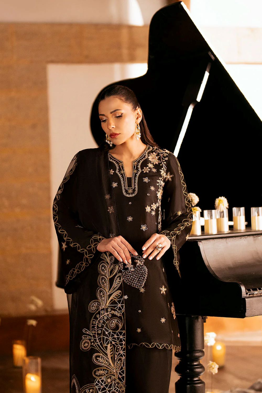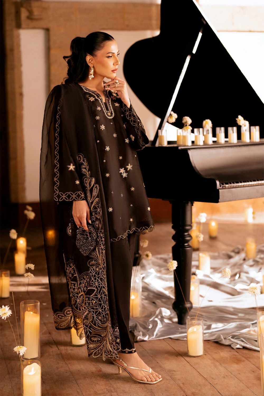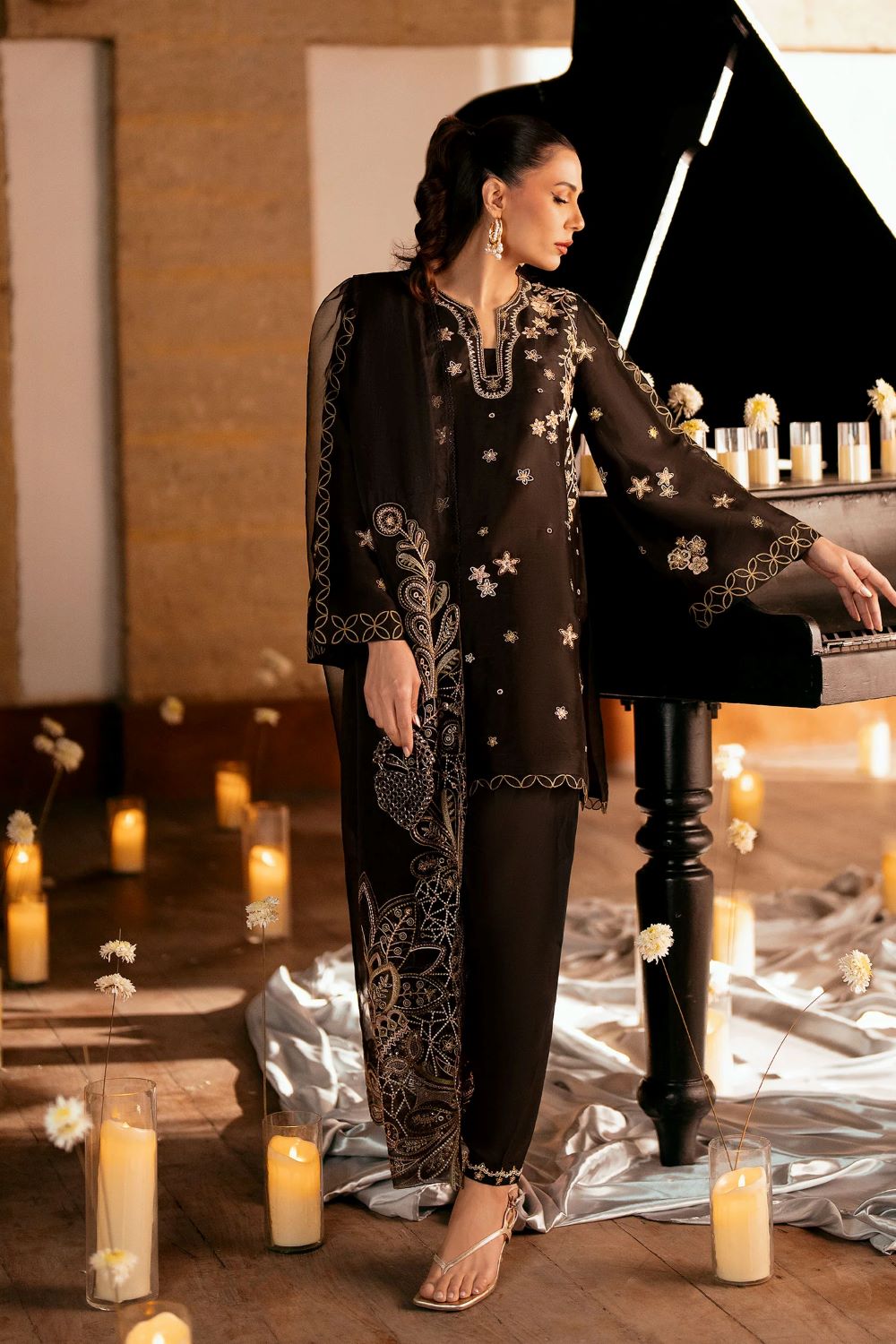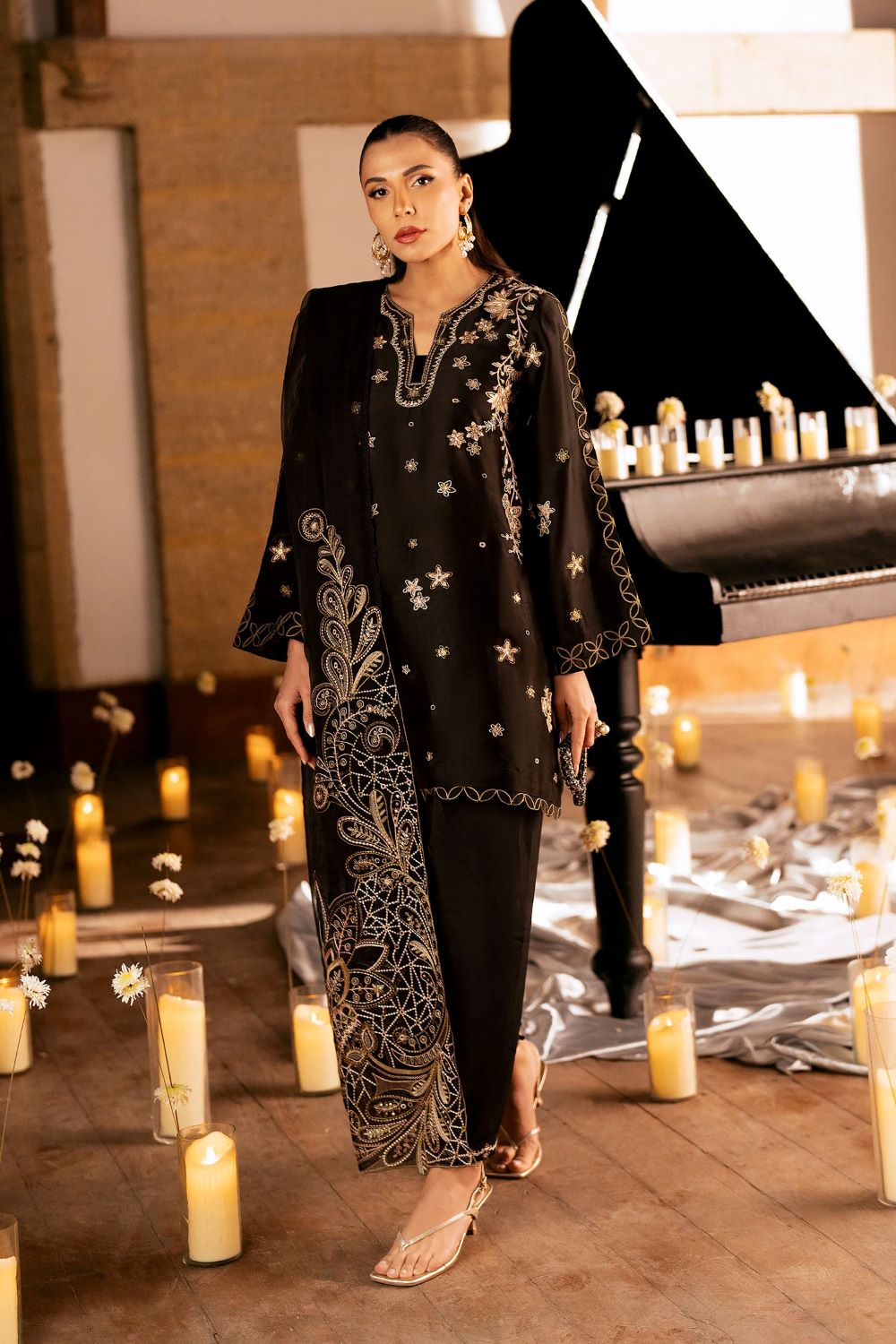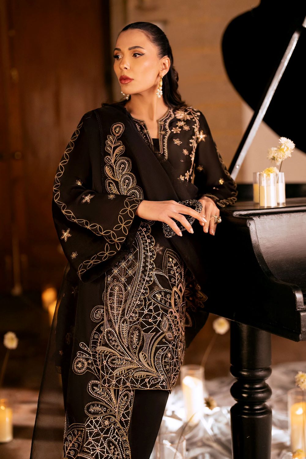 A refined three-piece designed on sheesha silk jacquard fabric, adorned with intricate gold embroidery along the neckline, sleeves, and hem. Delicate floral motifs and a detailed side panel add depth and elegance to the silhouette. Paired with tailored trousers and a sheer embroidered dupatta. Â Perfect for evening celebrations and formal occasions.