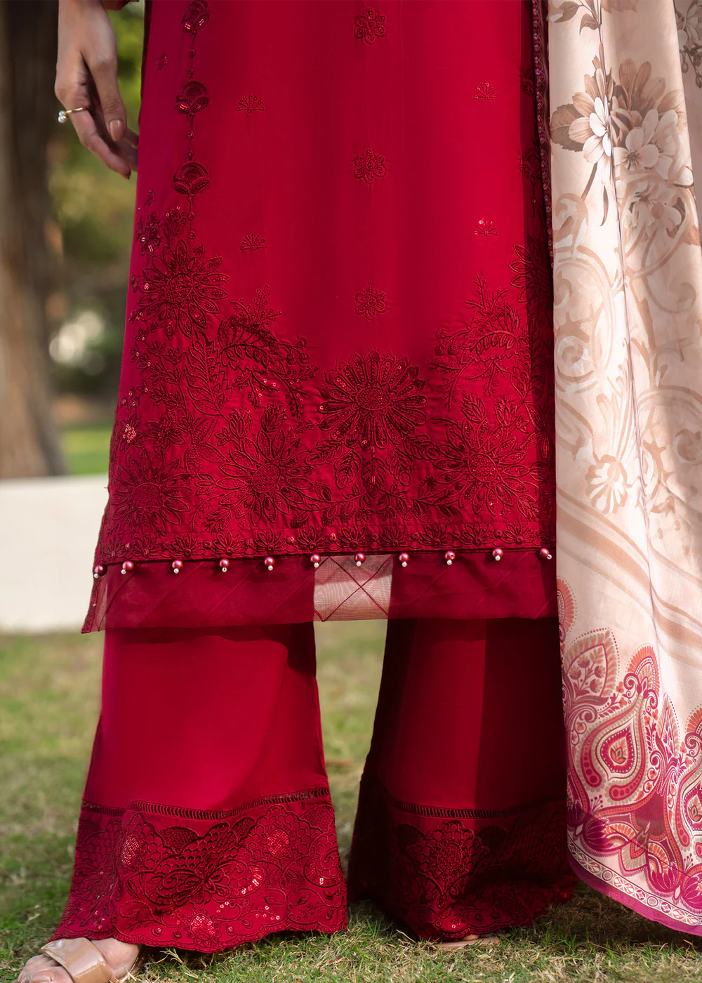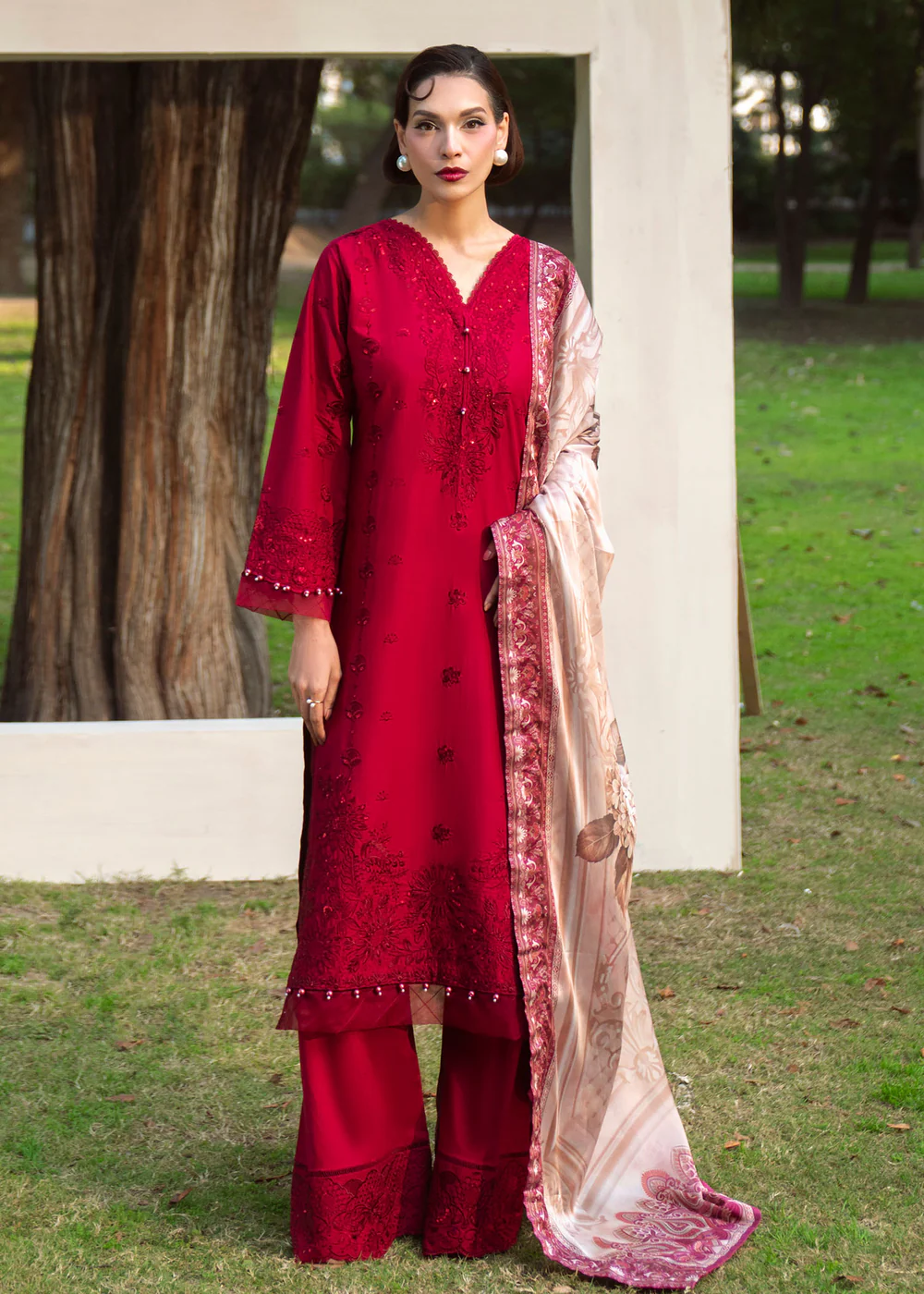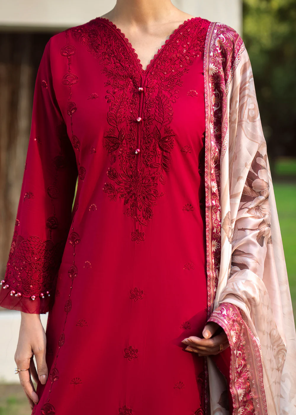 Blush tones bloom with intricate floral compositions and scalloped detailing. A romantic lawn design complemented by a beautifully finished dupatta.
