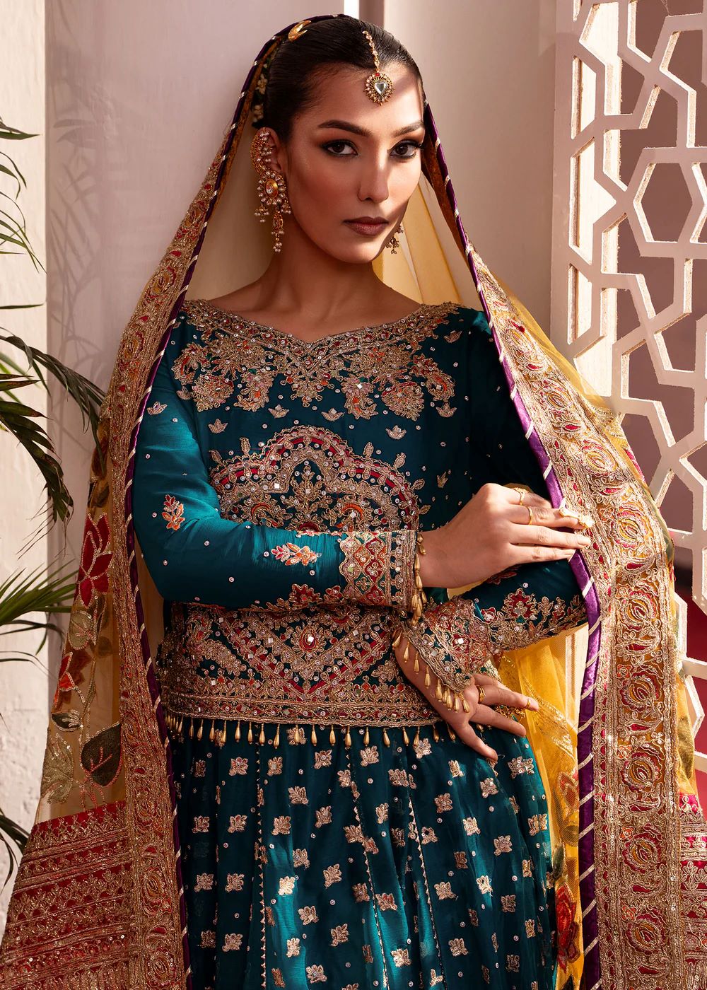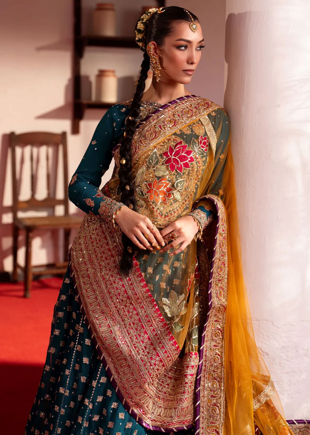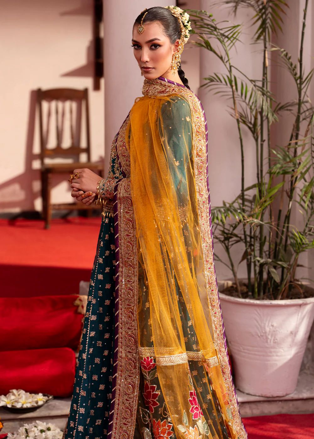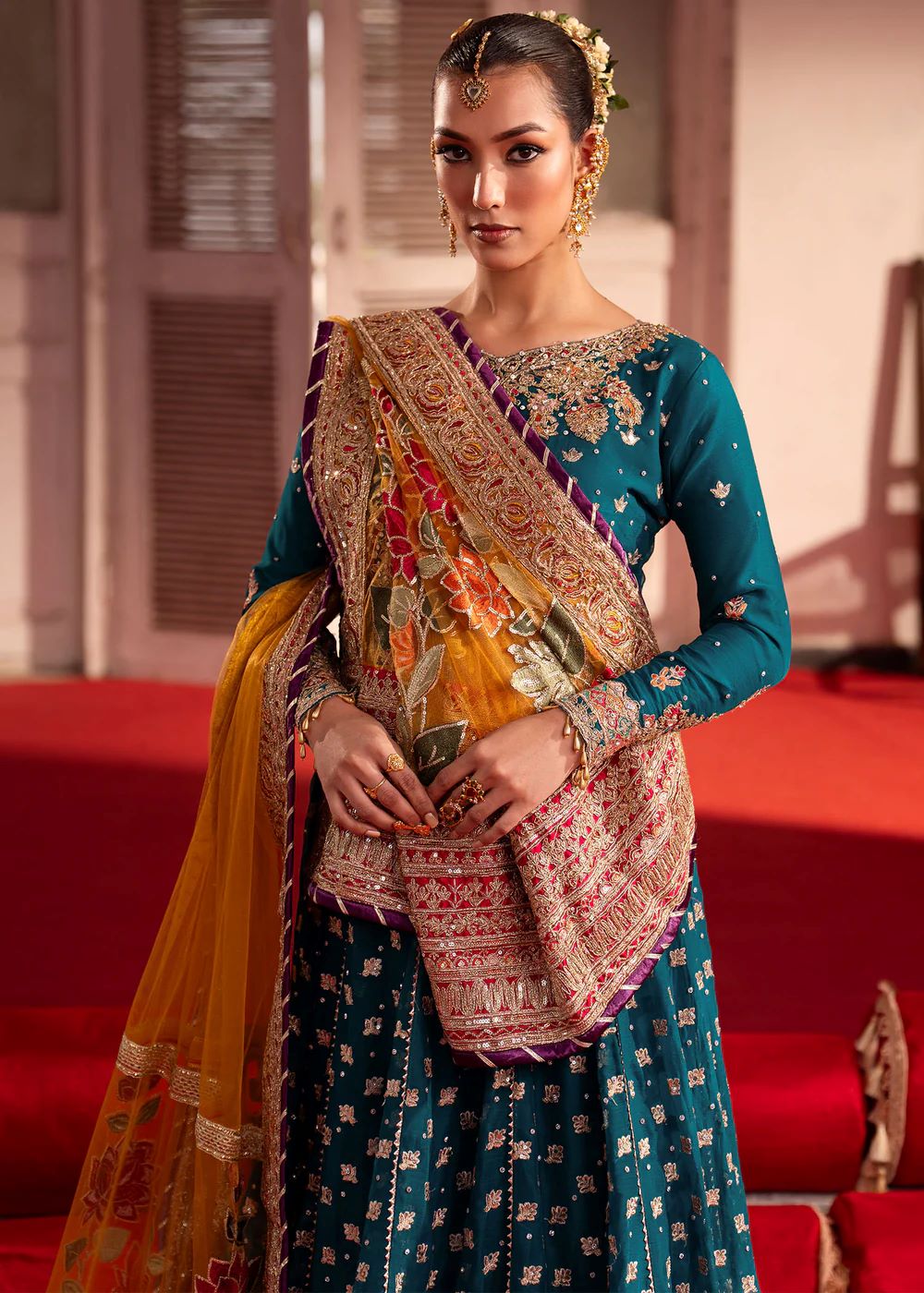 A celebration of colour and craftsmanship, Jawhar blends jewel tones with intricate embroidery and ornate borders. The interplay of colour and texture adds richness, while the contrasting dupatta introduces movement. Expressive yet balanced, this ensemble is designed for festive occasions with character.