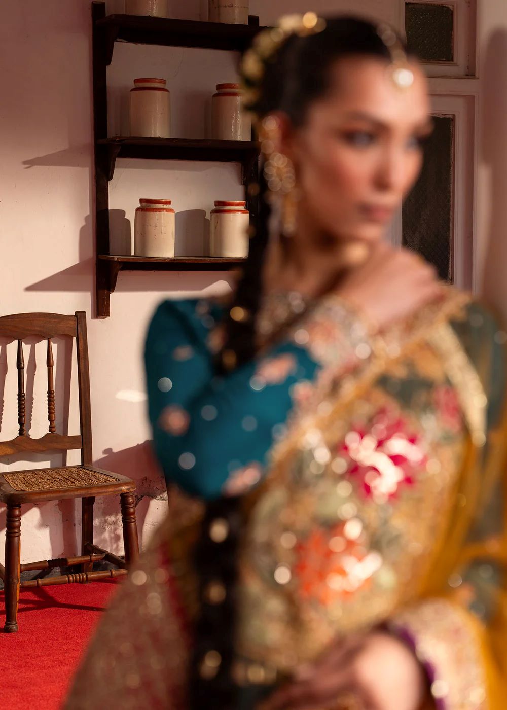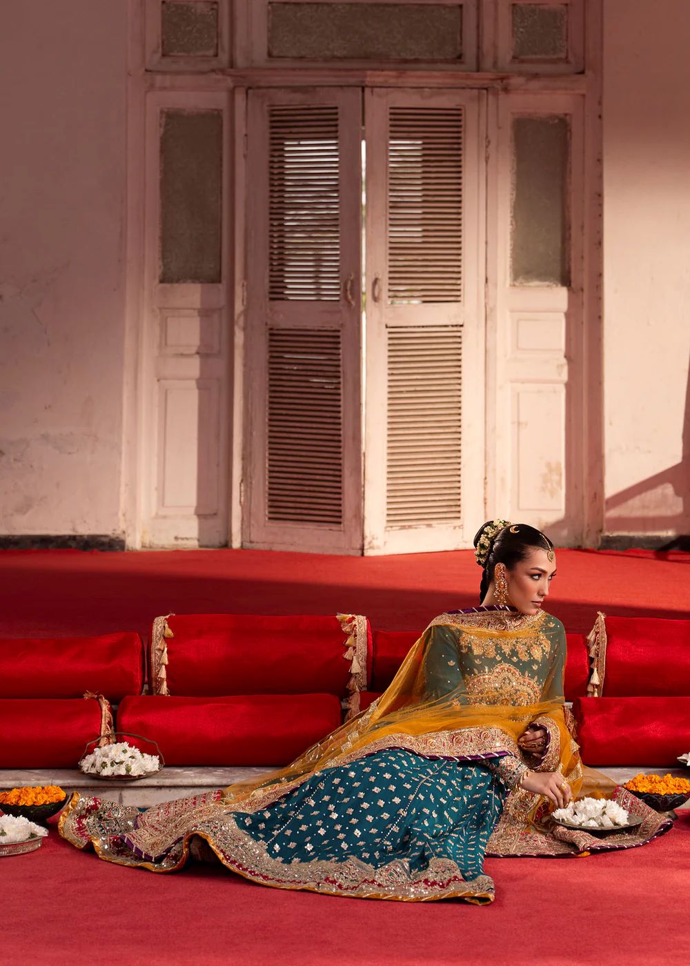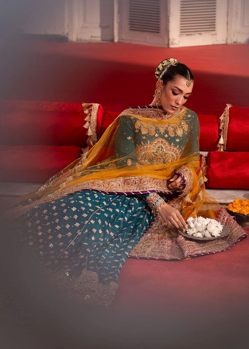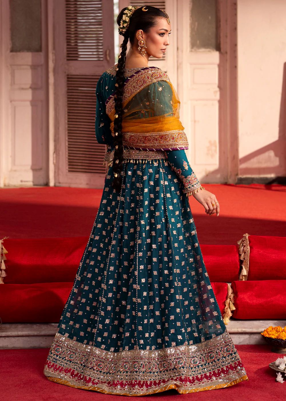A celebration of colour and craftsmanship, Jawhar blends jewel tones with intricate embroidery and ornate borders. The interplay of colour and texture adds richness, while the contrasting dupatta introduces movement. Expressive yet balanced, this ensemble is designed for festive occasions with character.