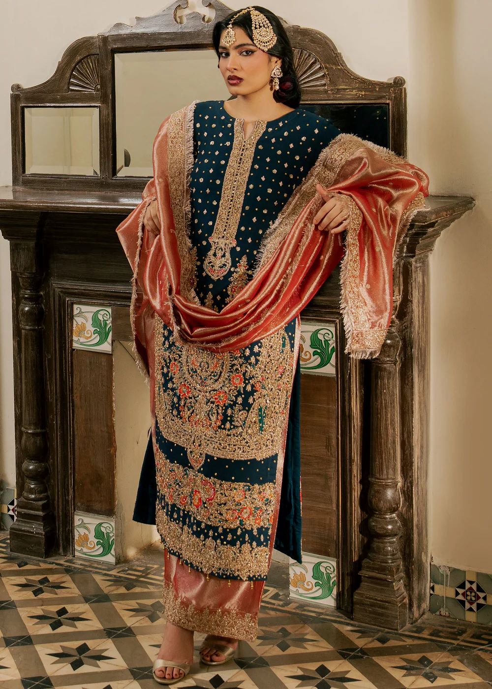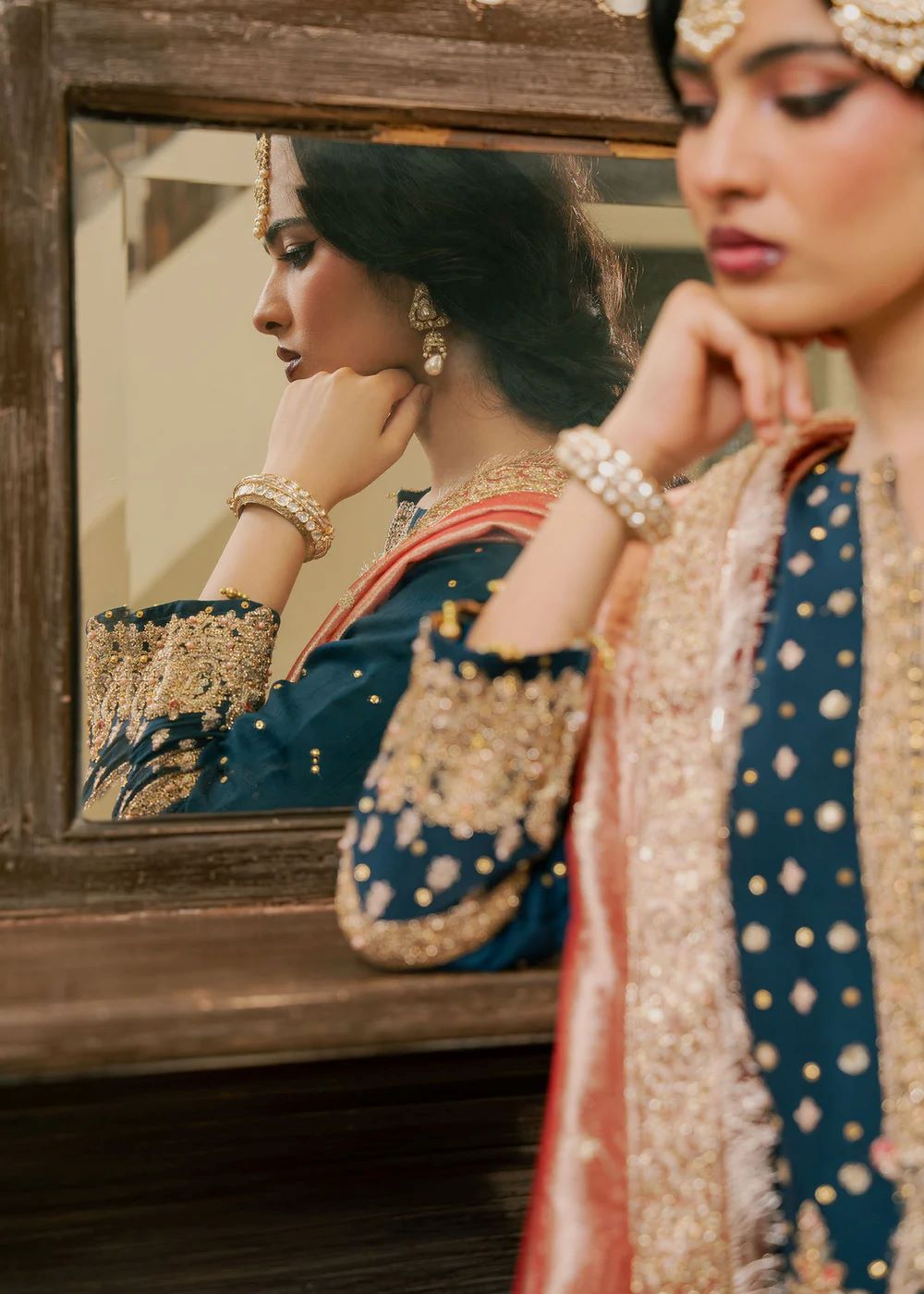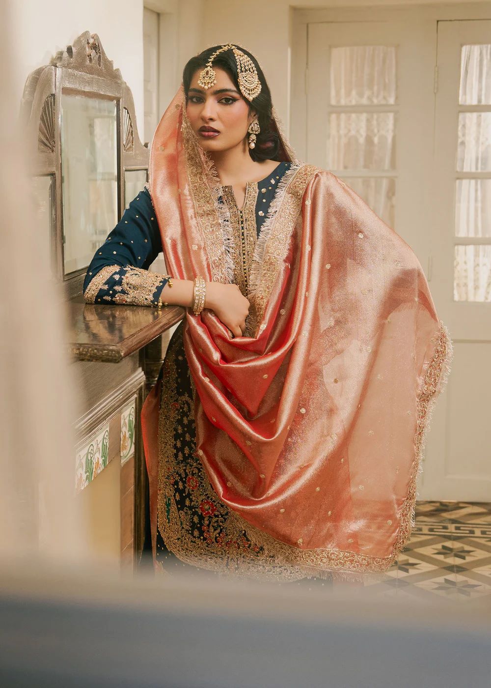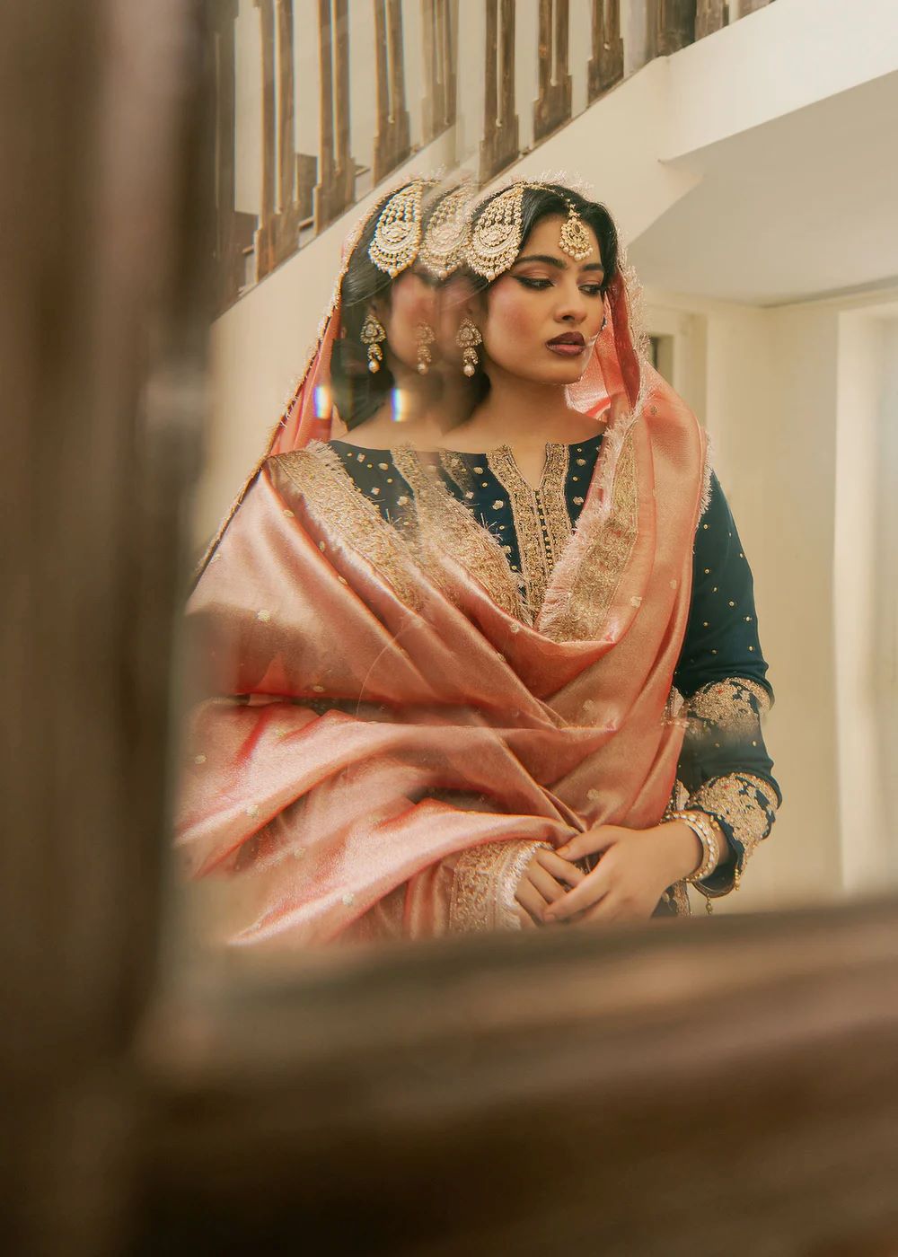 Mahināb — Midnight navy meets blush peach in this richly adorned ensemble. The shirt features dense handcrafted motifs, pearls, sequins, and resham in traditional patterns. The peach dupatta, with its textured edging and shimmering accents, balances the richness with softness. A striking blend of heritage and modern femininity.