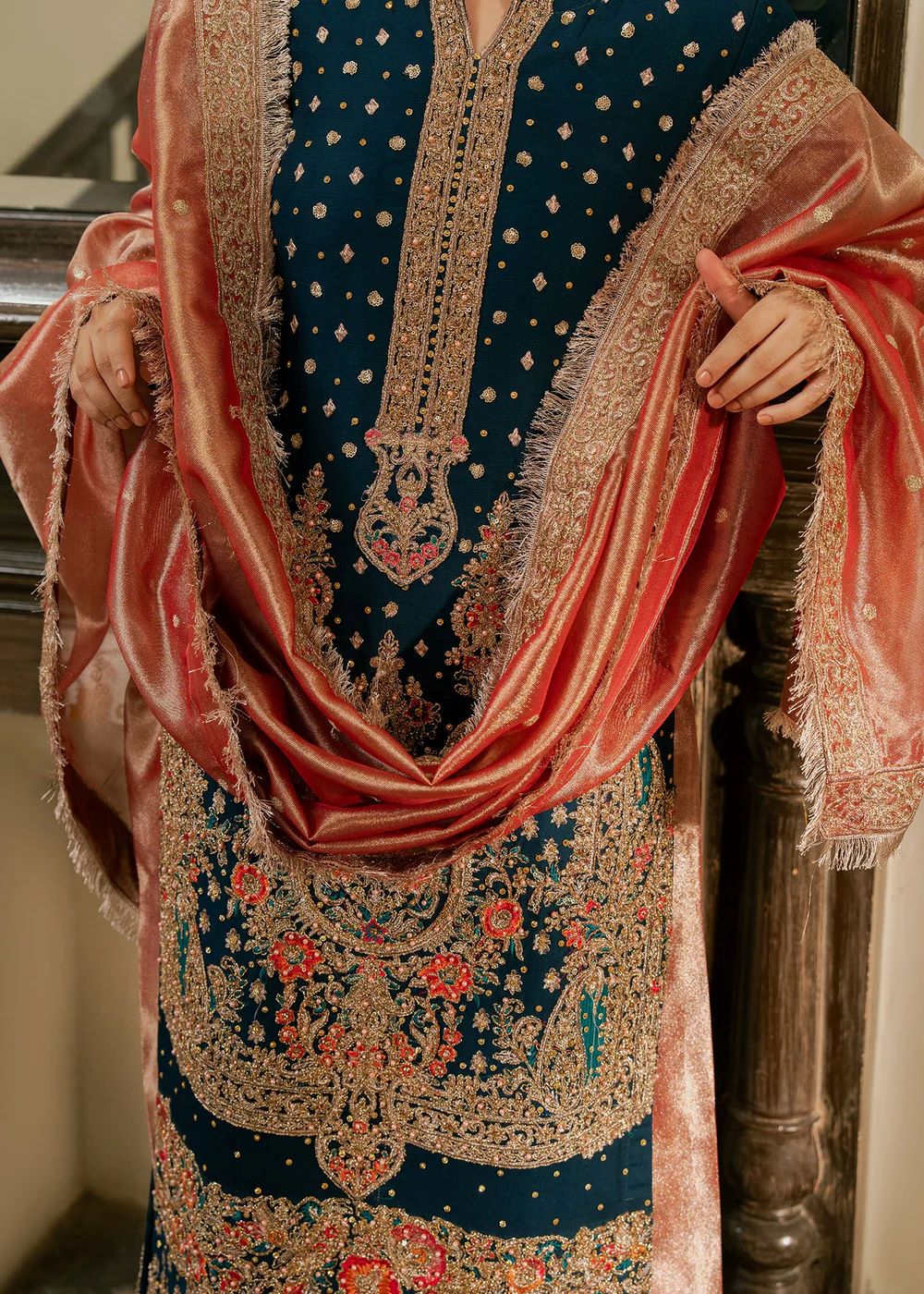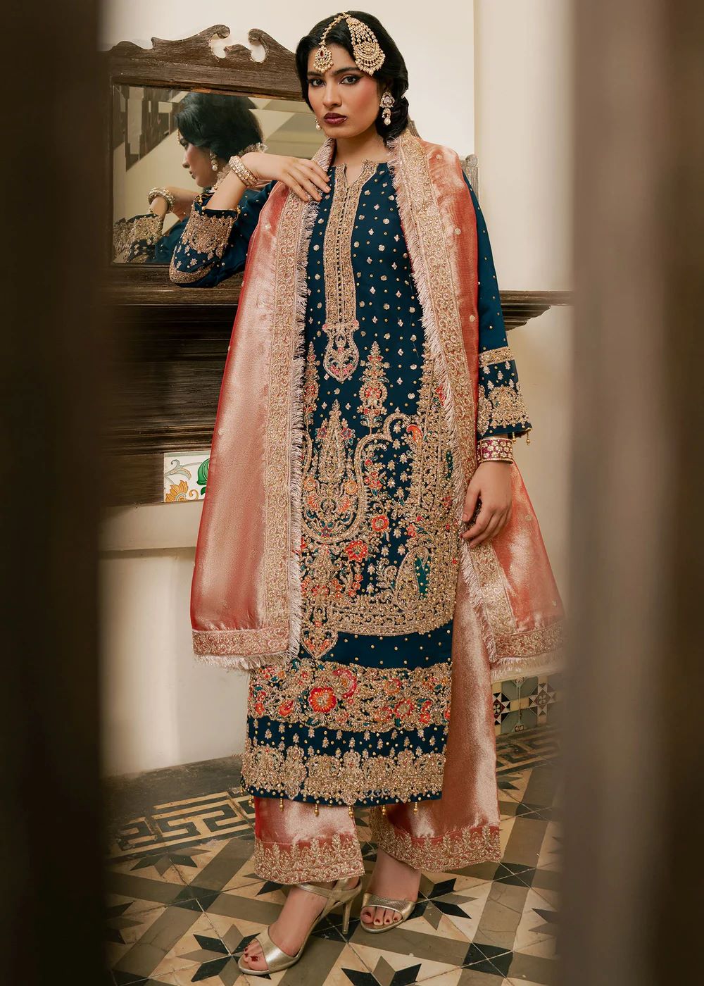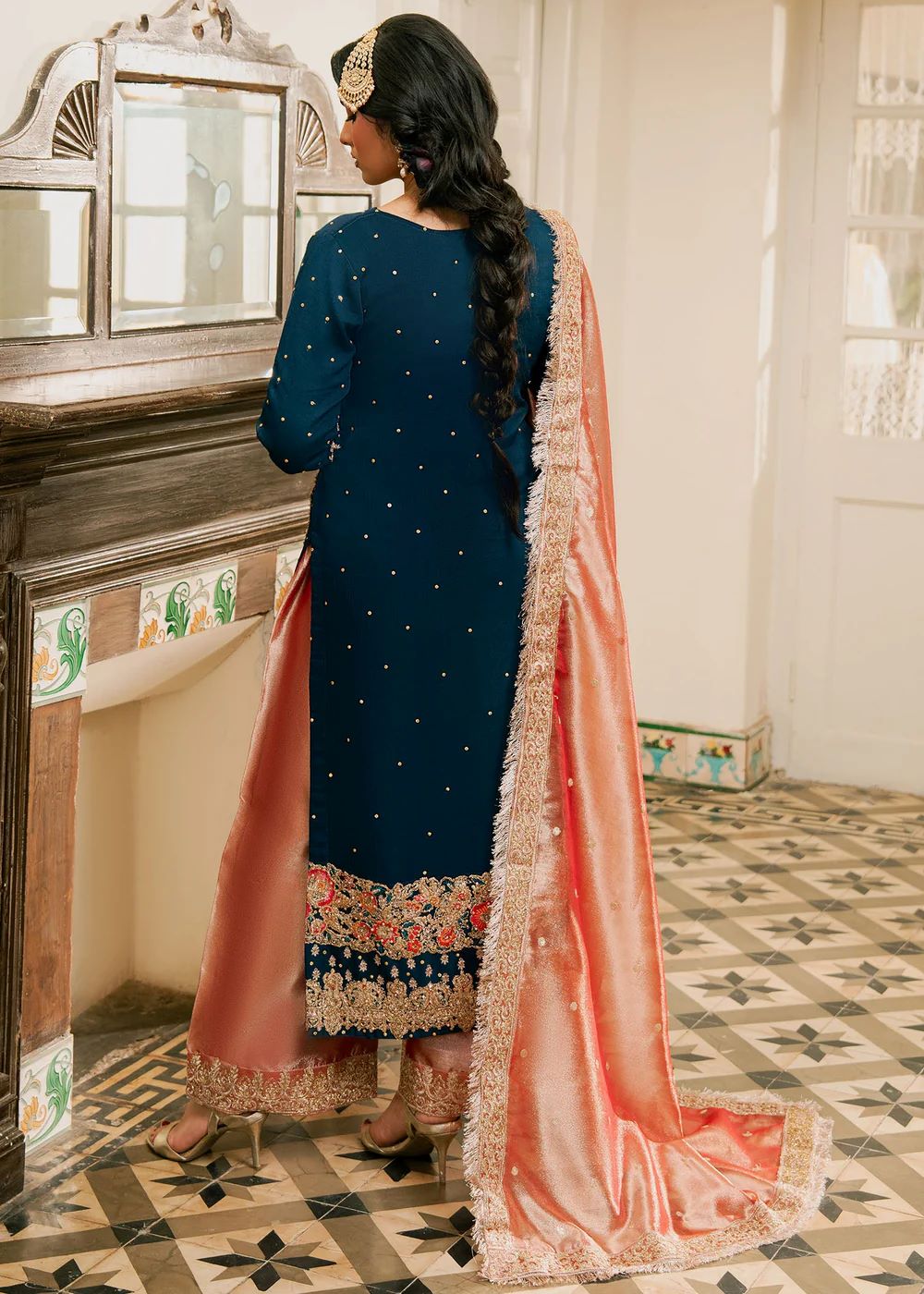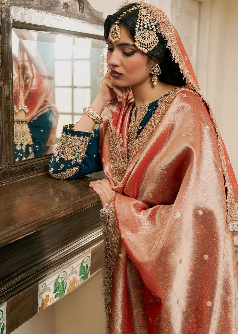 Mahināb — Midnight navy meets blush peach in this richly adorned ensemble. The shirt features dense handcrafted motifs, pearls, sequins, and resham in traditional patterns. The peach dupatta, with its textured edging and shimmering accents, balances the richness with softness. A striking blend of heritage and modern femininity.