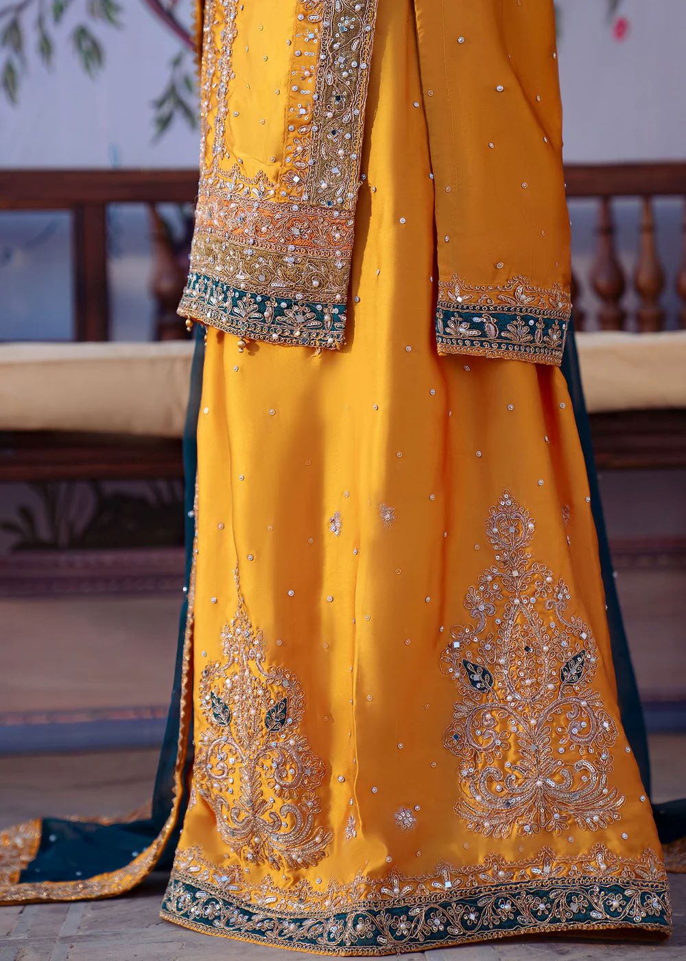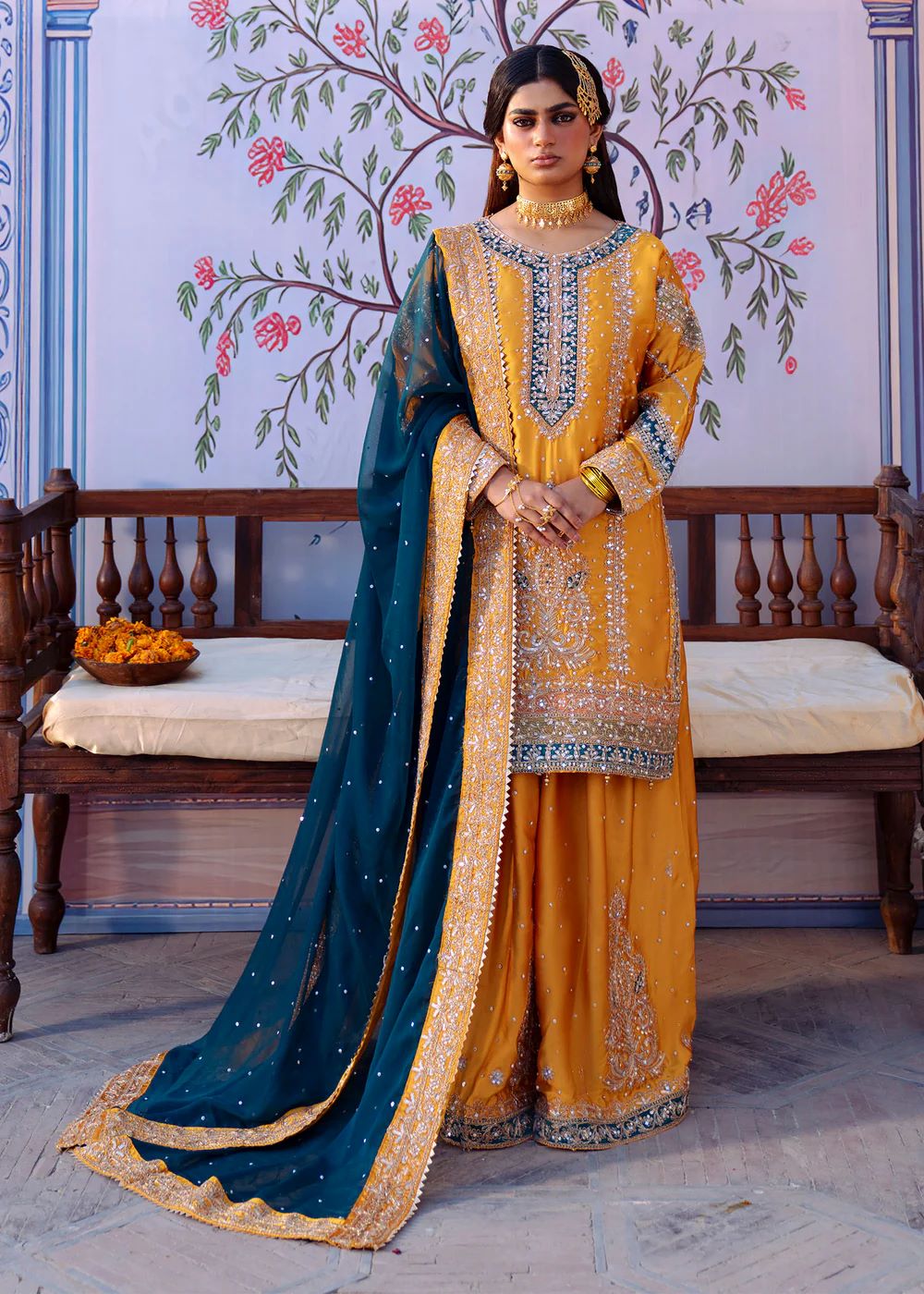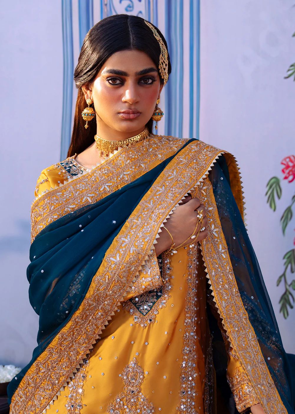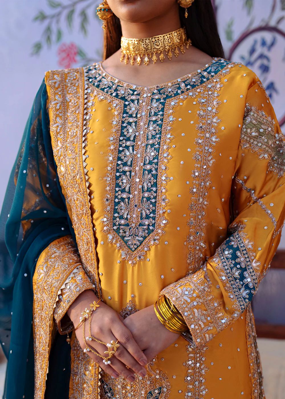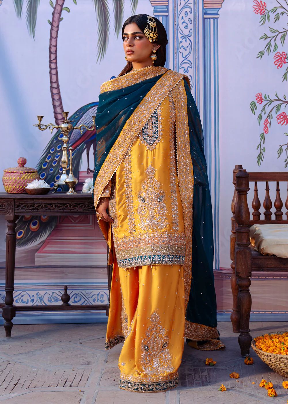 Mehrāb stands out in a vibrant marigold palette accented with deep teal embroidery inspired by traditional court murals. The heavily worked kameez is balanced with a contrasting dupatta that frames the silhouette beautifully. This design embodies festive grandeur and ceremonial splendor, ideal for statement occasions.