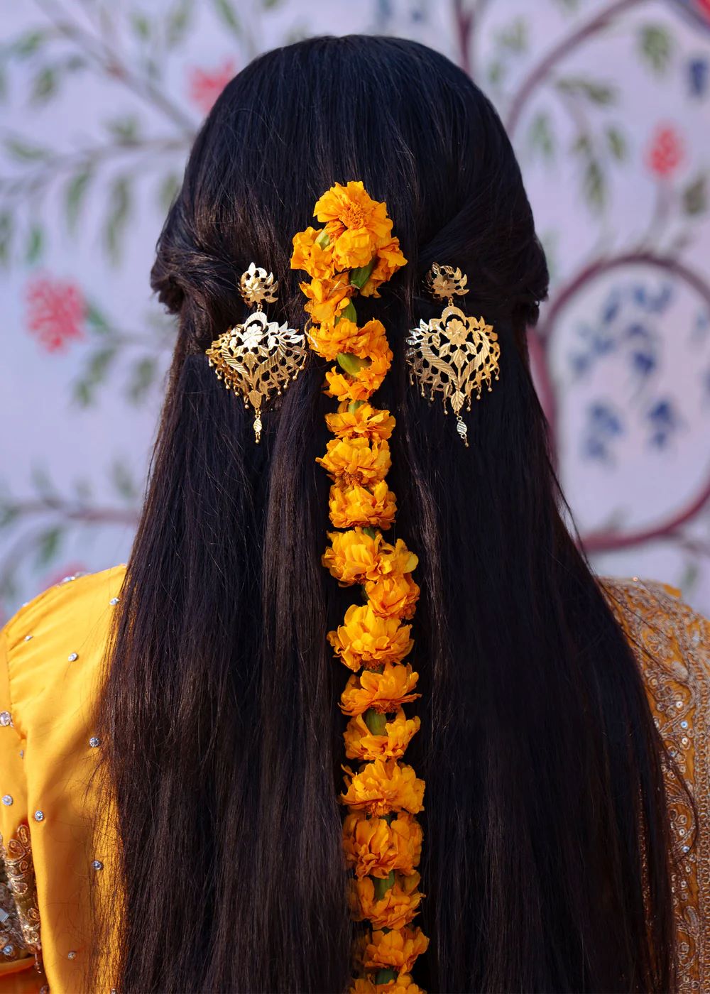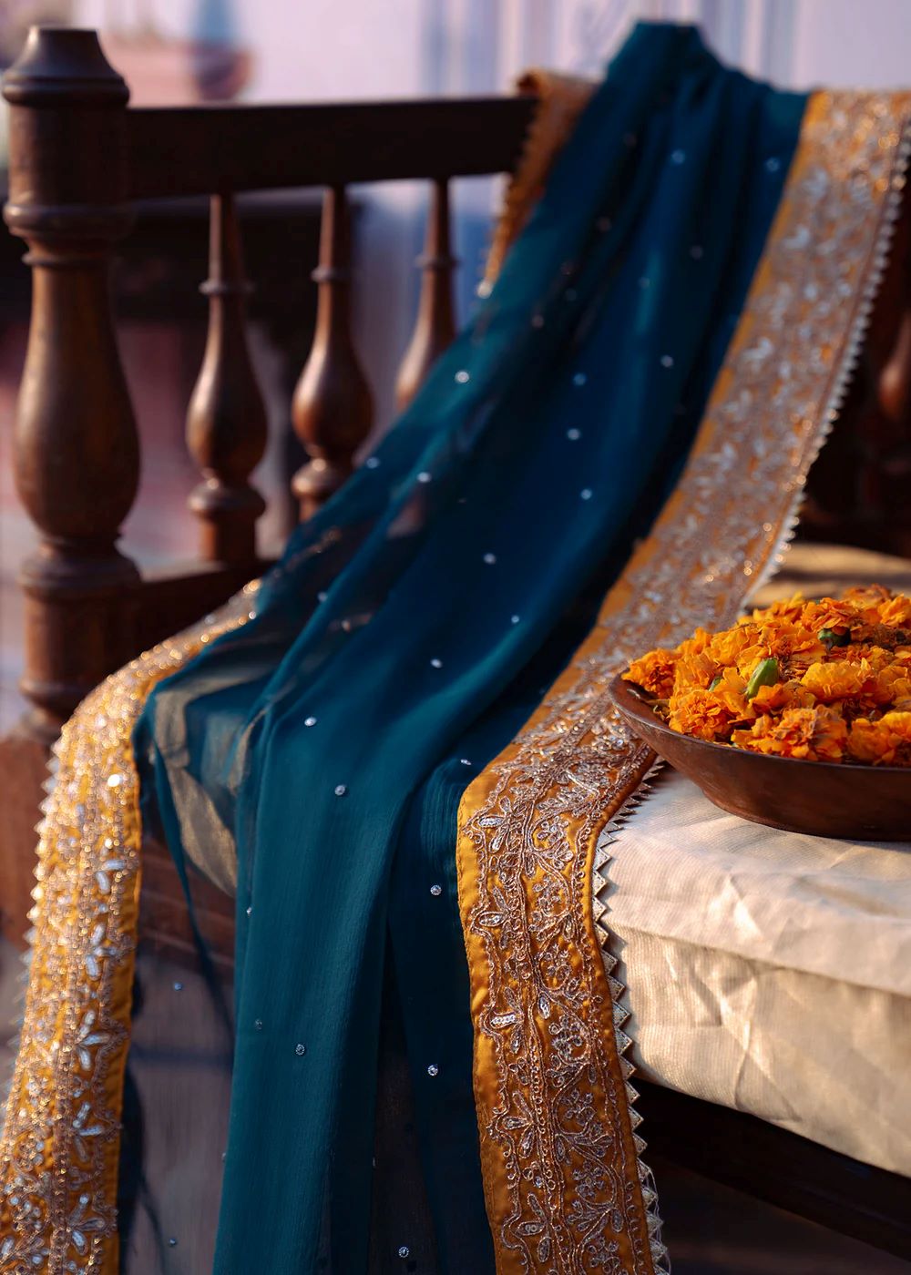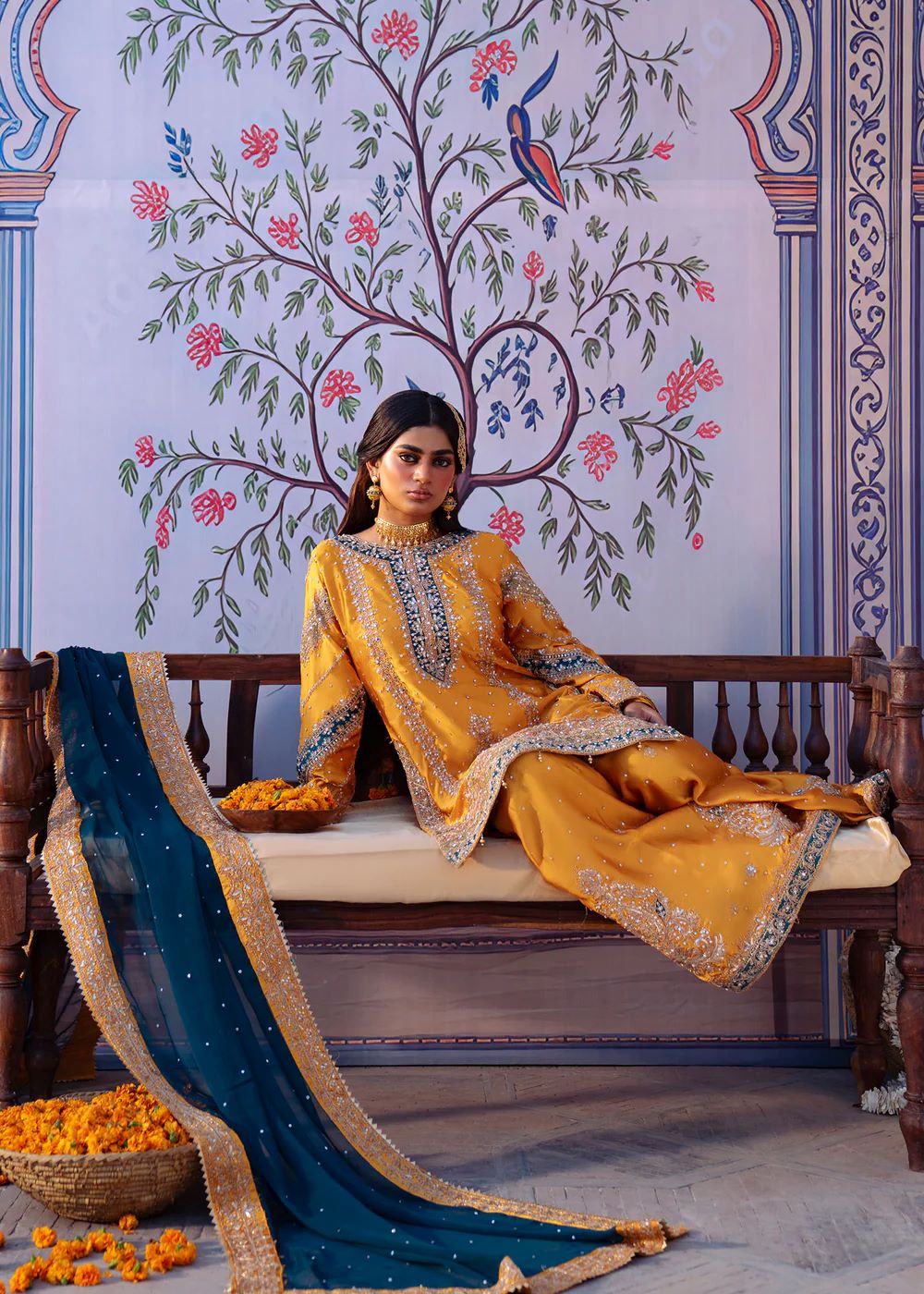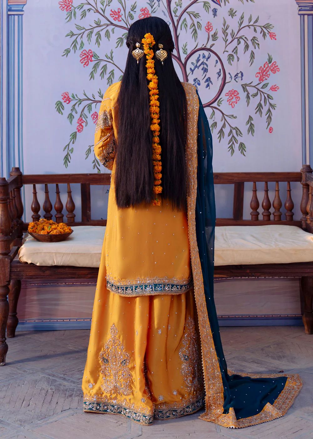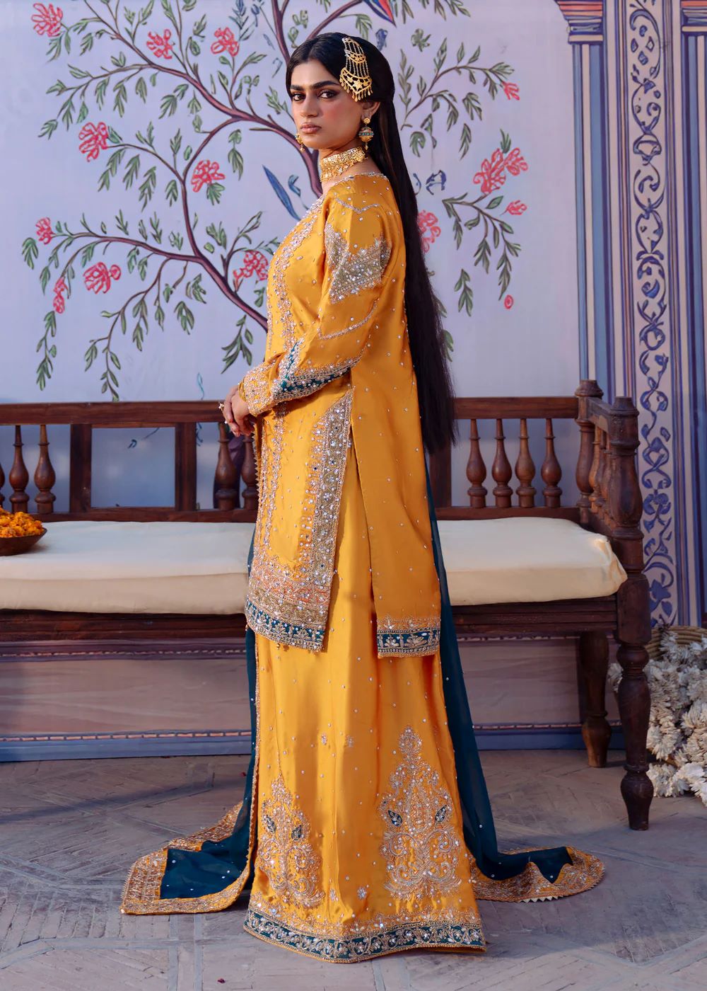 Mehrāb stands out in a vibrant marigold palette accented with deep teal embroidery inspired by traditional court murals. The heavily worked kameez is balanced with a contrasting dupatta that frames the silhouette beautifully. This design embodies festive grandeur and ceremonial splendor, ideal for statement occasions.