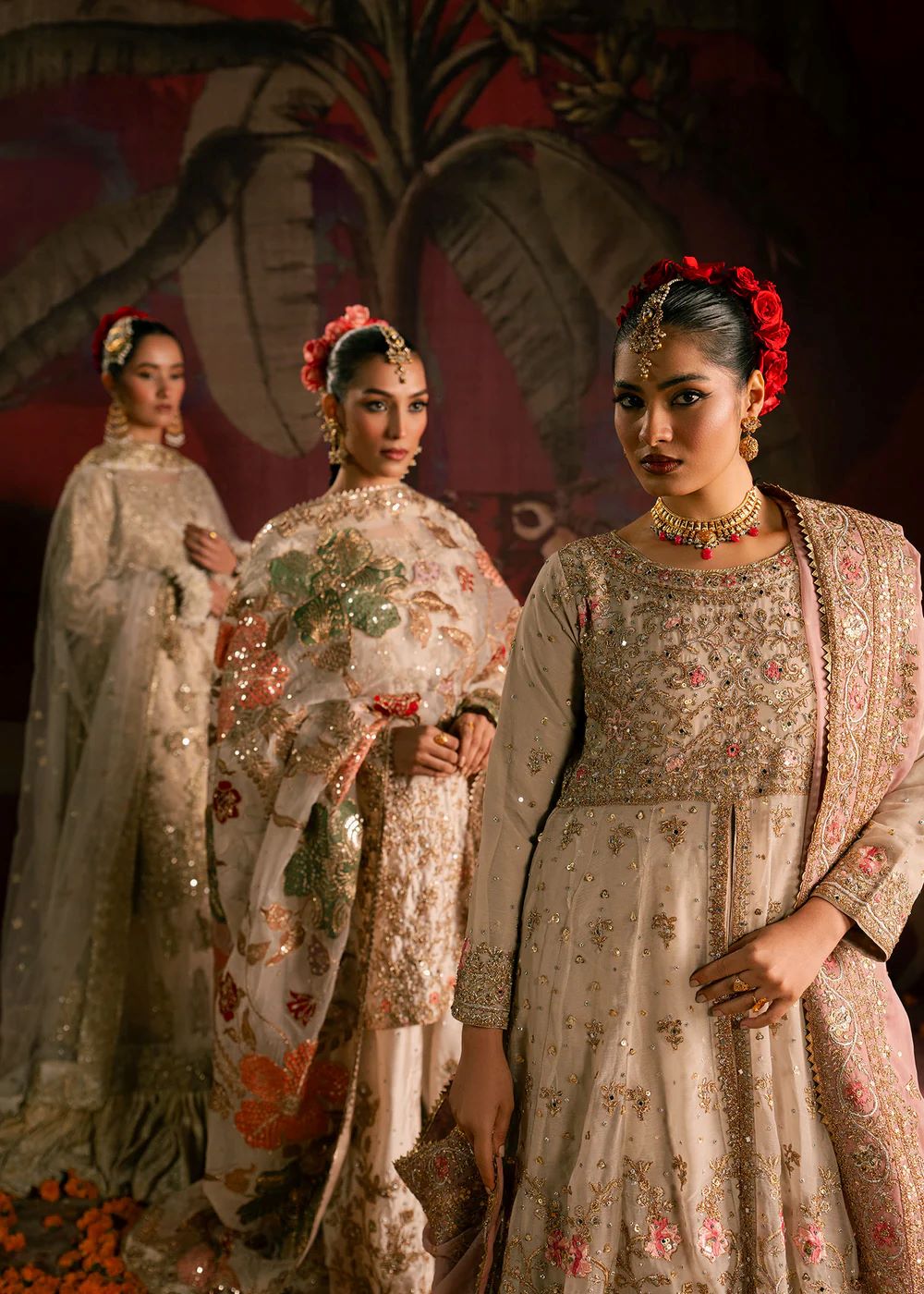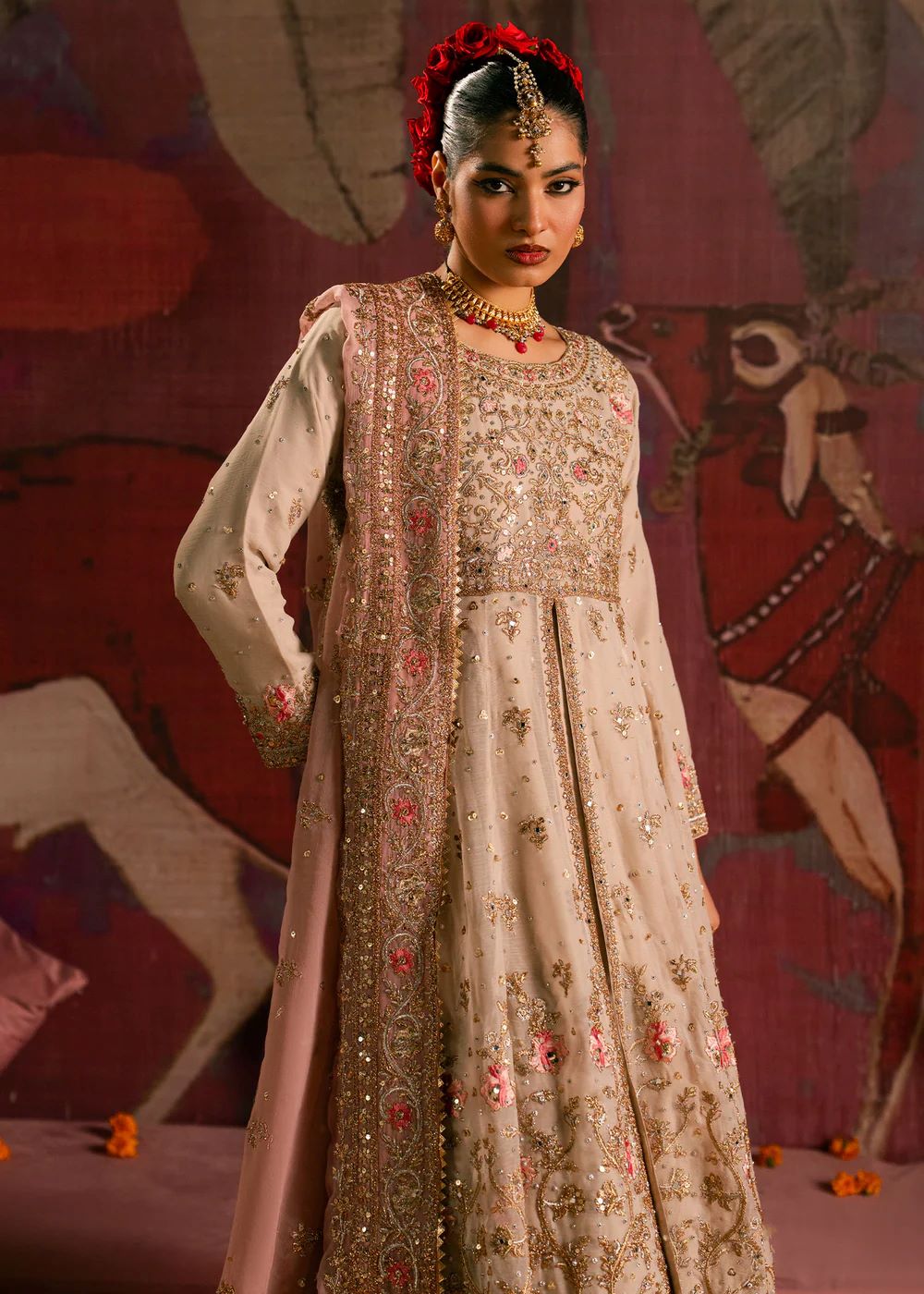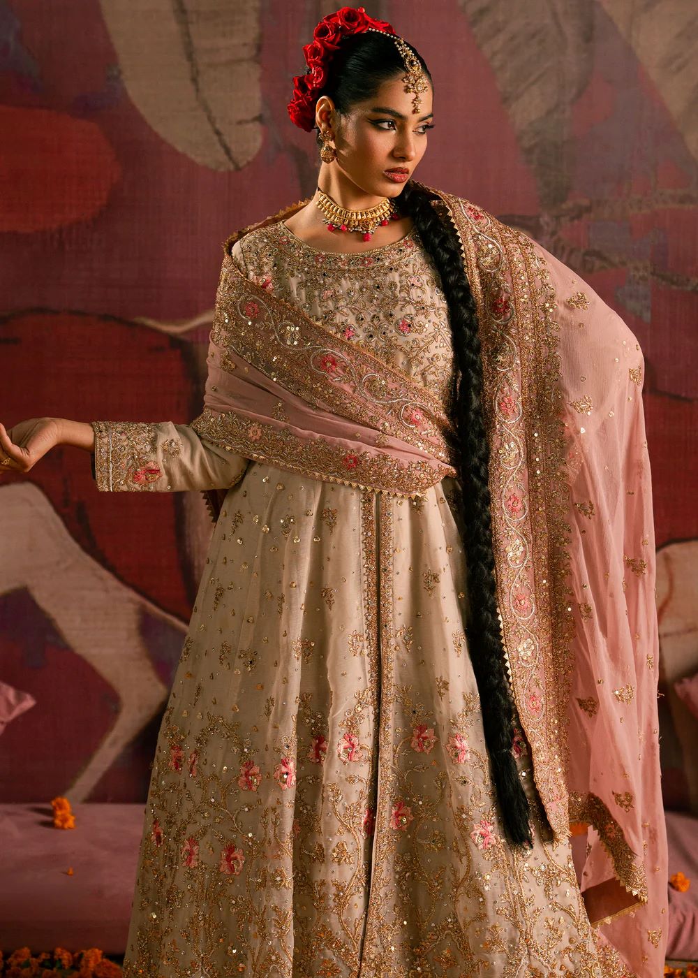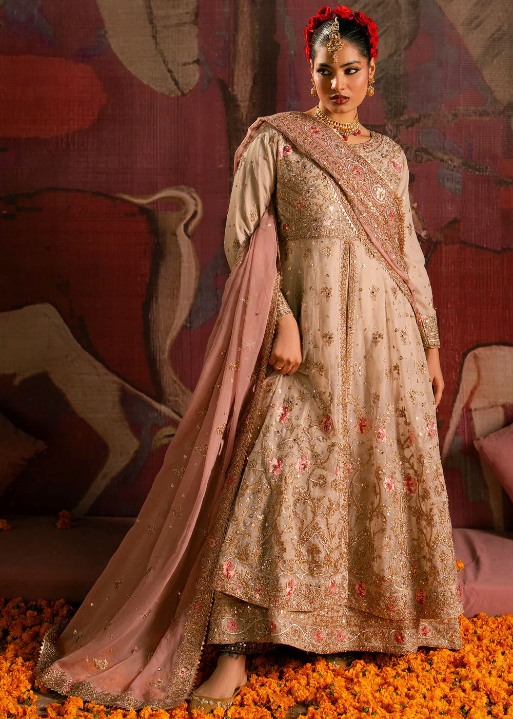 Rendered in soft ivory hues, Moti features delicate hand-embellishment and subtle floral detailing that adds gentle texture to the ensemble. The flowing silhouette allows for effortless movement, while the lightweight dupatta lends softness and grace. Understated and timeless, this design reflects quiet luxury and feminine sophistication.