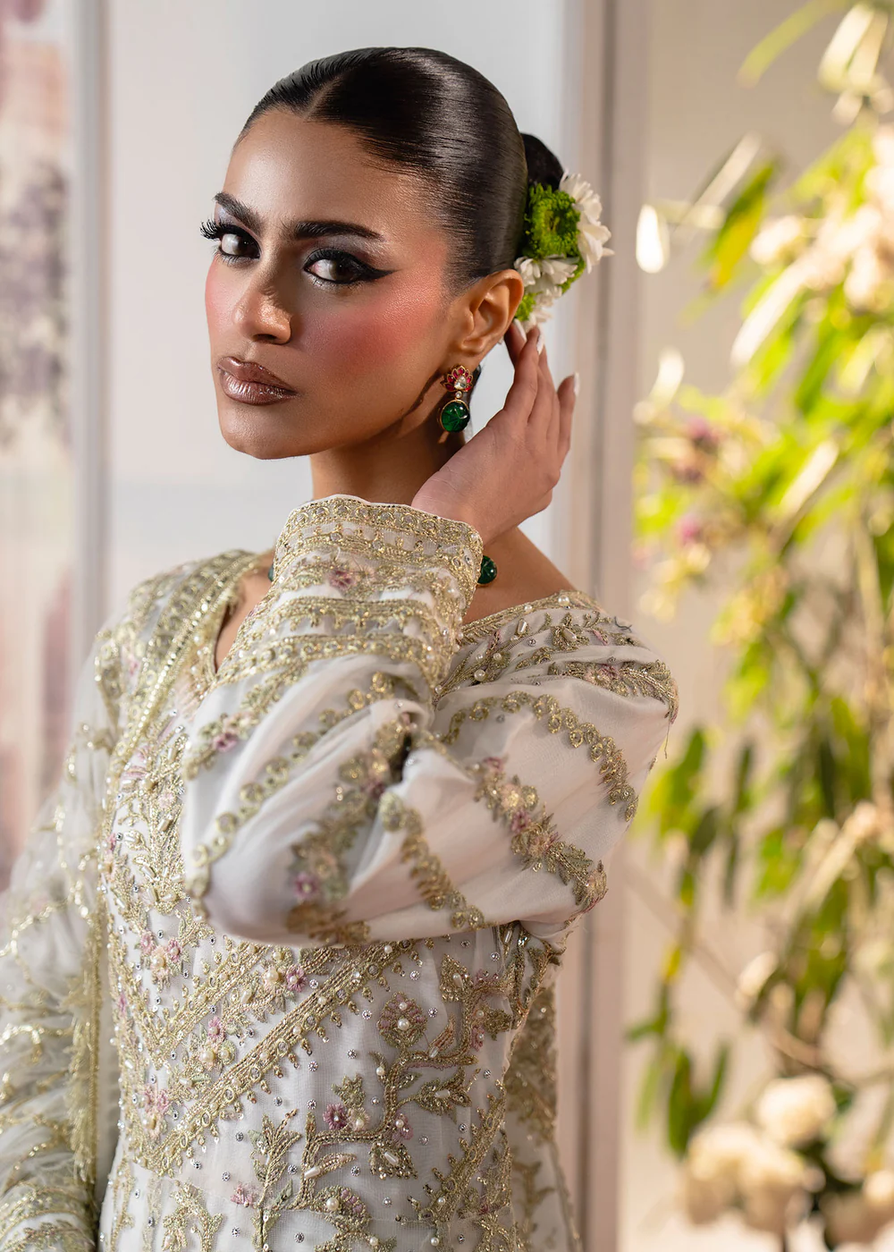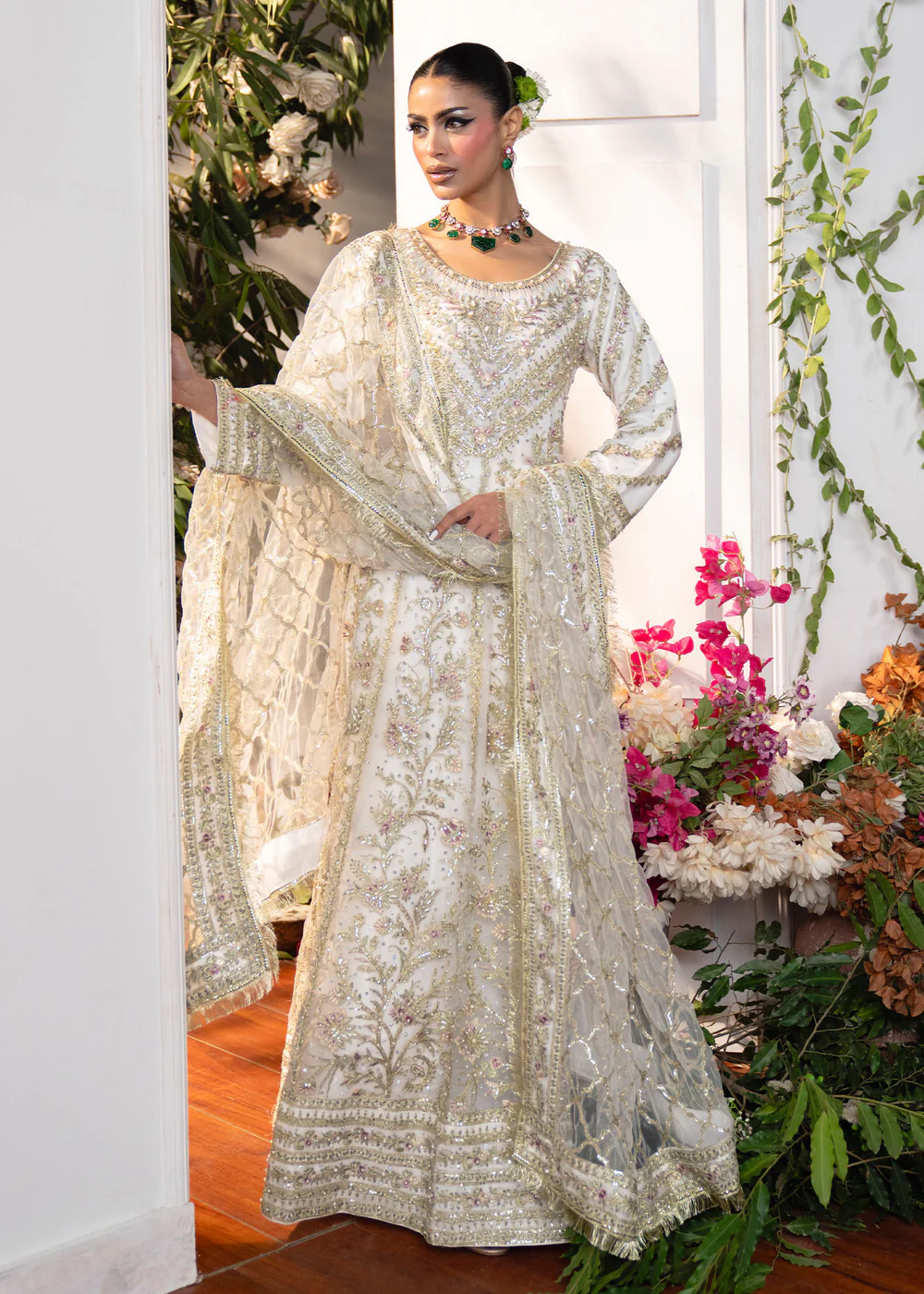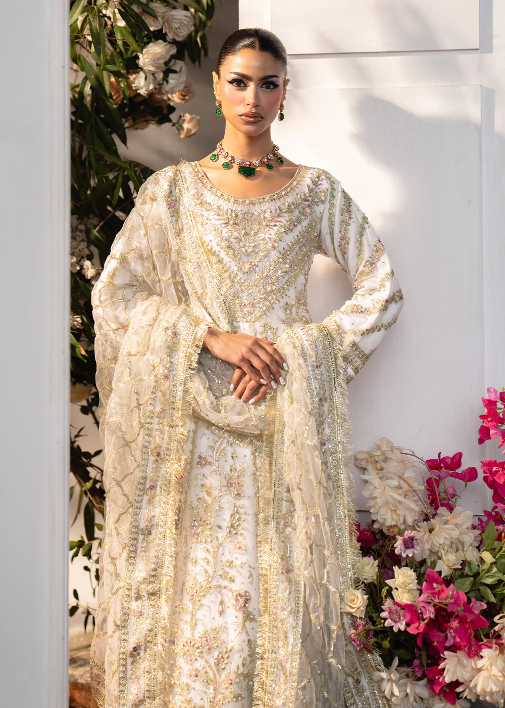 An elegant ivory ensemble with delicate gold embroidery, flowing effortlessly with a sheer dupatta. Soft, luminous, and timelessly refined