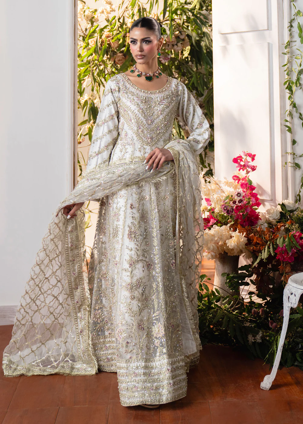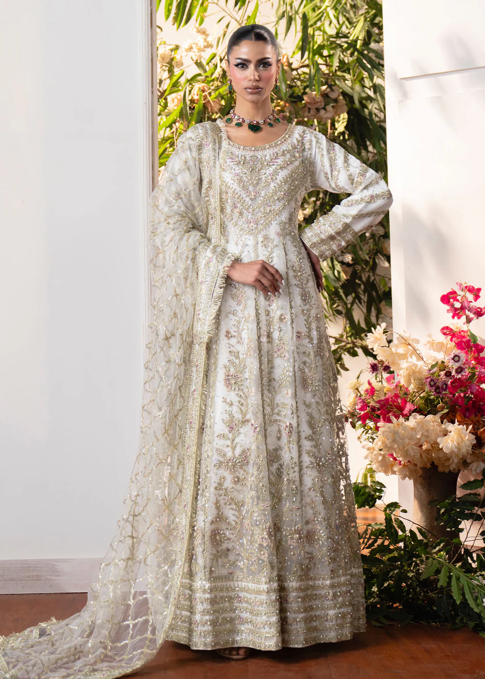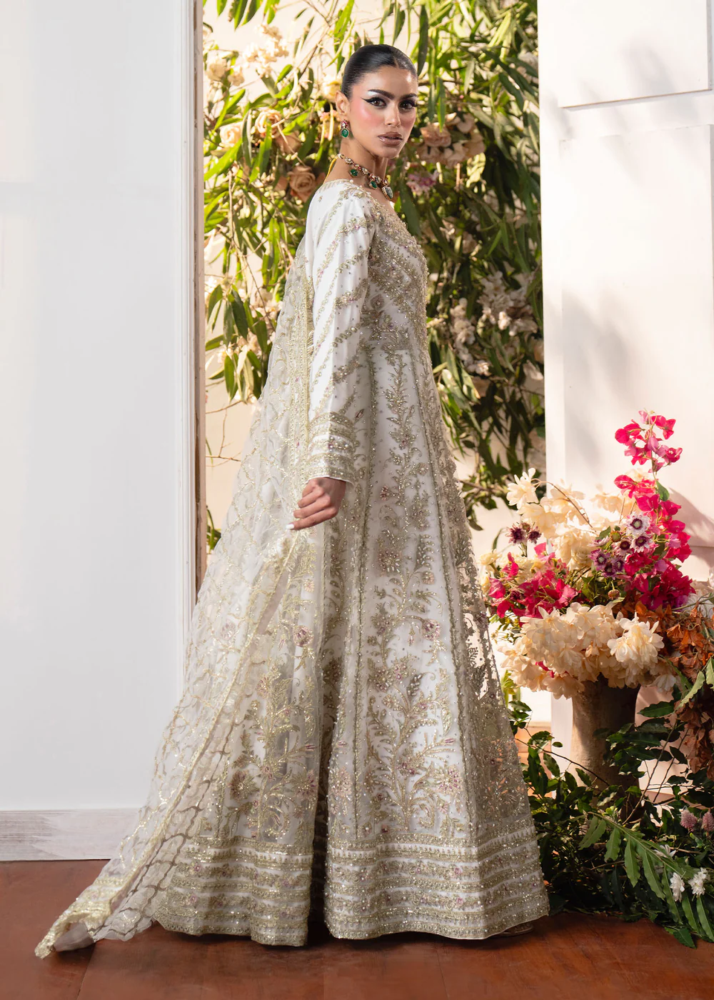 An elegant ivory ensemble with delicate gold embroidery, flowing effortlessly with a sheer dupatta. Soft, luminous, and timelessly refined