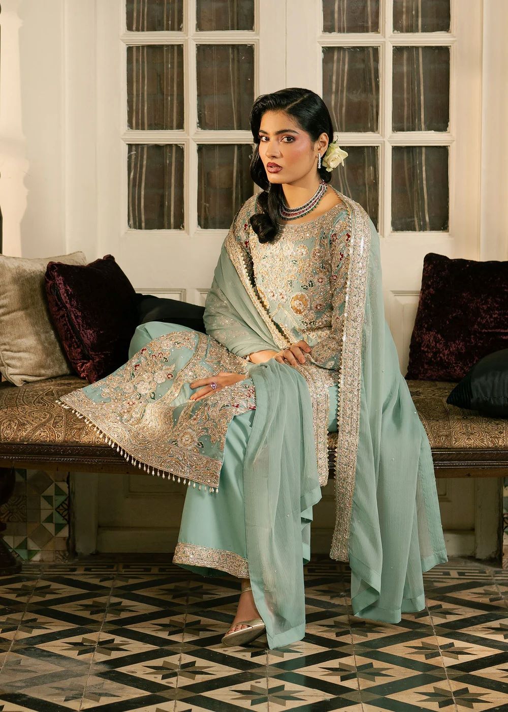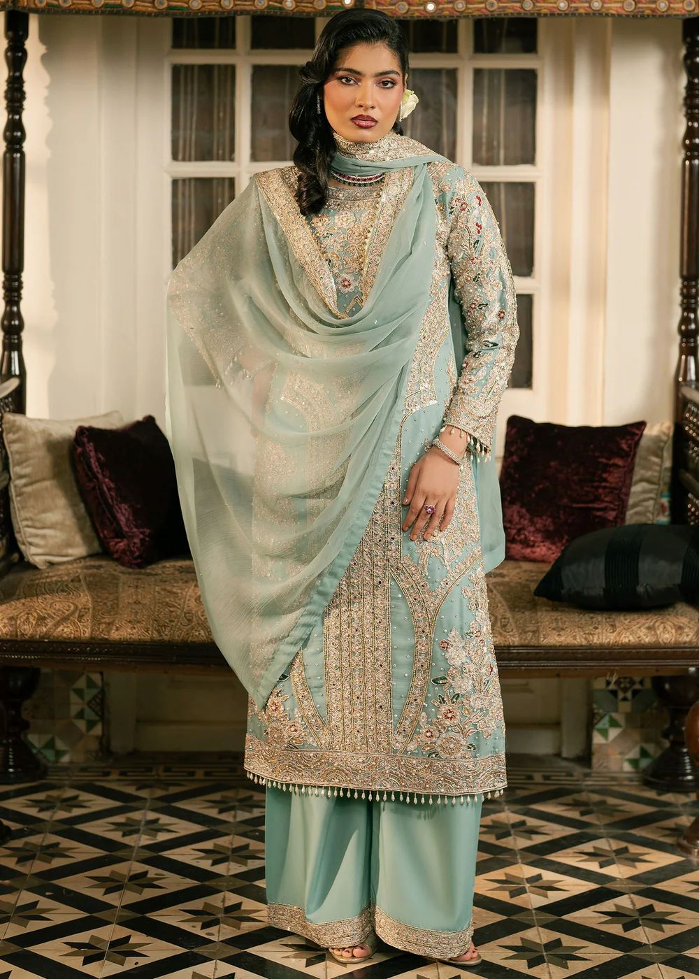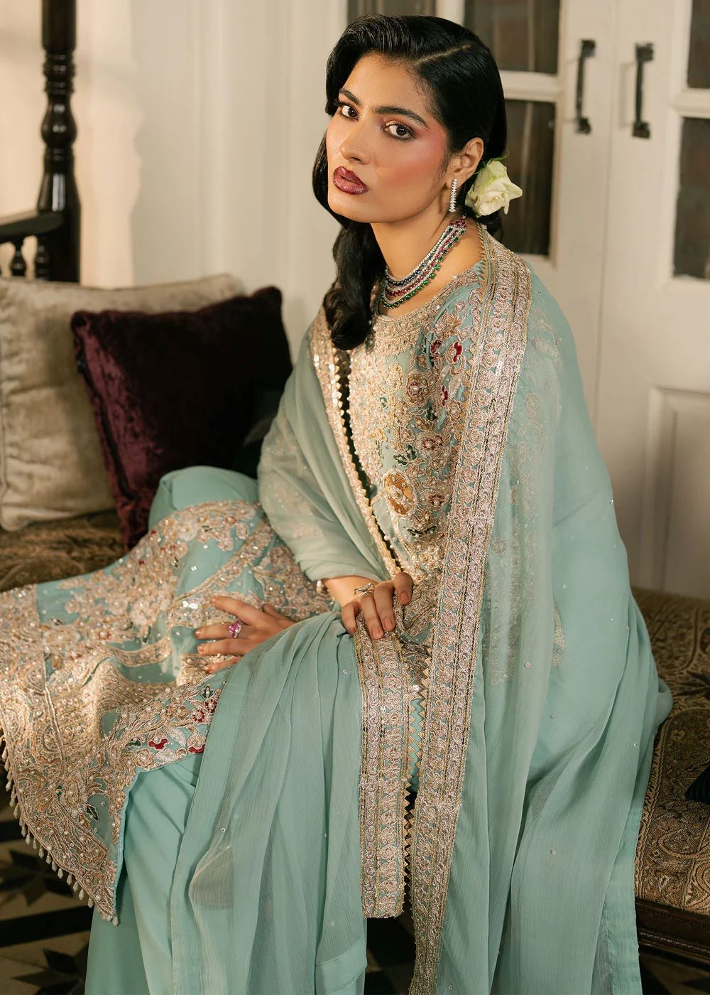 Sarveen — An aqua and silver ensemble crafted with filigree‑style embroidery that glimmers with every movement. The straight silhouette paired with embroidered trousers creates refined balance. The soft drape of the dupatta elevates the look into serene, poised elegance — a nawabzadi in quiet reflection.