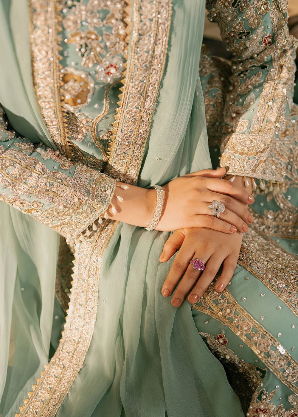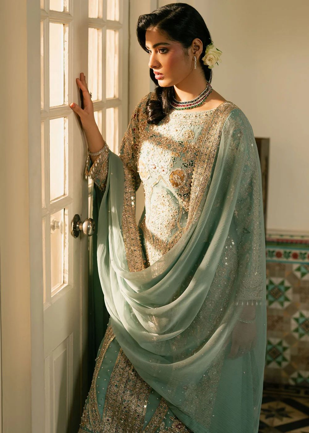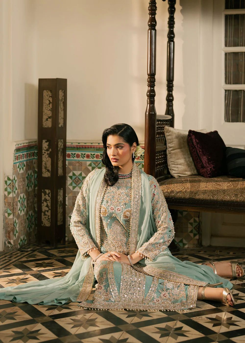 Sarveen — An aqua and silver ensemble crafted with filigree‑style embroidery that glimmers with every movement. The straight silhouette paired with embroidered trousers creates refined balance. The soft drape of the dupatta elevates the look into serene, poised elegance — a nawabzadi in quiet reflection.