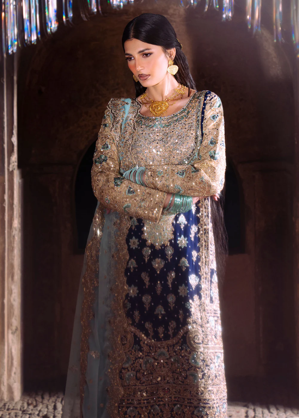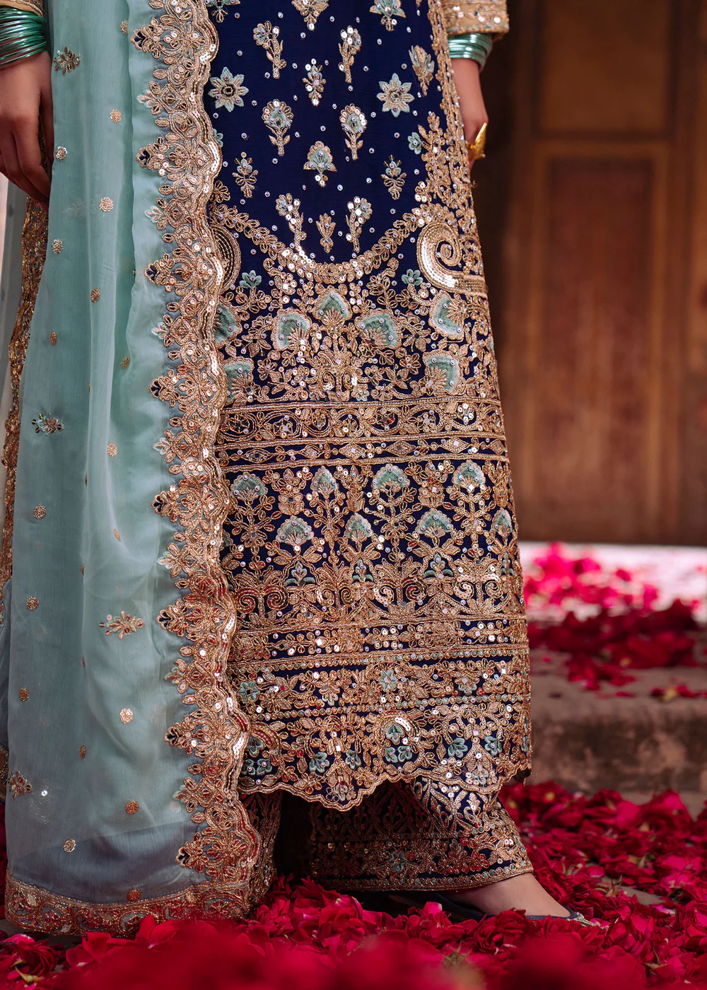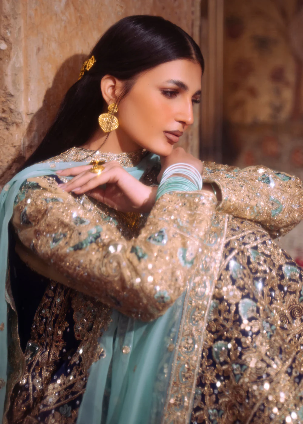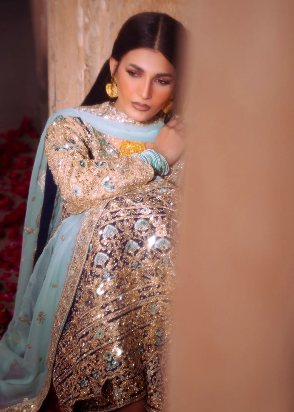 Shāhnaẓr is a statement navy ensemble richly embroidered with antique silver and gold detailing throughout the kameez and borders. The elongated silhouette enhances its regal presence, while the contrasting ice-blue dupatta softens the overall look. Designed for the center of attention, this ensemble commands admiration through its majestic craftsmanship.