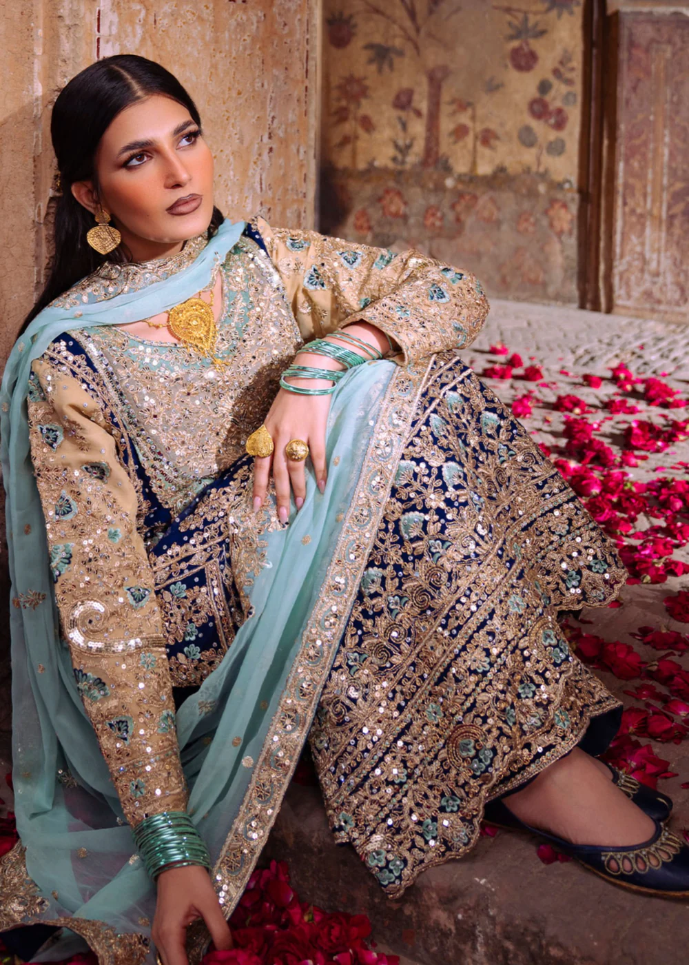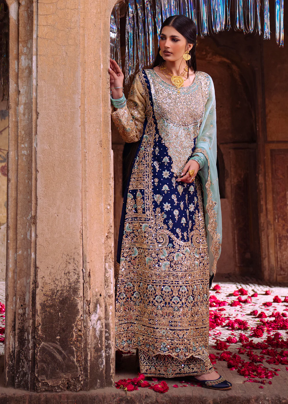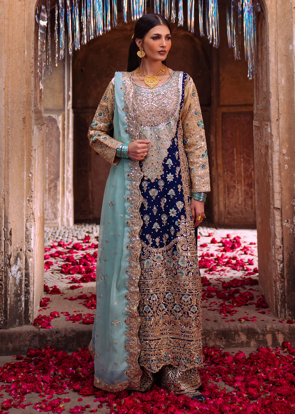 Shāhnaẓr is a statement navy ensemble richly embroidered with antique silver and gold detailing throughout the kameez and borders. The elongated silhouette enhances its regal presence, while the contrasting ice-blue dupatta softens the overall look. Designed for the center of attention, this ensemble commands admiration through its majestic craftsmanship.