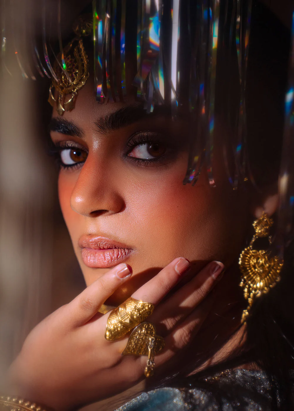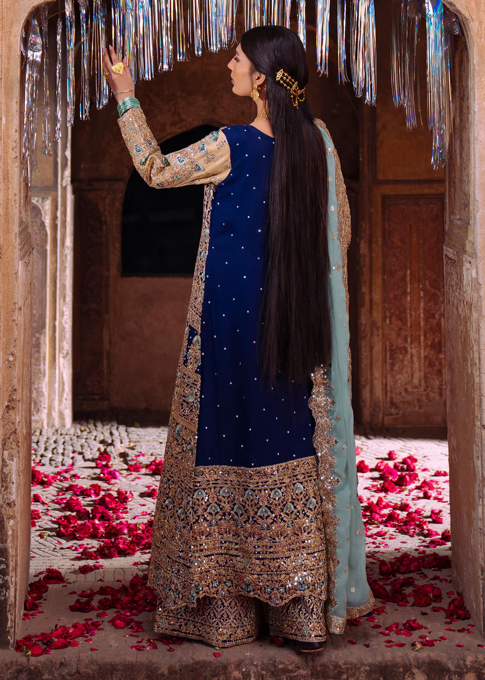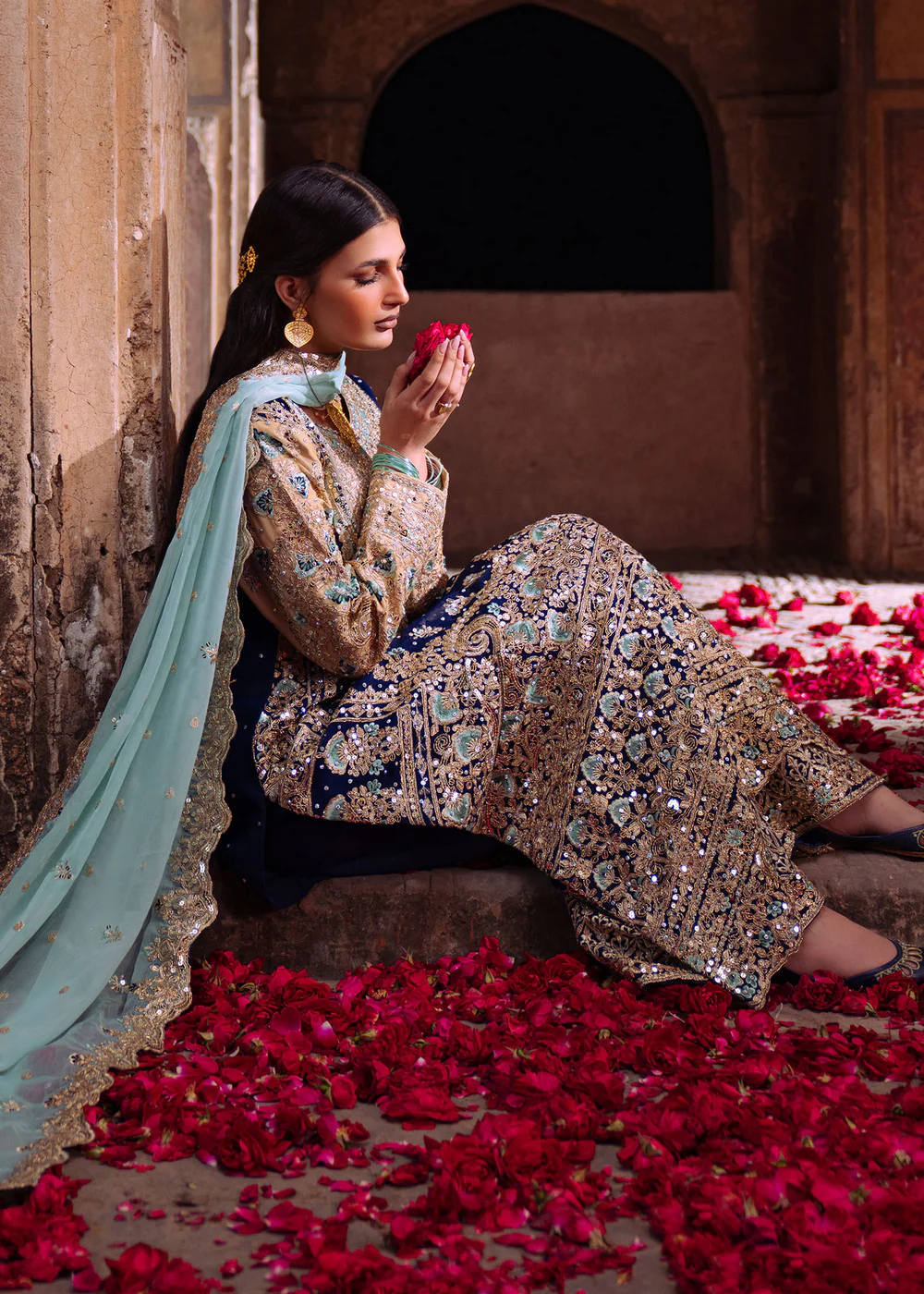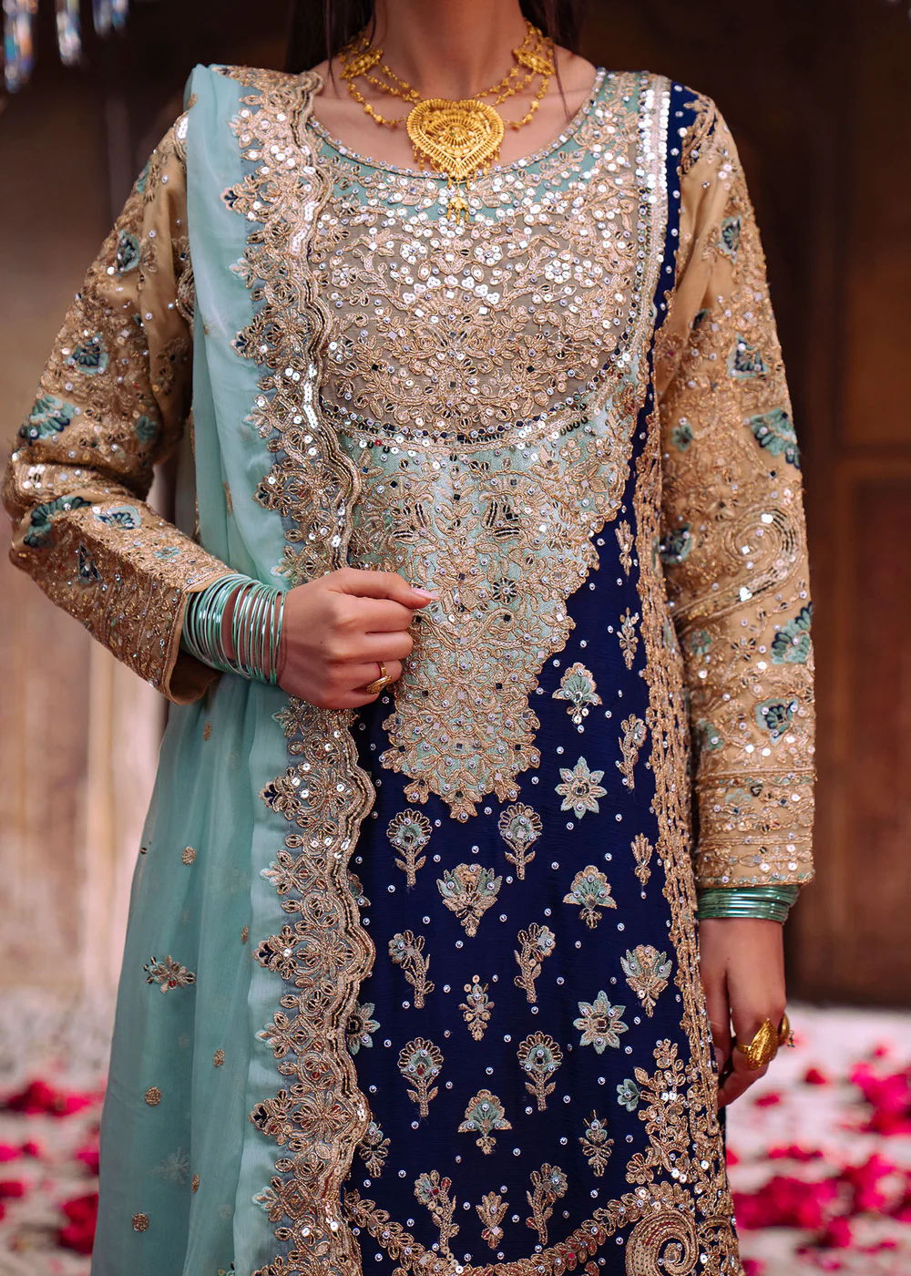 Shāhnaẓr is a statement navy ensemble richly embroidered with antique silver and gold detailing throughout the kameez and borders. The elongated silhouette enhances its regal presence, while the contrasting ice-blue dupatta softens the overall look. Designed for the center of attention, this ensemble commands admiration through its majestic craftsmanship.