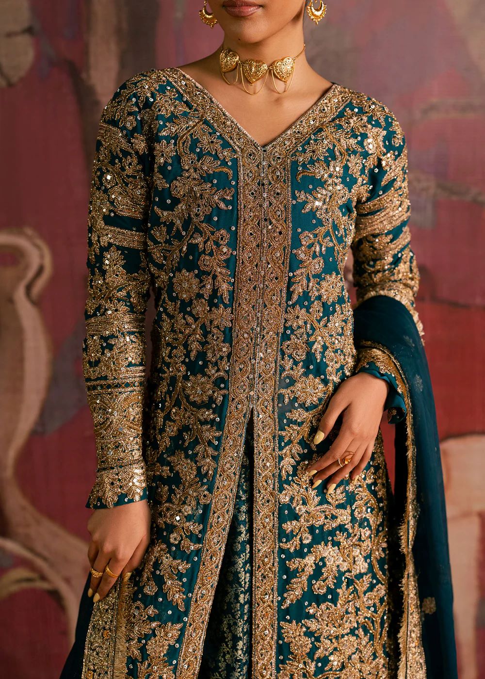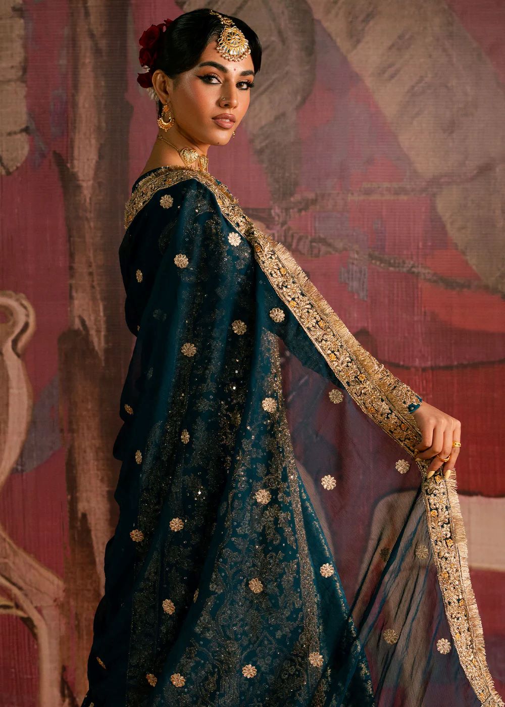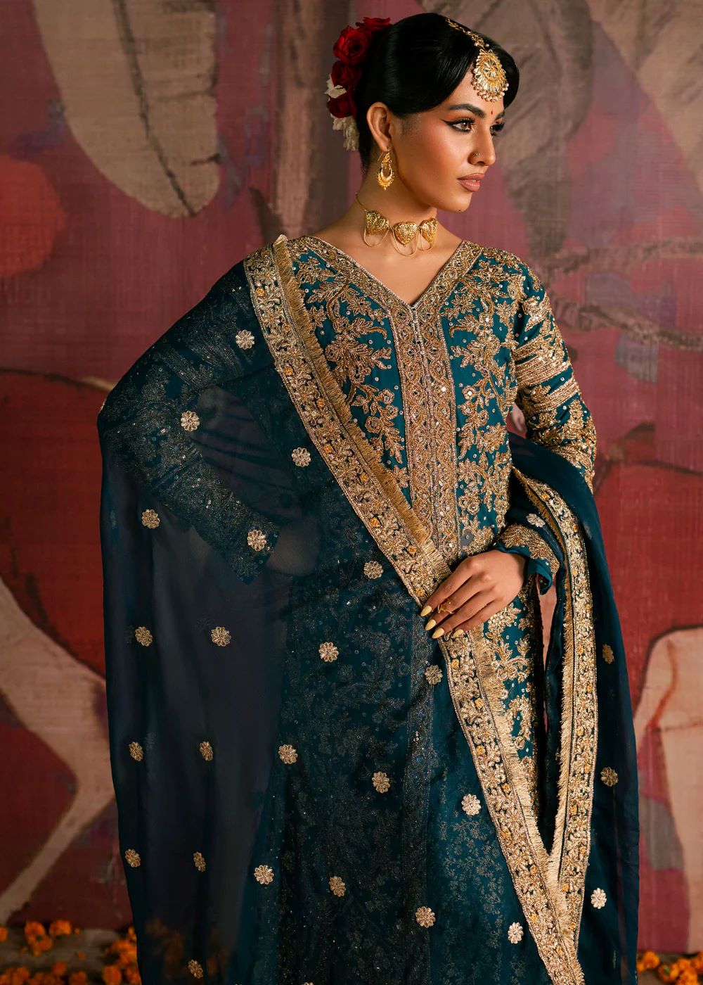 Inspired by turquoise tones, Feroza is crafted in rich teal hues with intricate embroidery flowing across the design. The detailing adds vibrancy while preserving balance and elegance. Paired with a flowing dupatta, this ensemble offers a festive yet refined statement.