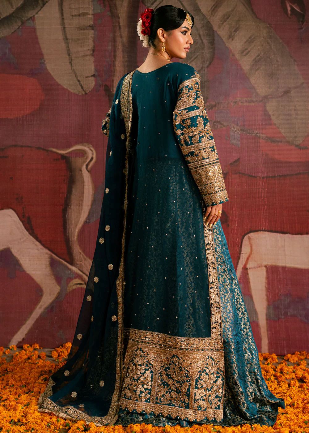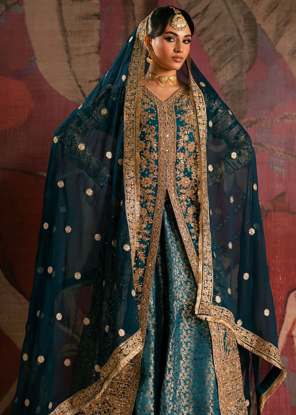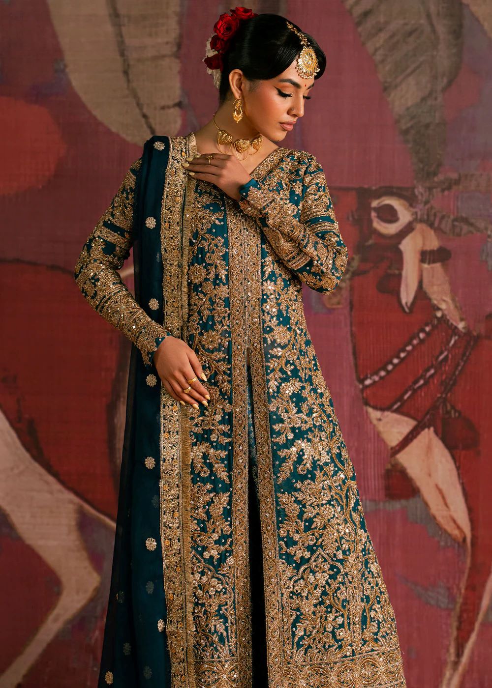 Inspired by turquoise tones, Feroza is crafted in rich teal hues with intricate embroidery flowing across the design. The detailing adds vibrancy while preserving balance and elegance. Paired with a flowing dupatta, this ensemble offers a festive yet refined statement.
