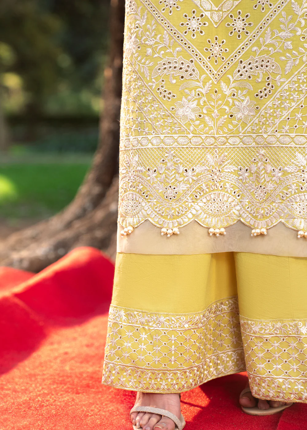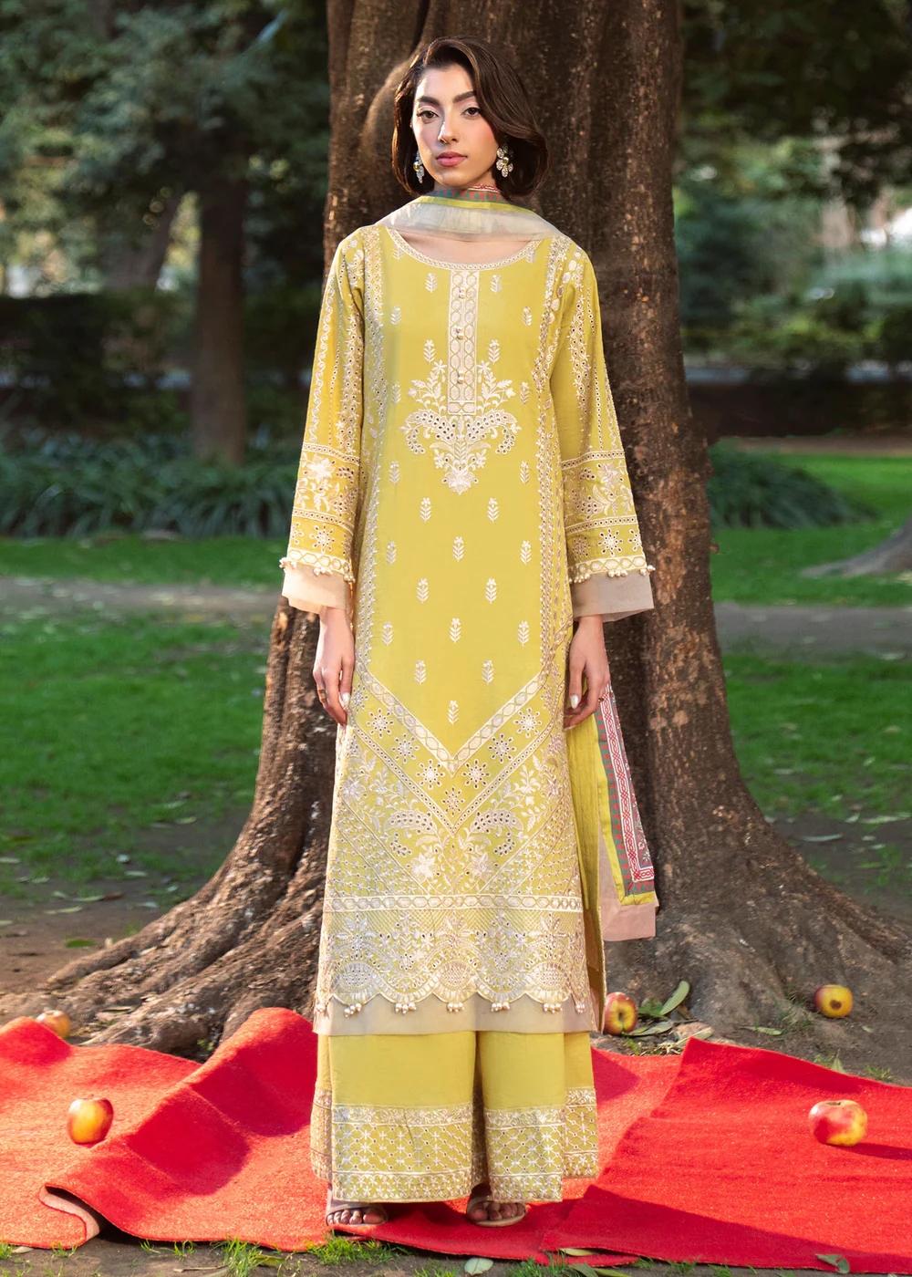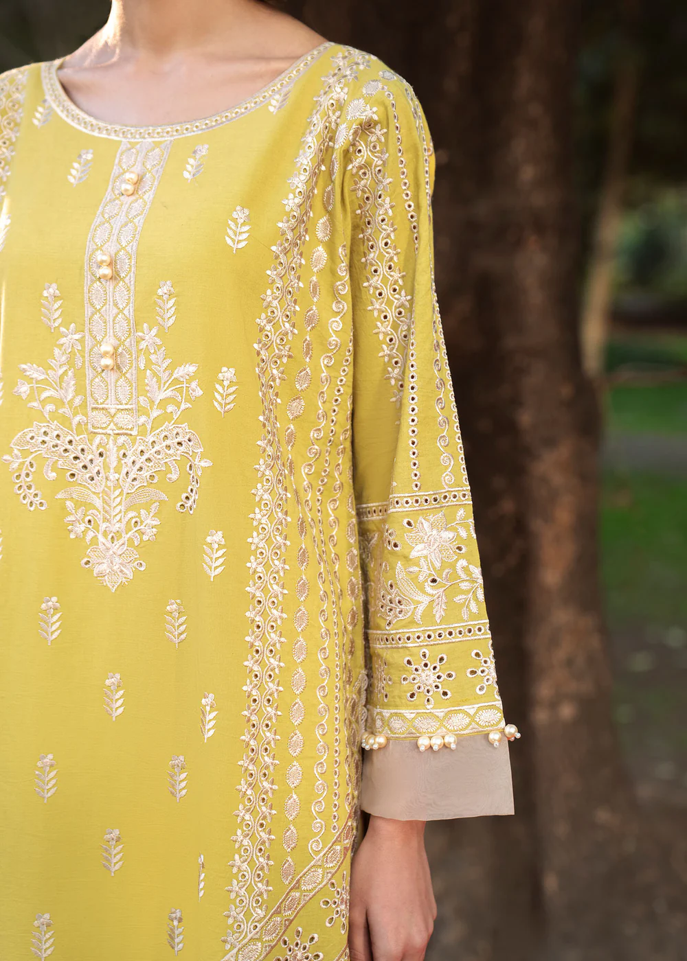 A radiant lime canvas brought to life with intricate ivory embroidery and ornate borders. Crafted in premium embroidered lawn with a lightweight chiffon dupatta and tailored cambric trousers, this ensemble captures effortless daytime festivity.