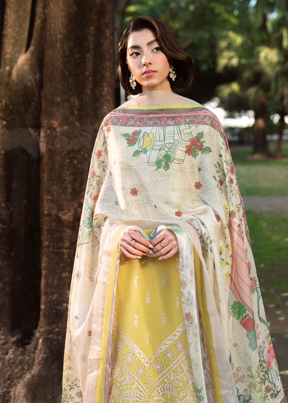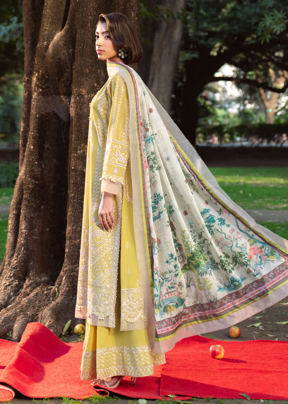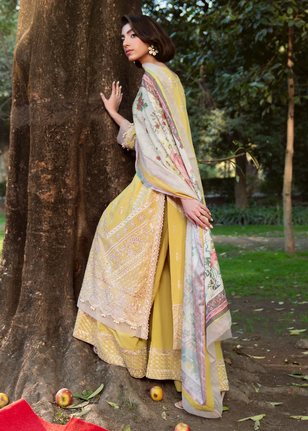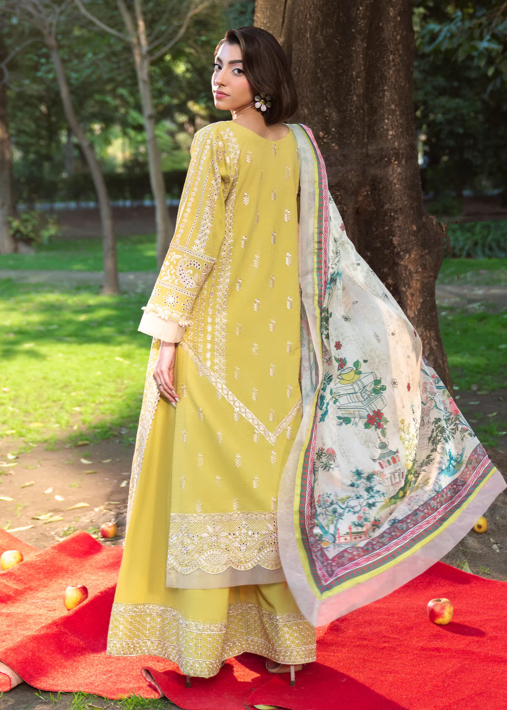 A radiant lime canvas brought to life with intricate ivory embroidery and ornate borders. Crafted in premium embroidered lawn with a lightweight chiffon dupatta and tailored cambric trousers, this ensemble captures effortless daytime festivity.