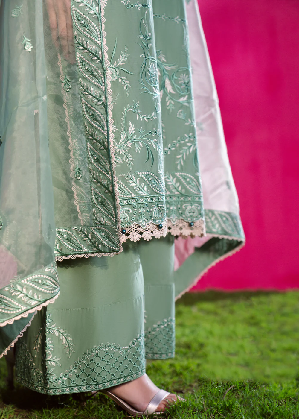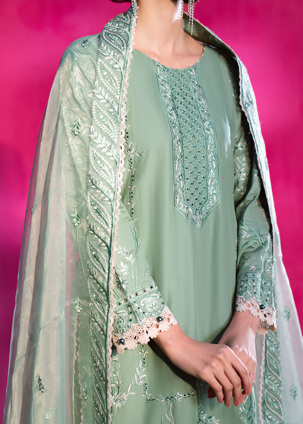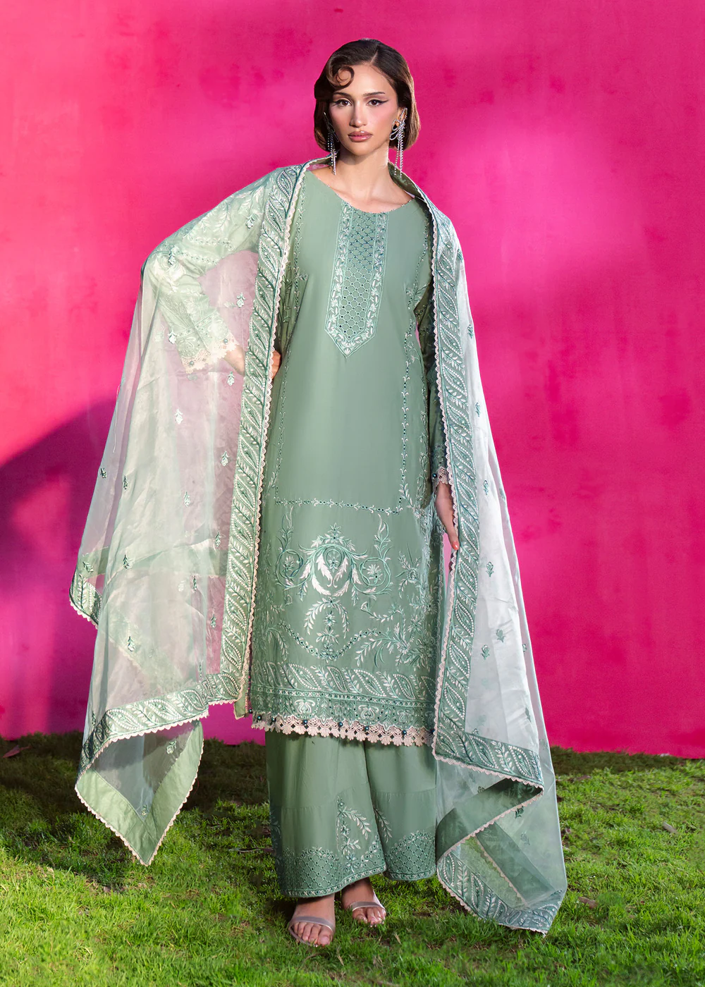 Misty grey adorned with painterly florals and refined lace accents. The statement dupatta adds romantic movement.