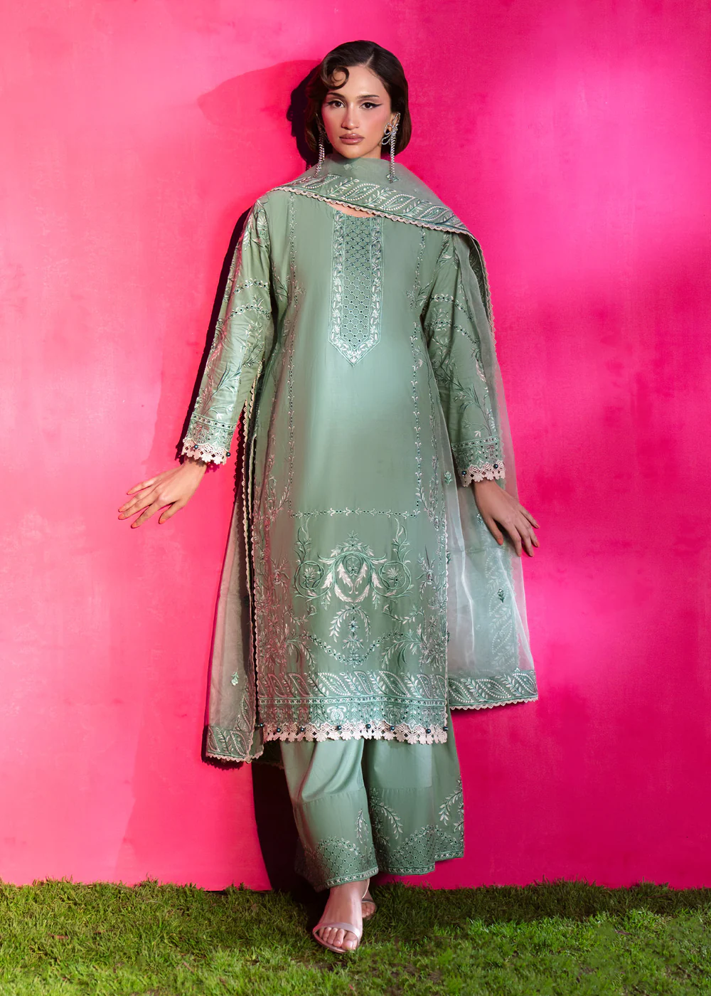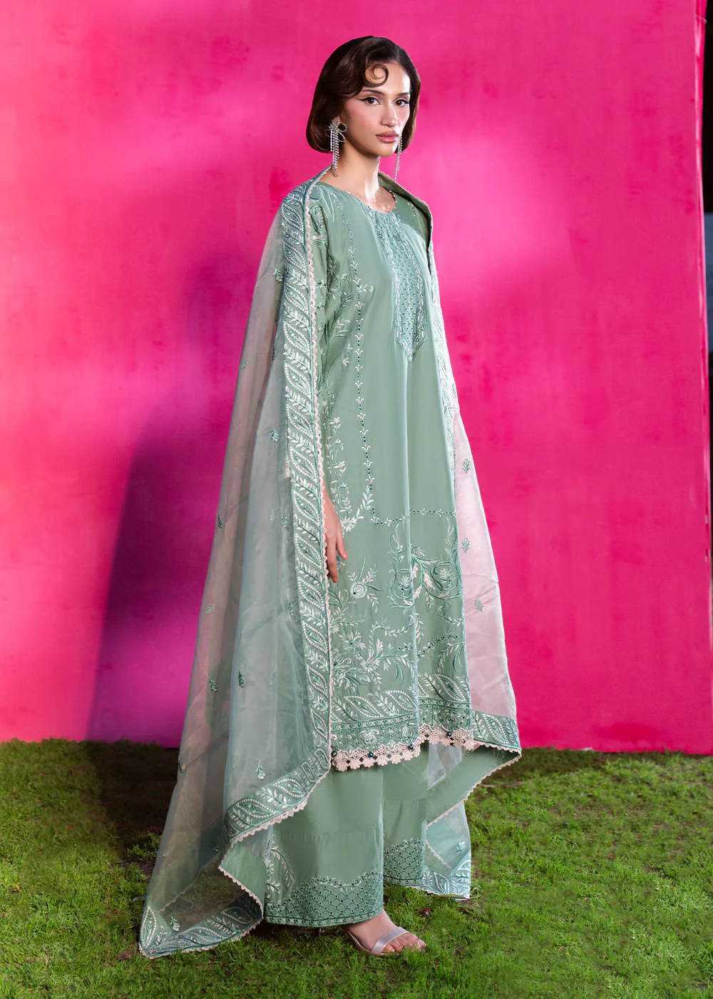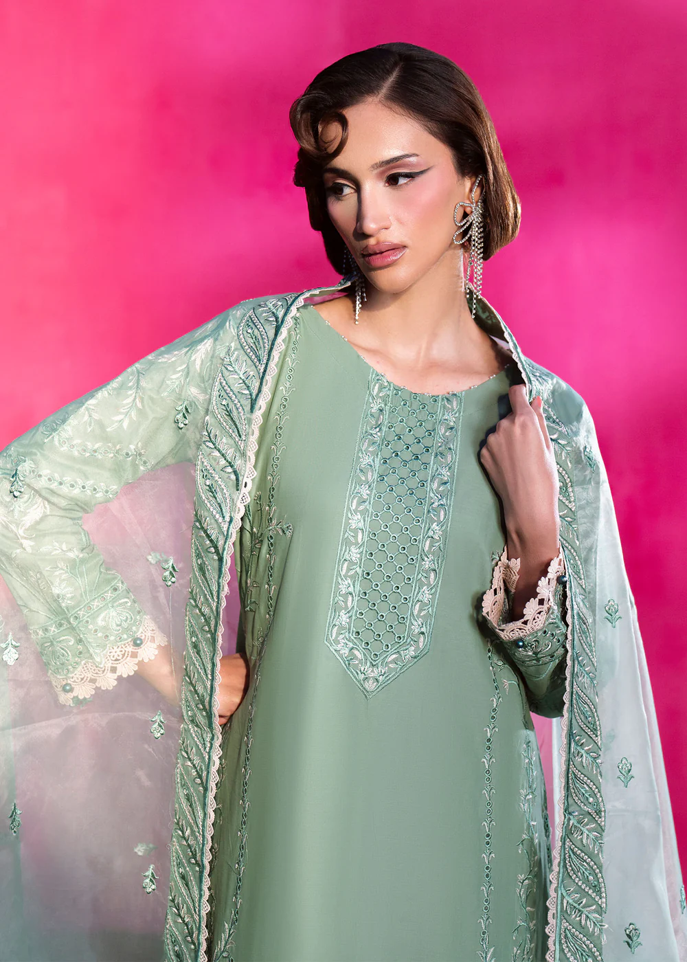 Misty grey adorned with painterly florals and refined lace accents. The statement dupatta adds romantic movement.