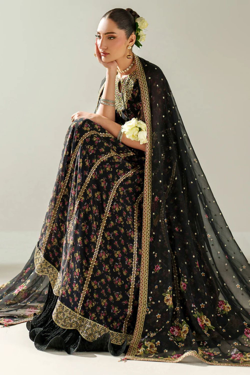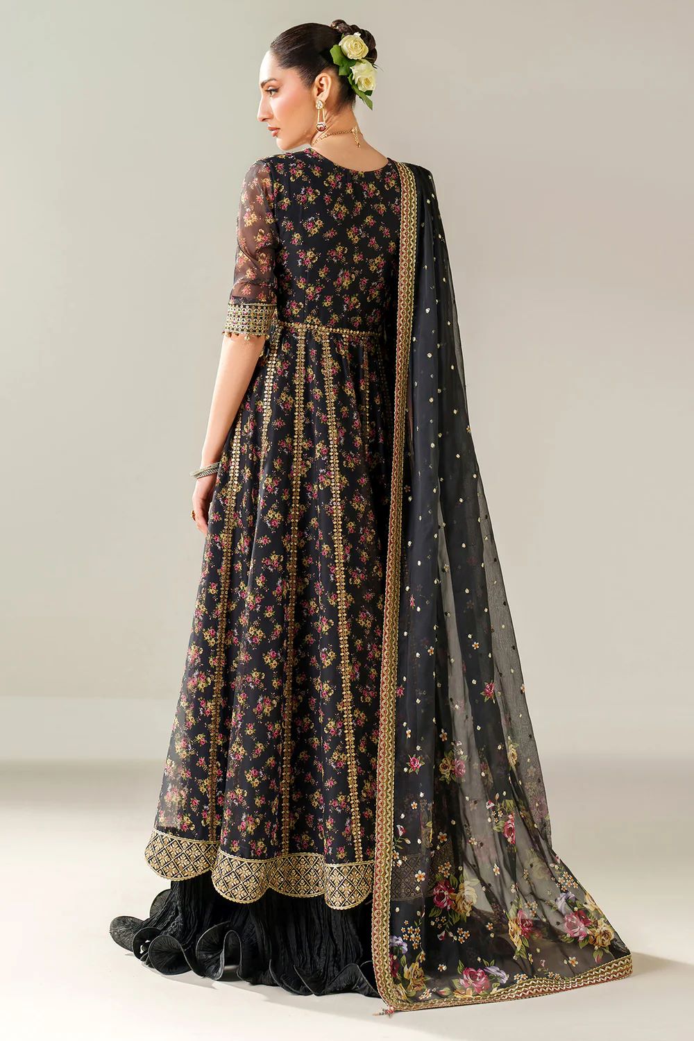 This embroidered chiffon ensemble features digitally printed and intricately embroidered chiffon panels on the front yoke, back, and sleeves, complemented by detailed embroidered borders. The dupatta showcases matching digital prints with an embroidered border, enhancing its elegance. The dyed raw silk bottom and bottom crush add a refined texture, creating a sophisticated and cohesive look ideal for formal occasions.