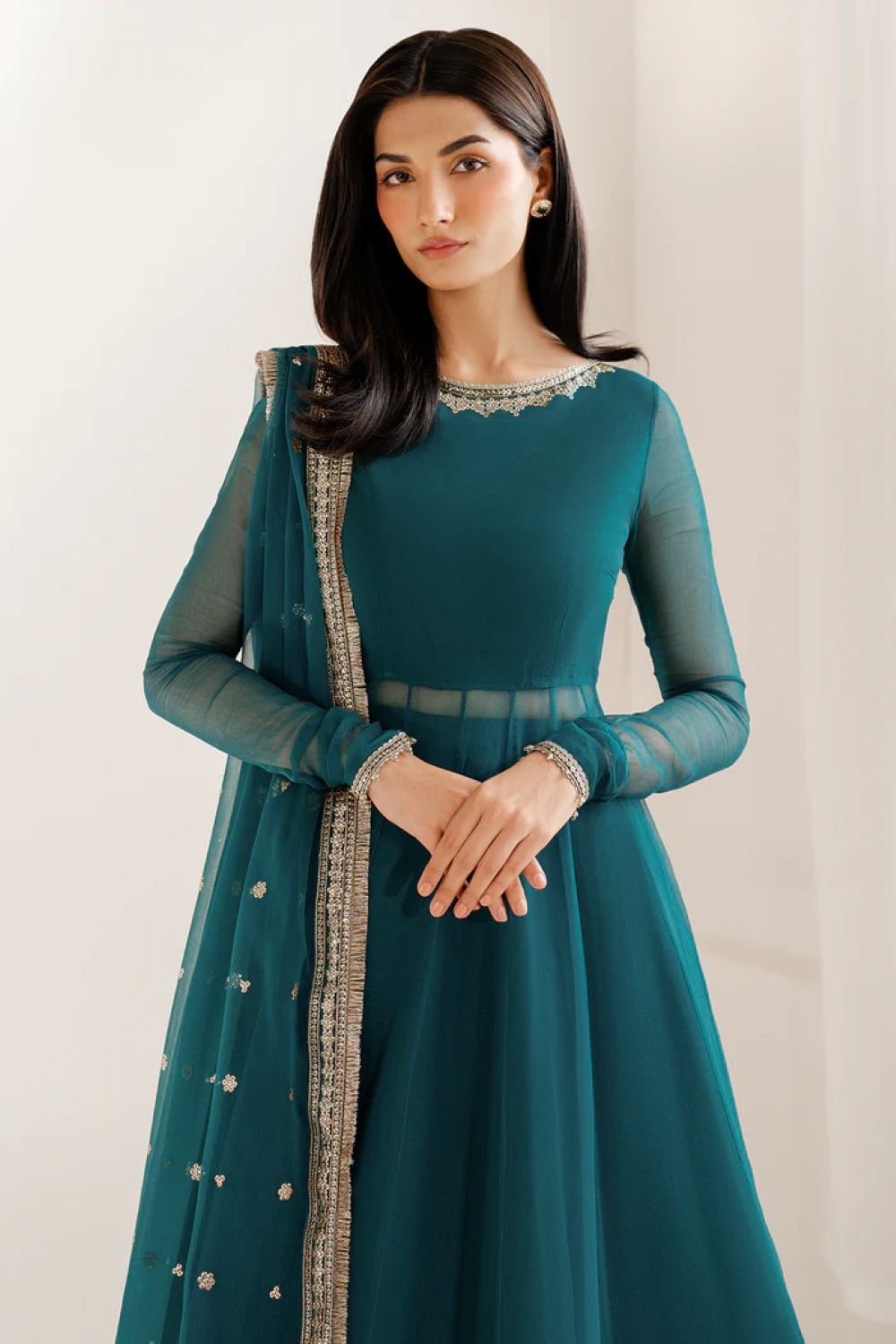 This exquisite embroidered chiffon ensemble combines delicate craftsmanship with luxurious fabrics. Featuring intricately embroidered chiffon on the front yoke, panels, sleeves, and borders, it offers a refined and elegant appearance. The dyed chiffon sleeves and back yoke add subtle contrast, while the embroidered chiffon dupatta with matching borders complements the look. The ensemble is completed with a dyed raw silk bottom, providing a graceful and sophisticated finish suitable for special occasions.