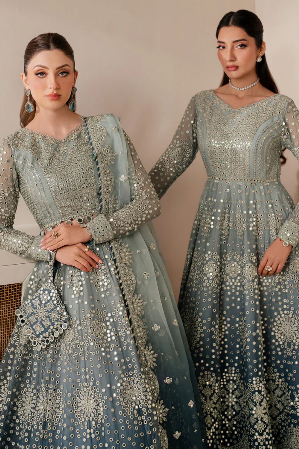 This exquisite embroidered chiffon ensemble features intricately detailed front and back yokes, panels, and sleeves, all showcasing fine embroidery. The borders on the front, back, and sleeves enhance its refined design. Complemented by a digitally printed raw silk shaded lining, the outfit offers comfort and subtle elegance. Completing the look is an embroidered organza shaded dupatta with matching borders, perfectly balancing sophistication and style for any discerning wardrobe.