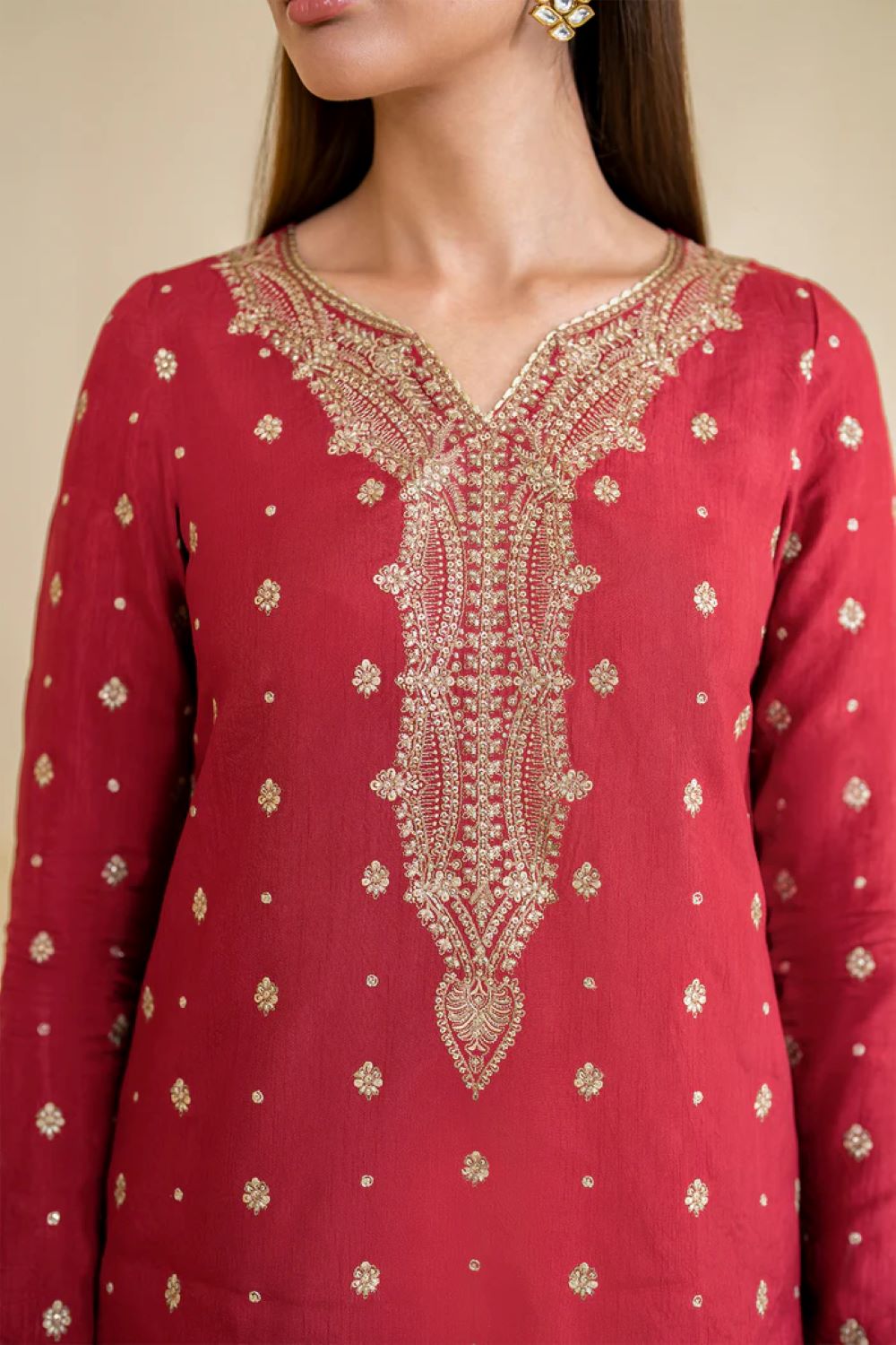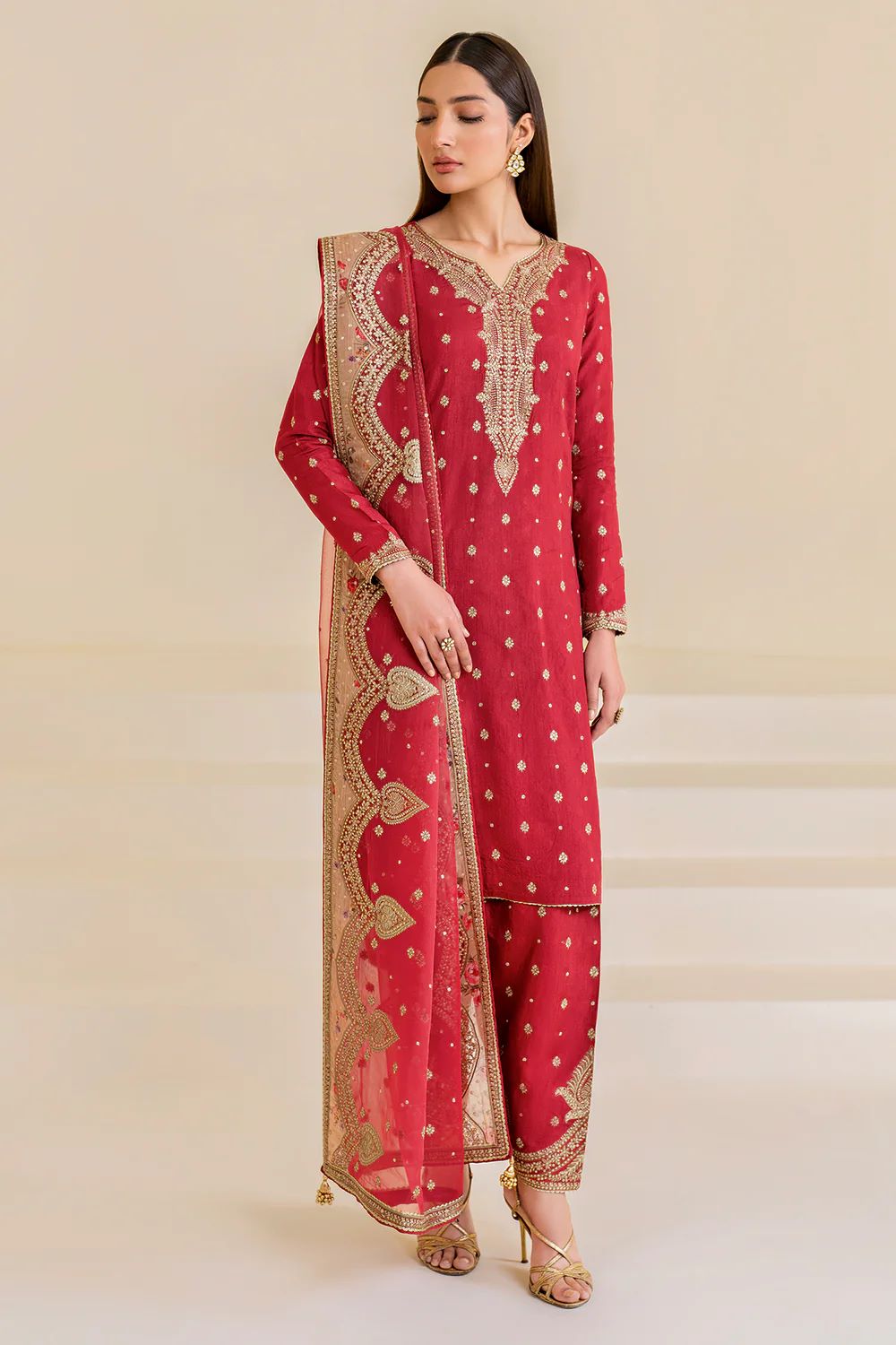 Elevate your style with our Embroidered Raw Silk UR-7047. Crafted from high-quality Korean Rawsilk, this ensemble features intricate embroidery on the front, sleeves, and back, as well as a matching Organza Dupatta. Complete the look with our Korean Rawsilk Trouser. Expertly designed for a sophisticated and elegant look.