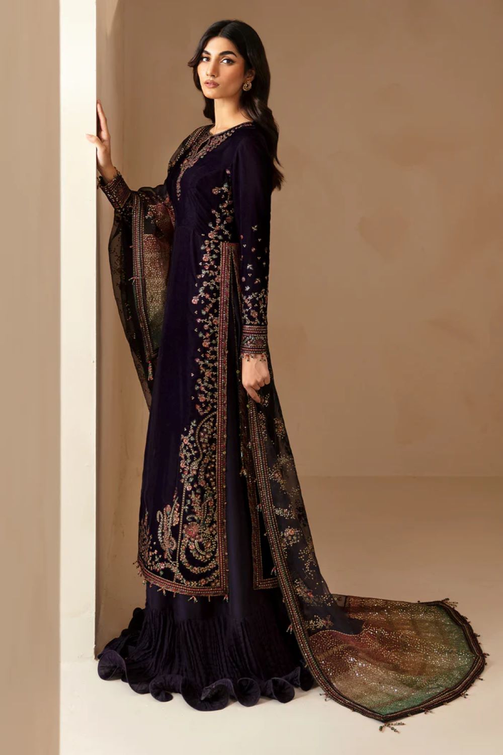 Upgrade your formal wardrobe with the elegant Embroidered Velvet Formal VF-2027. The pure velvet front yoke, sleeves, and front & back border feature delicate embroidery, while the organza dupatta and pallu are digitally printed with intricate designs. The luxurious velvet back and dyed rawsilk bottom complete the sophisticated look.