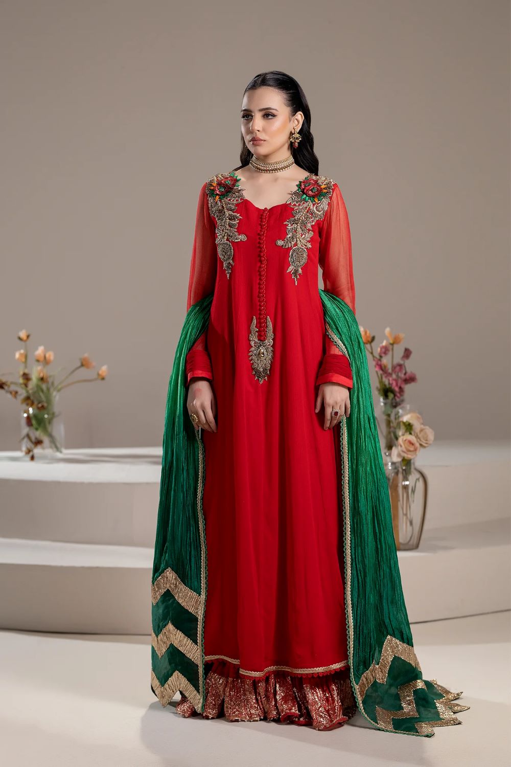- Shirt: Crinkle Chiffon (Hand Embroidered with Kora, Dabka, Gotta, Stones etc 3d Work)
