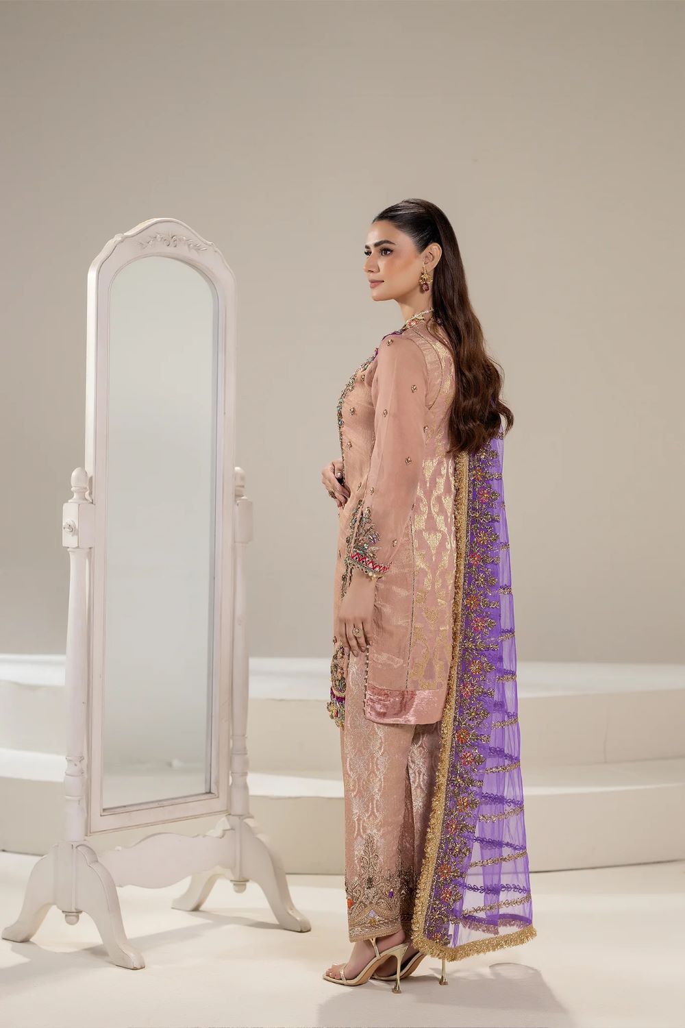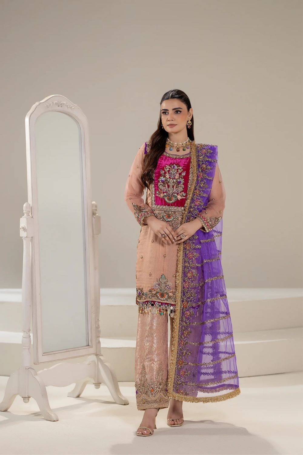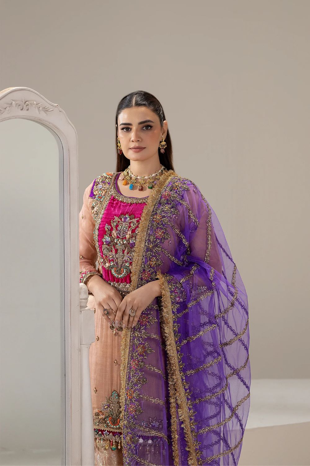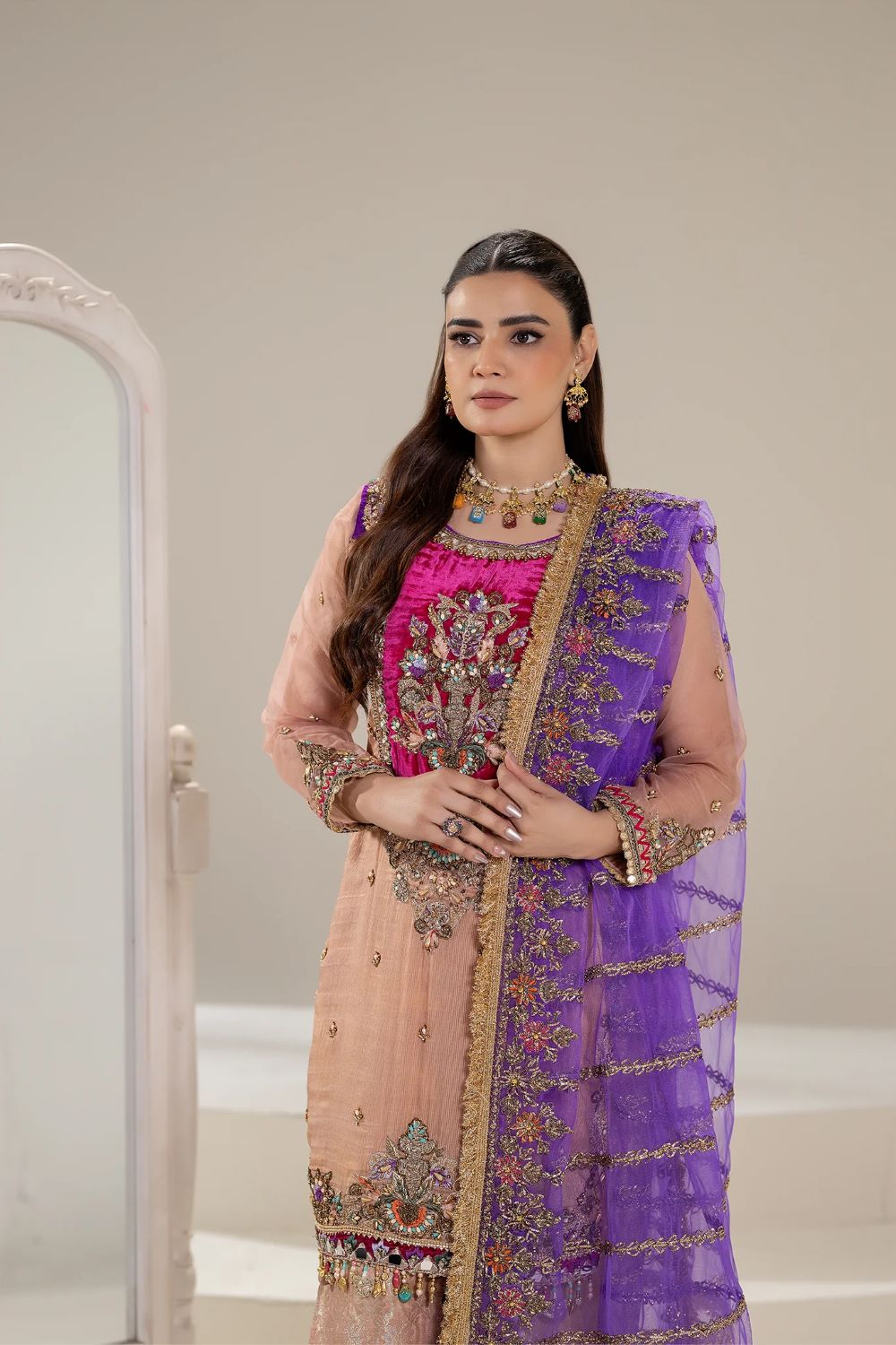 - Sleeves: Pure Nylon Organza (Hand Embroidered with Kora, Dabka, Gotta, Stones, Pearls, Embellishments, Gota & Tilla)