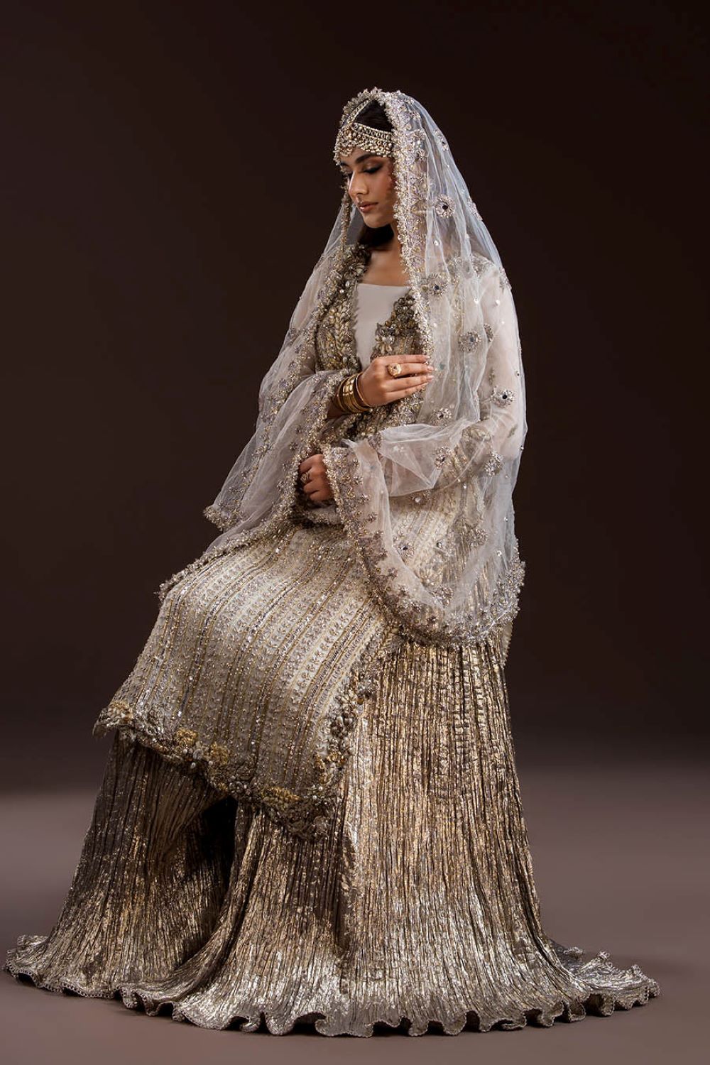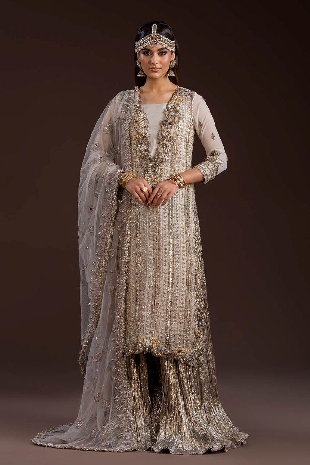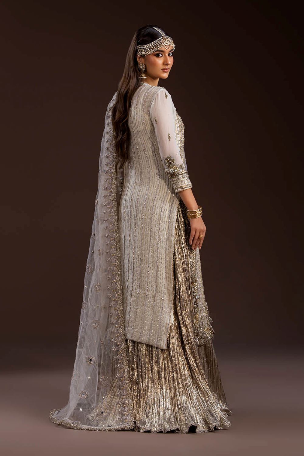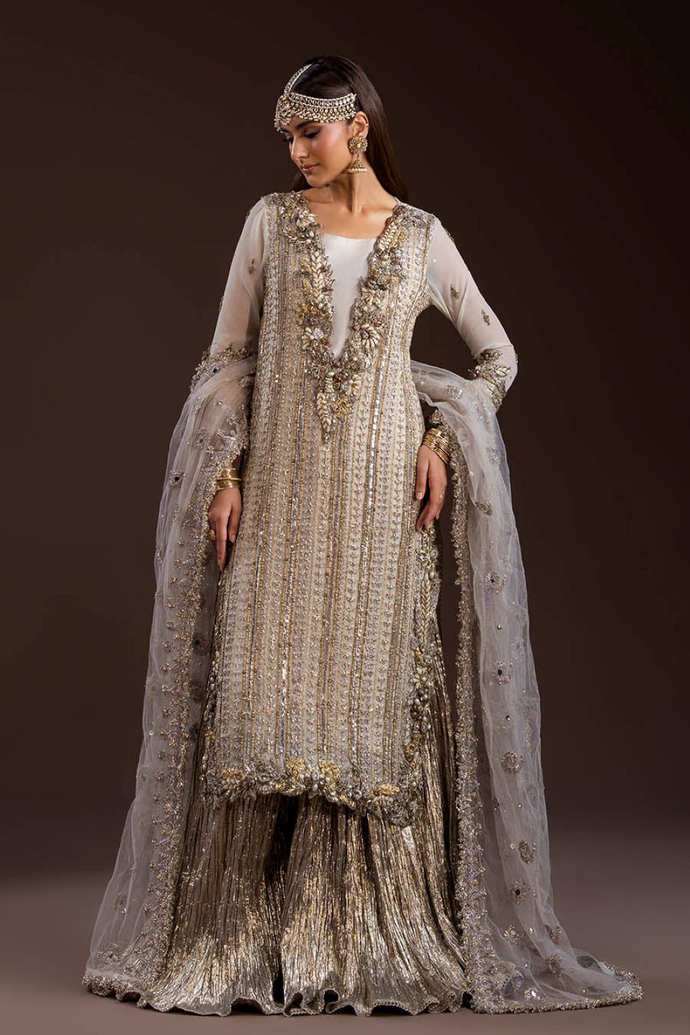 Shirt: Crinkle Chiffon (hand-embroidered with Gotta, Kora, Dabka, sequins, pearls & stones)