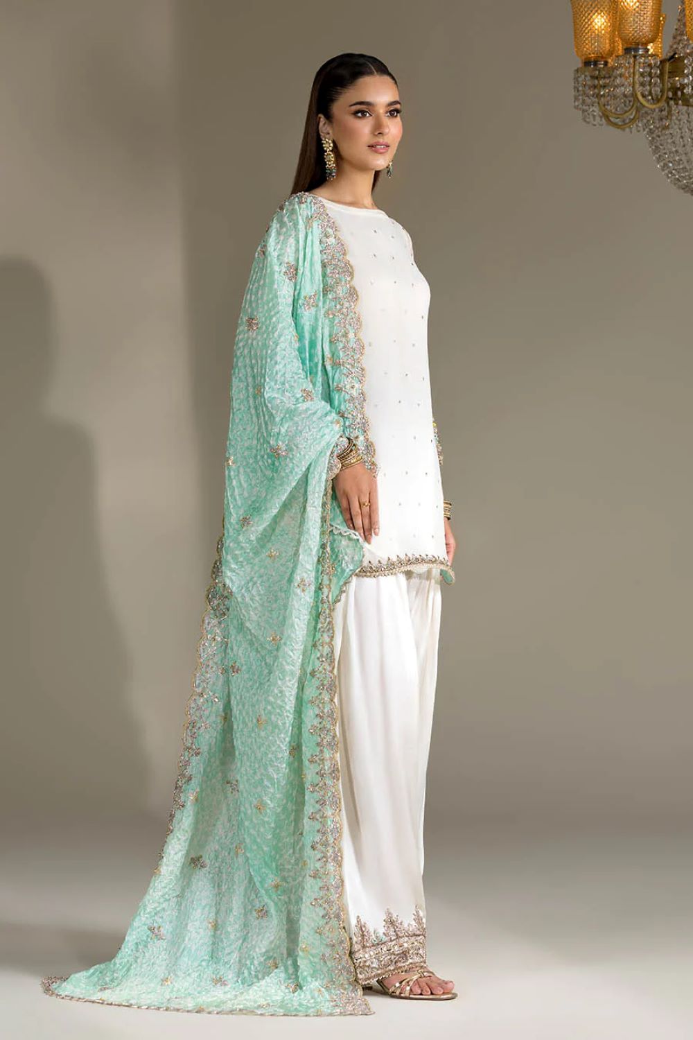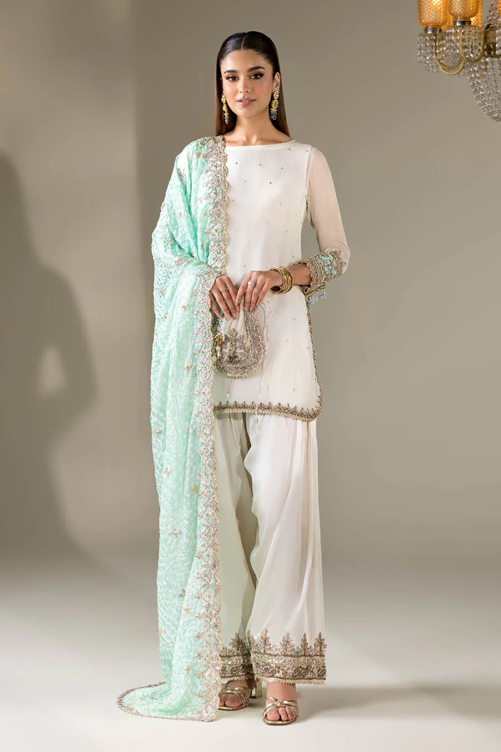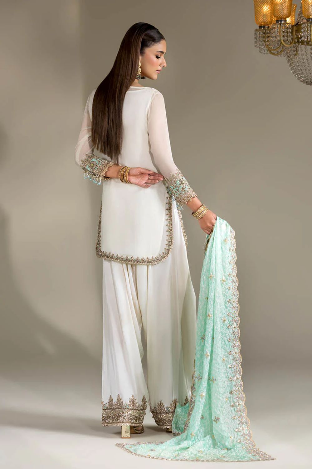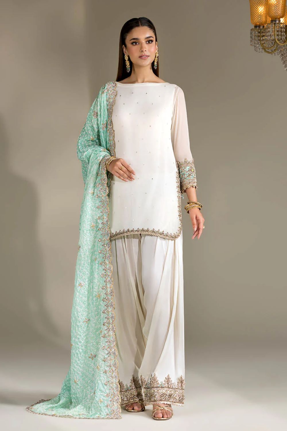 Shirt: Crinkle Chiffon hand-embroidered (Kora, dabka & Gotta work)