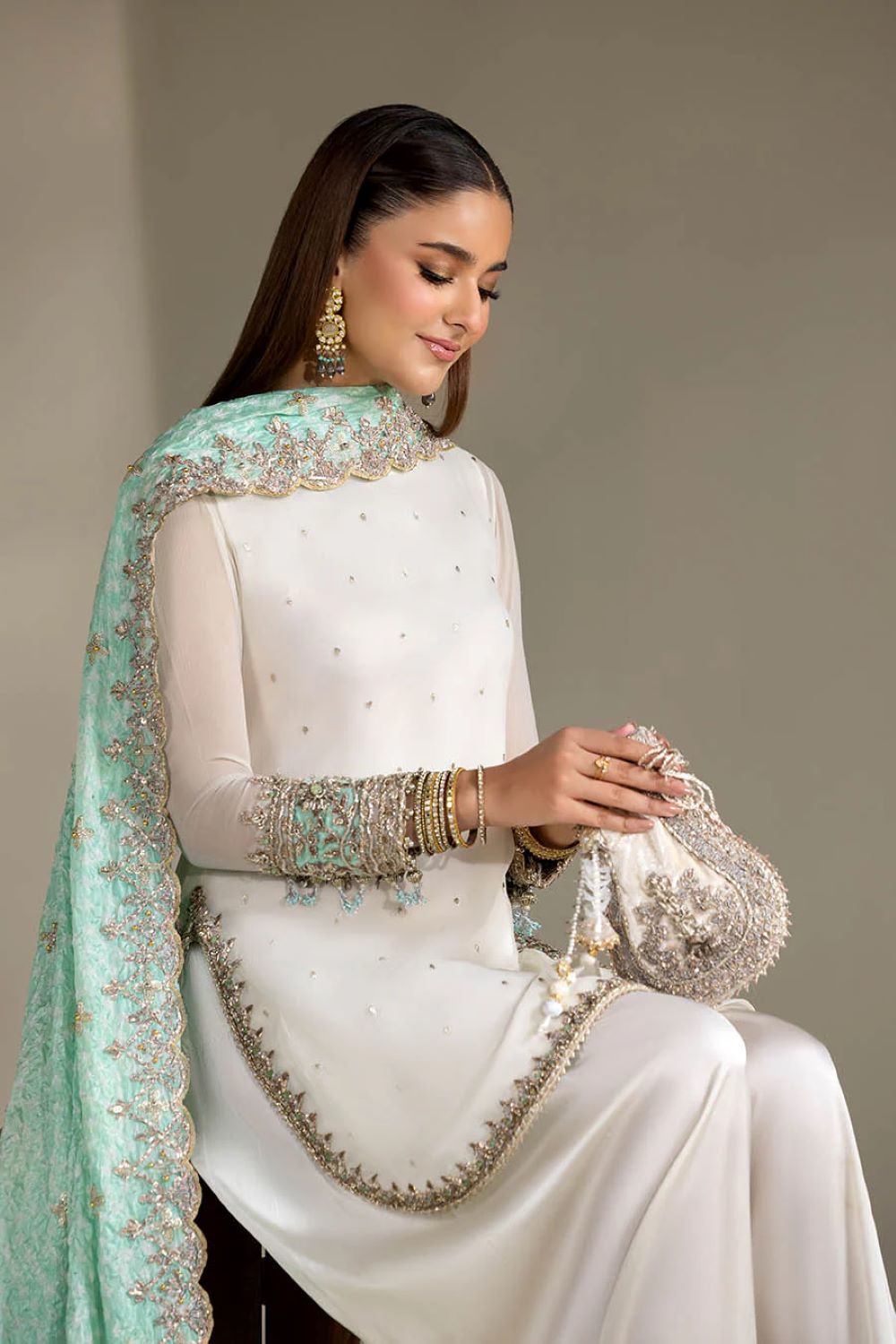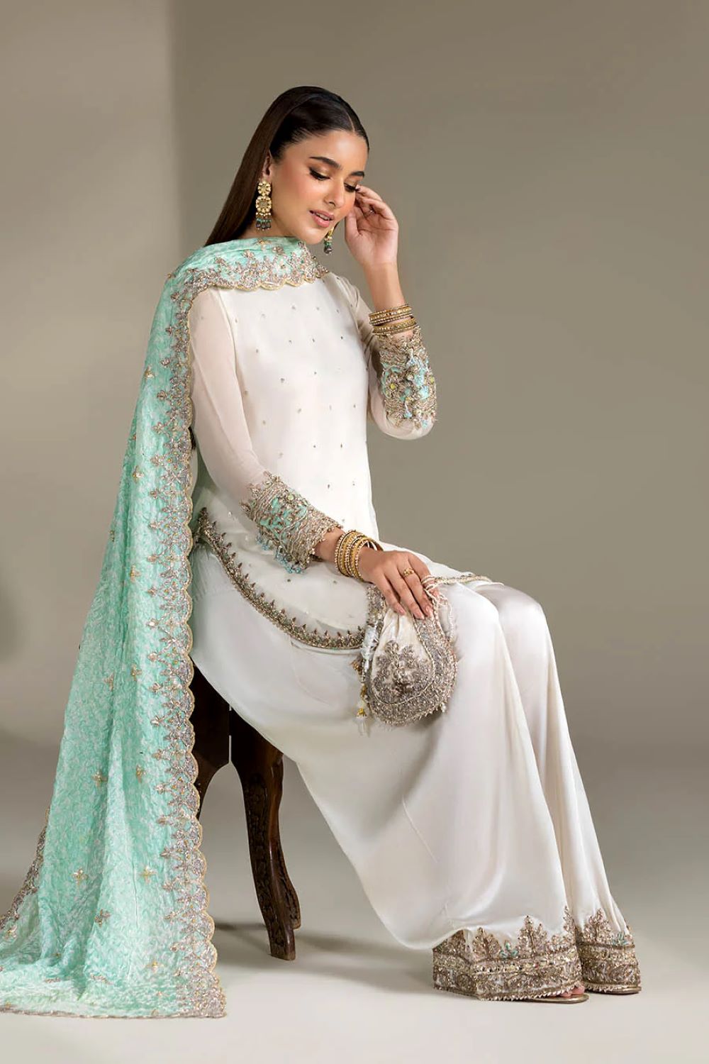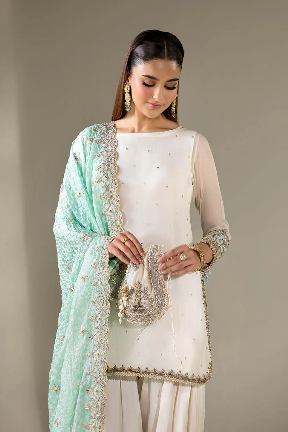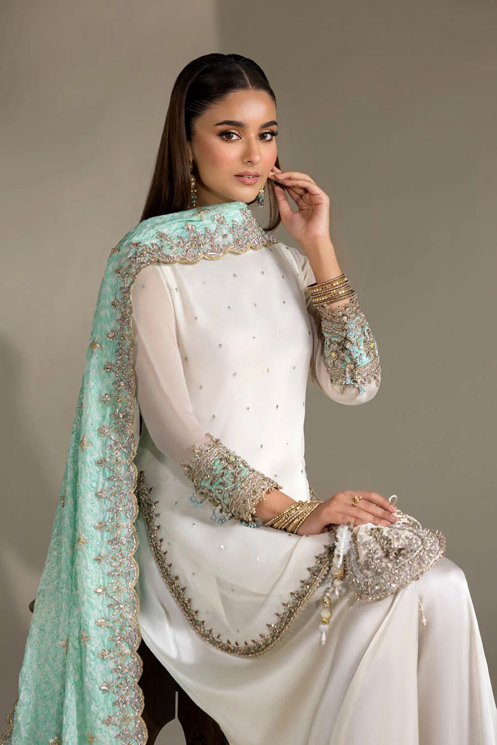 Shirt: Crinkle Chiffon hand-embroidered (Kora, dabka & Gotta work)