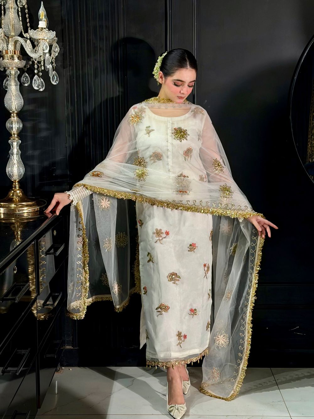 - Dupatta: Pure Net (Embroidered with Gota, Tilla, Pearls, Embellishments & Laces)