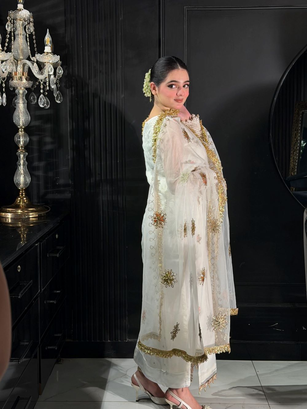 - Sleeves: Same as shirt (Embroidered with Gota, Tilla, Resham, Thread, Sitara Work)
