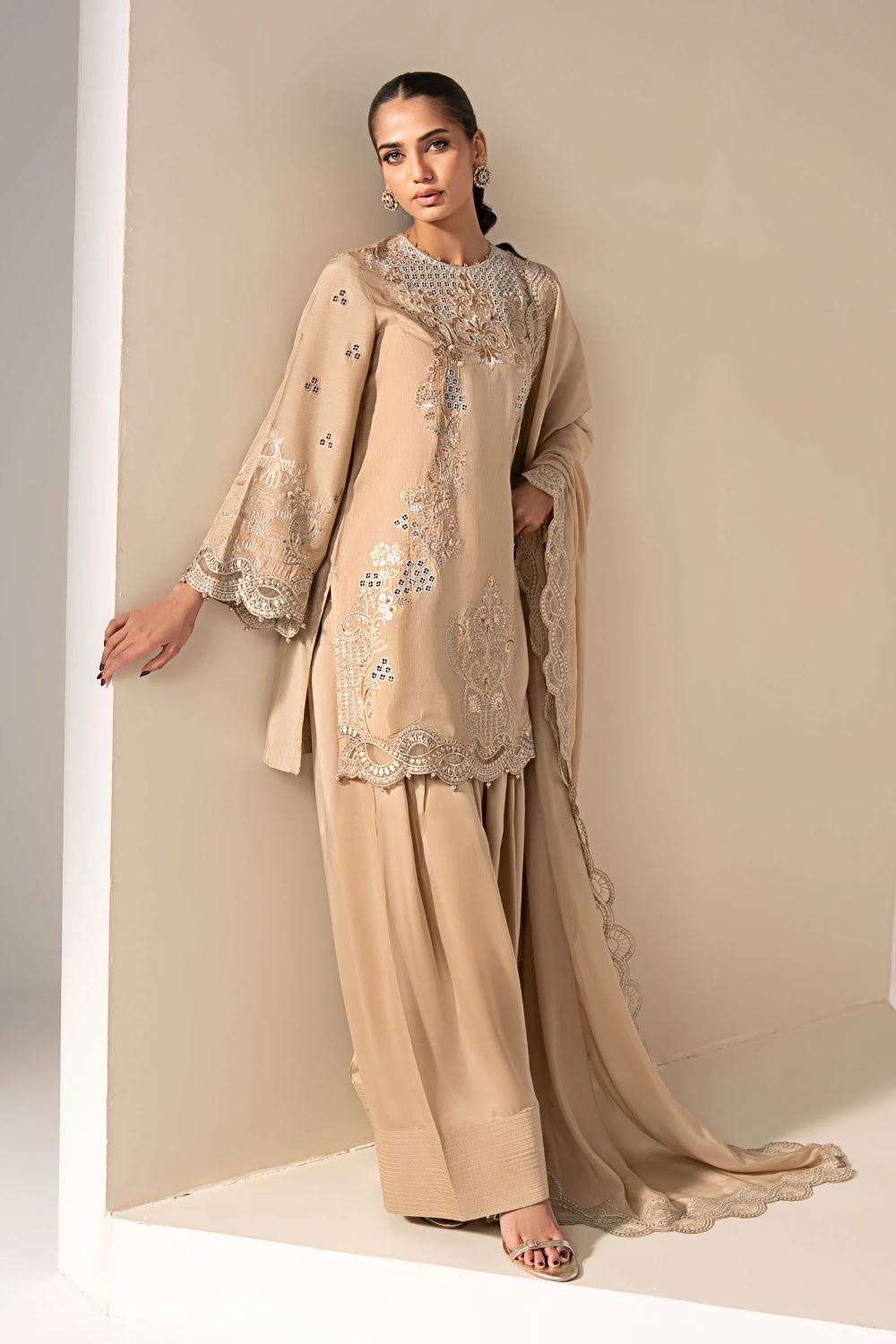 Pearl Drops Detailing On Neckline, Border & Sleeves