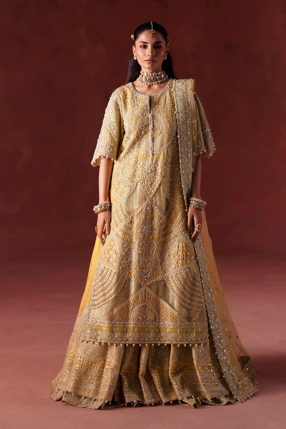 Radiate festive charm in our Yellow 3-Piece Pret Ensemble, exquisitely tailored in luxurious Korian Silk for both the shirt and lehenga. The fully embroidered shirt features delicate adda work paired with elegant net fabric appliqués, while the round neckline sparkles with embellished edging and playful pearl-hanging tassels. Chic cape-style embroidered sleeves add a modern flair, enriched with intricate adda detailing. The voluminous flared lehenga boasts a heavily embroidered hem, beautifully finished with pearls along the edge for a graceful, luminous touch. Completing the look, the bareeze net dupatta is adorned with an all-over embroidery spray and four-sided embroidered borders, creating a perfectly polished festive silhouette.