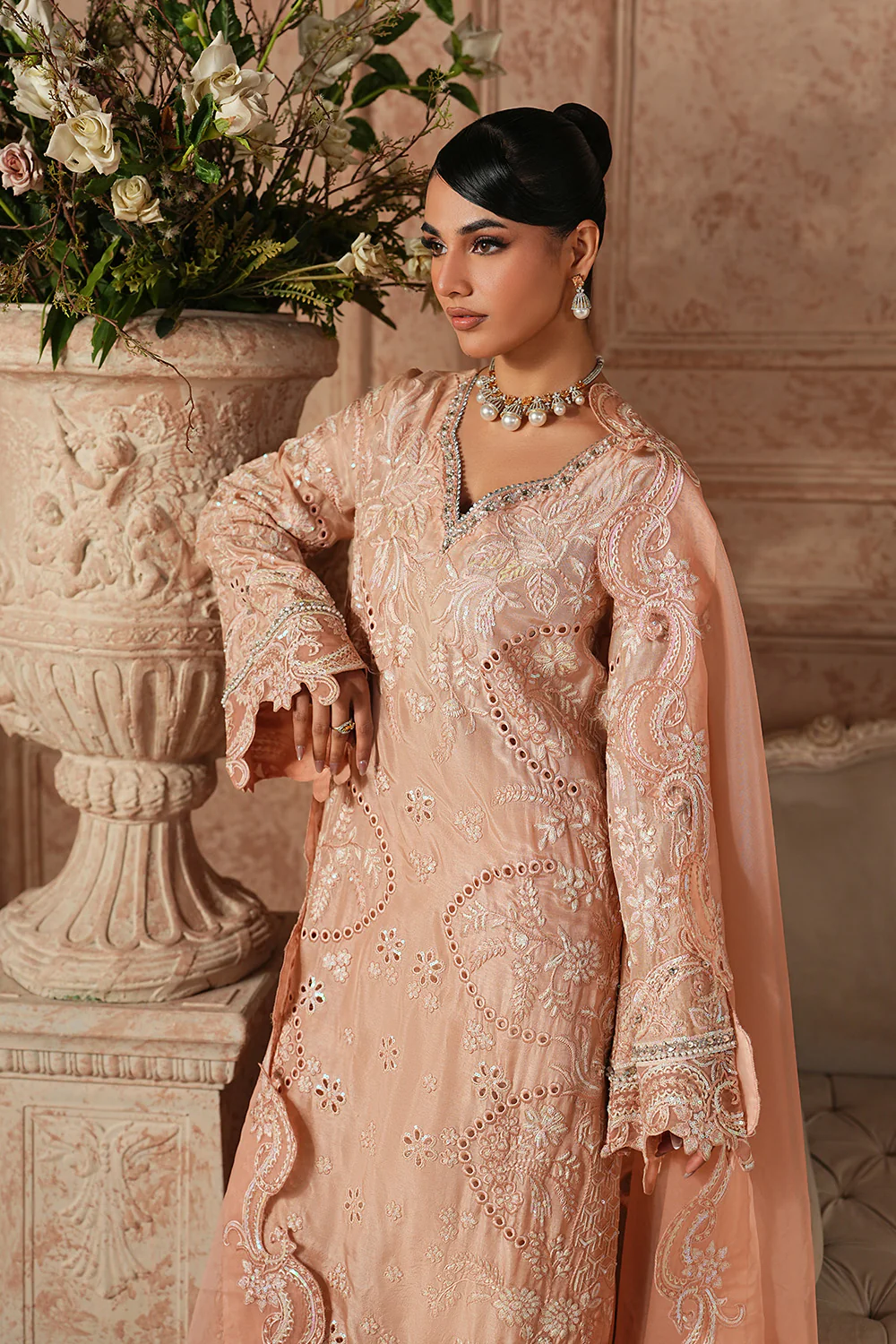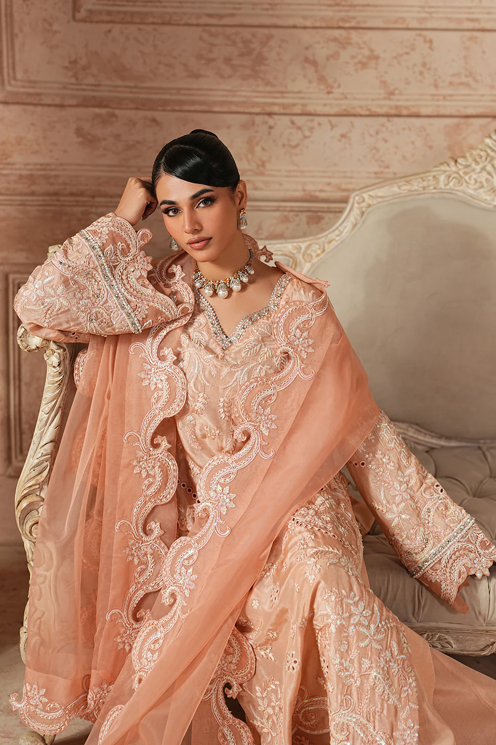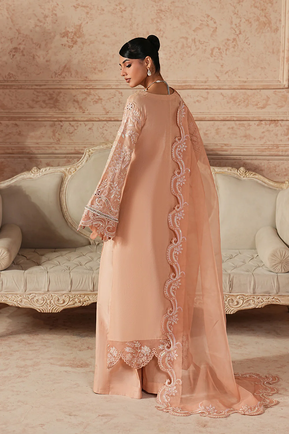 Embrace regal sophistication with this stunning 3-piece pret in an opulent Gold Earth tone. Crafted from luxurious Organza Silk, the fully embroidered shirt features a scalloped V-neck adorned with intricate adda work, borreing, and sequin details, finished with a delicately scalloped embroidered hem. Flared sleeves with scallop cuffs and a flowing flared trouser create a graceful silhouette. The ethereal Organza dupatta, framed with four-sided scalloped embroidered borders, completes this statement of timeless elegance.
