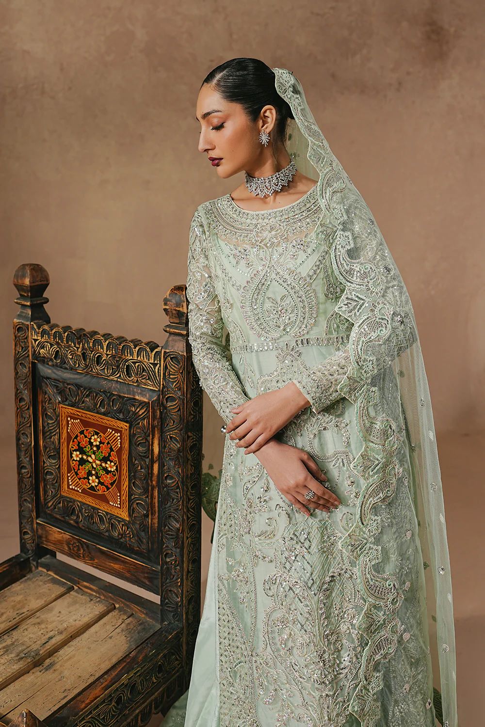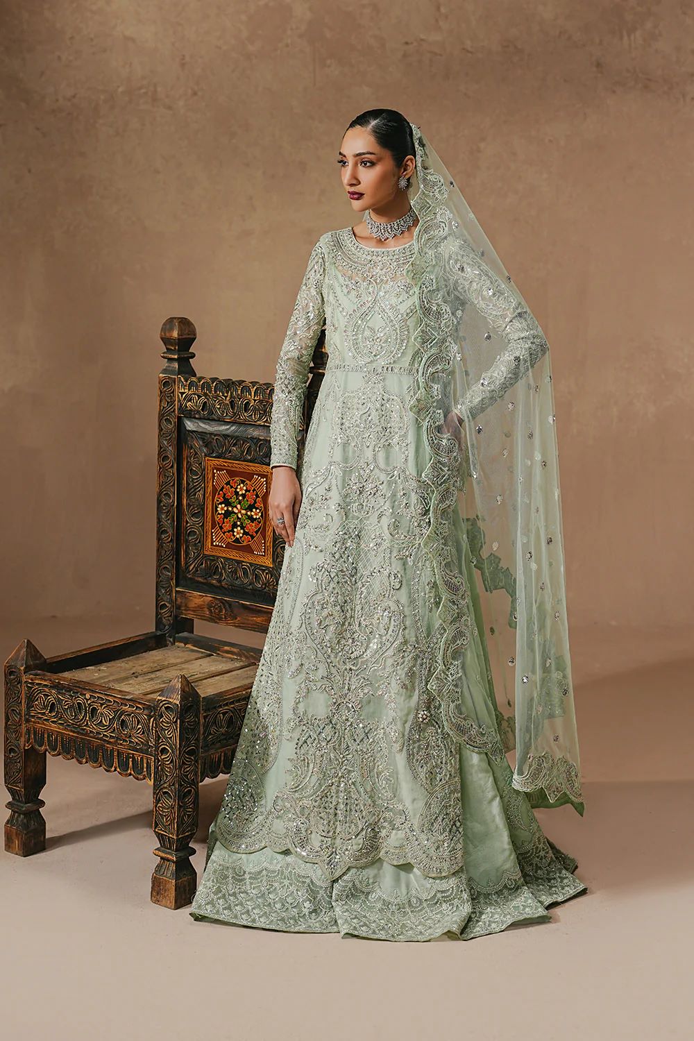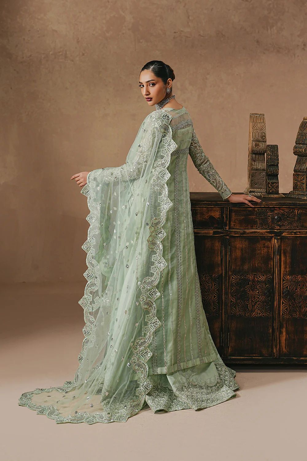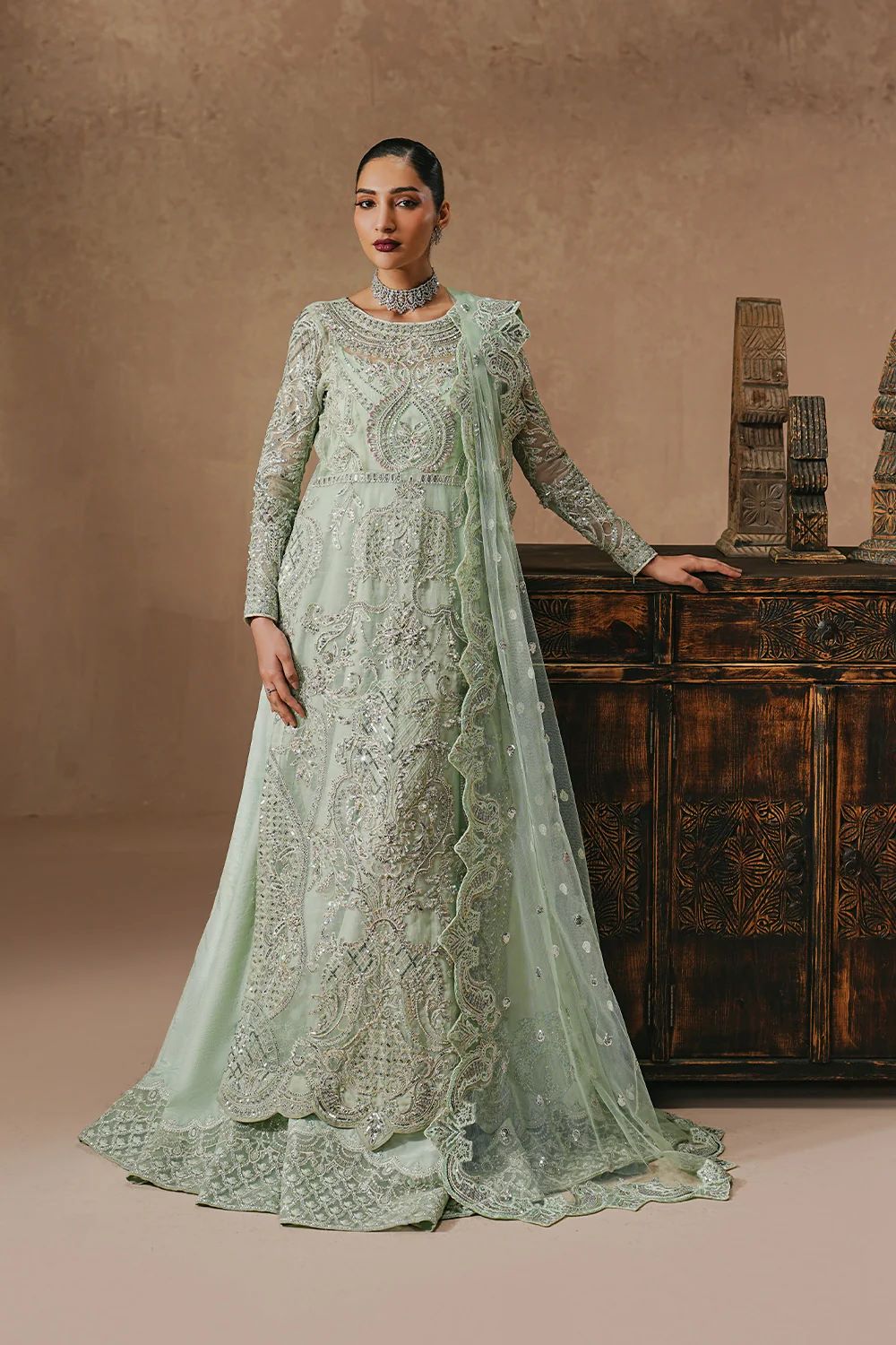 Drape yourself in effortless elegance with this Mint Blue 3-Piece Pret, designed to make a statement. The round-neck long organza shirt features graceful side openings and is lavishly adorned with intricate adda embroidery. Its fully embroidered fitted sleeves, finished with delicate piping at the cuffs, add a refined couture touch. Paired with a full-length grip lehenga, detailed with an exquisitely embroidered border along the hem. An under gown ensures a flawless, structured fall with every step. The look is elevated by a Bareeze net dupatta, showcasing all-over embroidered spray. Finished with four-side scalloped embroidered borders, this ensemble is pure festive luxury.