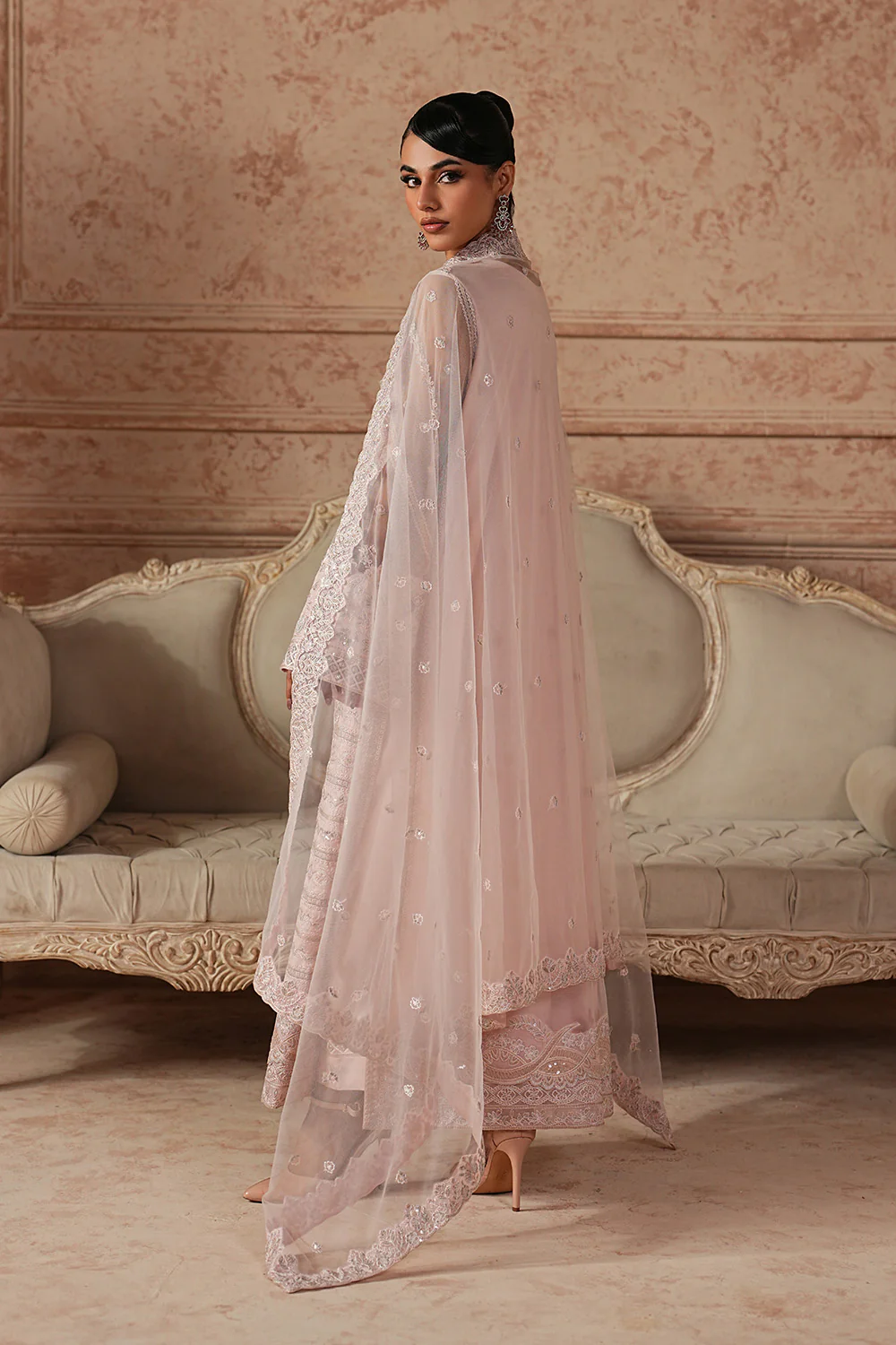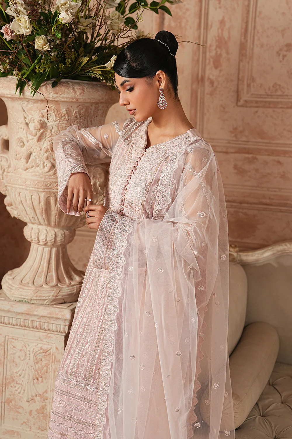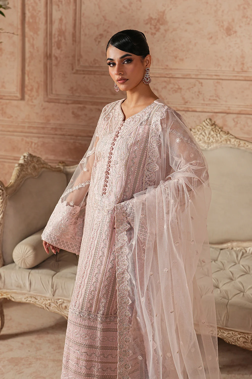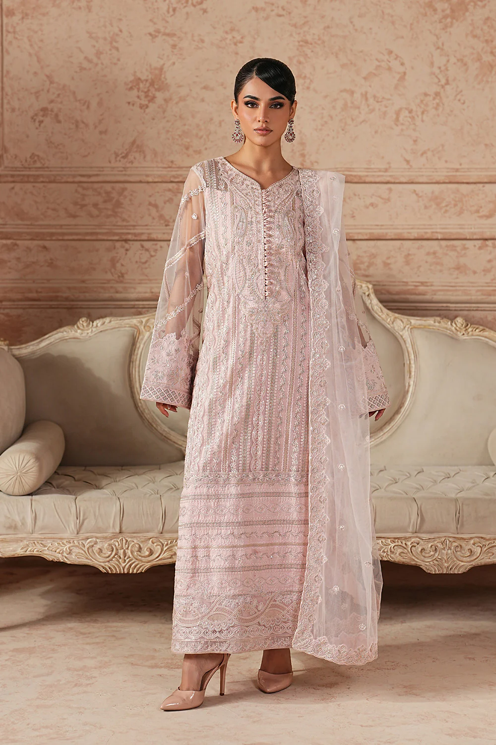 Step into timeless elegance with this enchanting Pink 3-piece pret, a perfect harmony of grace and sophistication. The Bareeze Net + Organza Silk shirt features an embroidered round neck with a delicate slit, finished with loops and embroidered buttons, while all-over striped embroidery and appliqué borders add refined charm. Embroidered sleeves and cuff borders pair beautifully with a fitted Grip trouser detailed with matching embroidery. Completing the look, the Bareeze Net dupatta is adorned with an all-over embroidery spray and four-sided embroidered borders for a truly luxe finish.