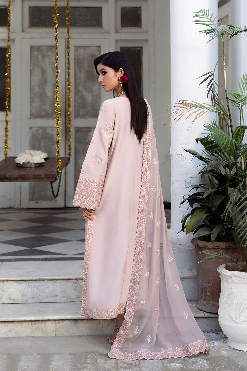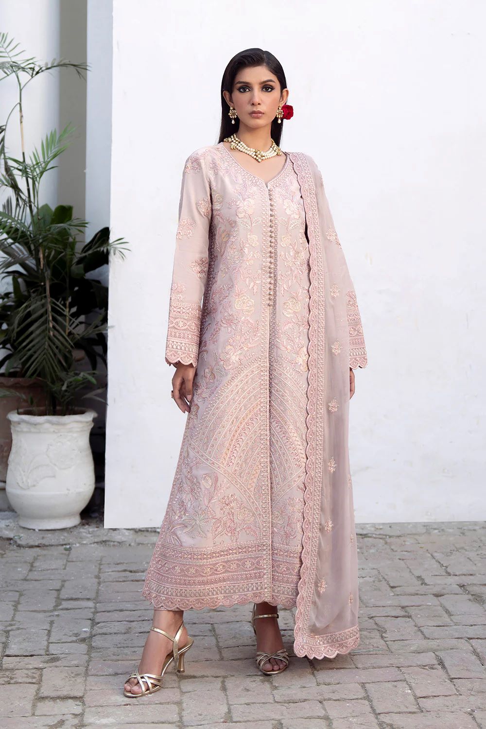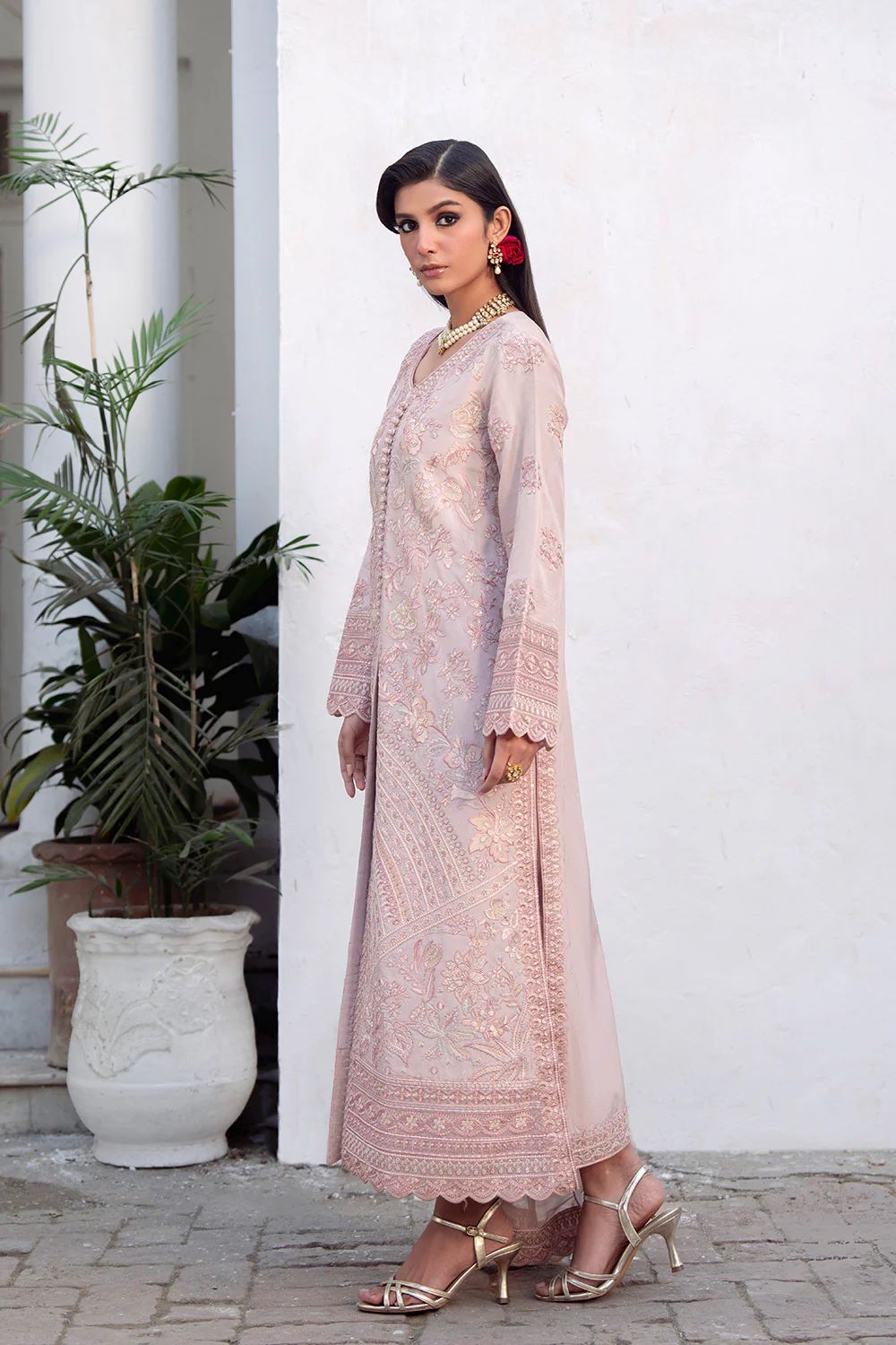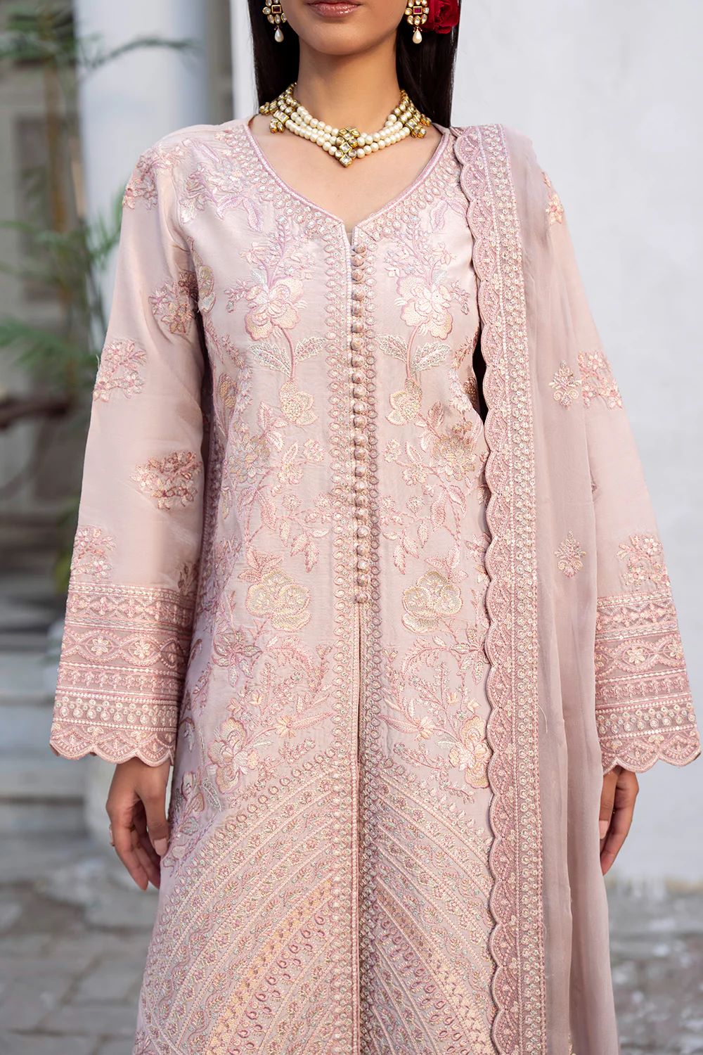 The straight-cut front open Silk Organza shirt is delicately closed with fabric loops and embroidered buttons for a refined finish. Fully embroidered panels are enhanced with graceful scalloped borders, adding depth and luxury to the design. Sleeves feature an elegant embroidered motif spray, beautifully finished with matching scalloped borders. Paired with a basic straight Silk Organza trouser and a chiffon dupatta, adorned with all-over embroidery spray and four-sided embroidered scalloped borders.